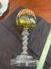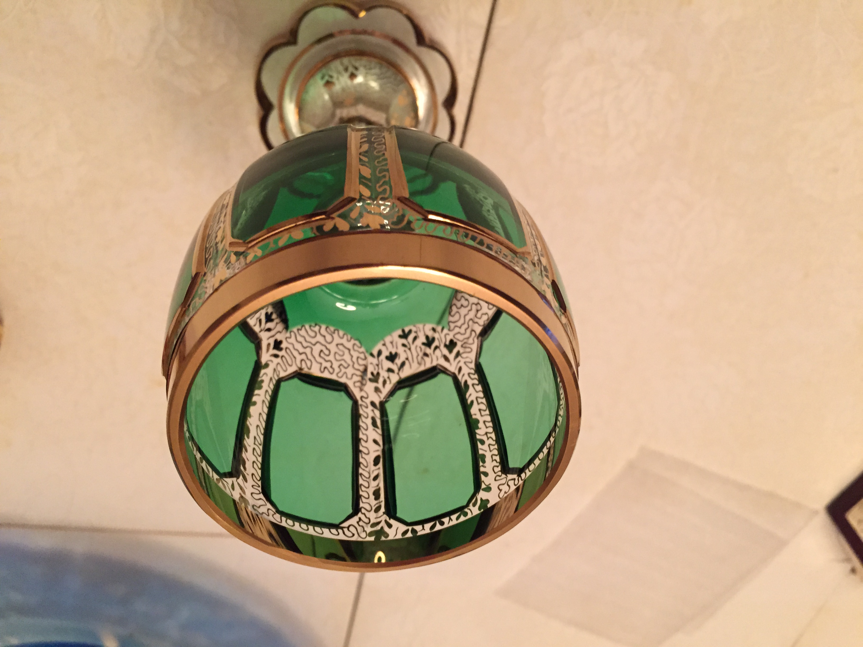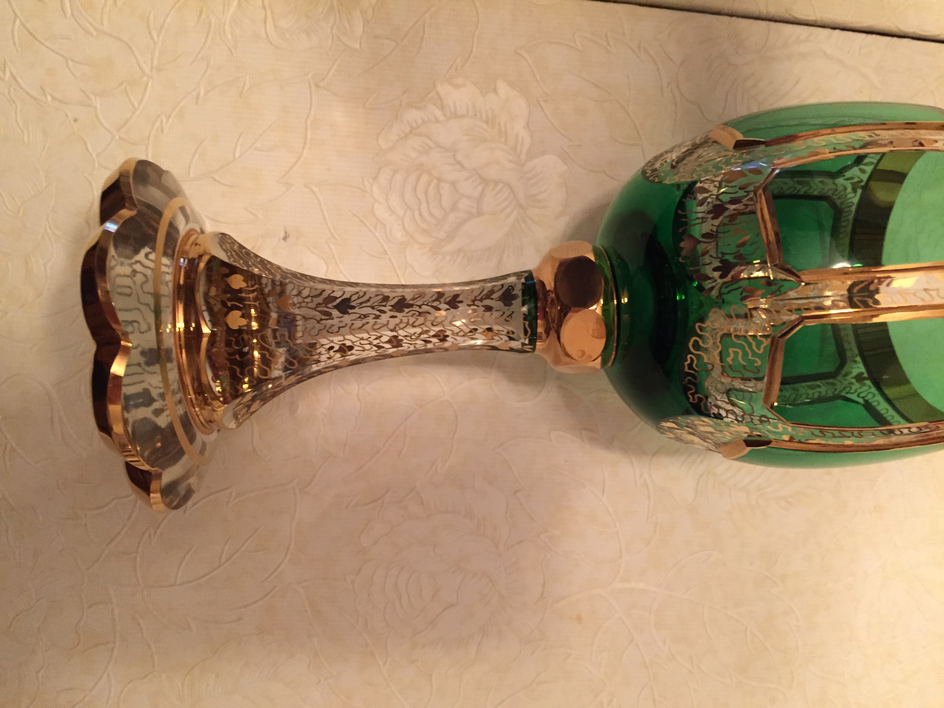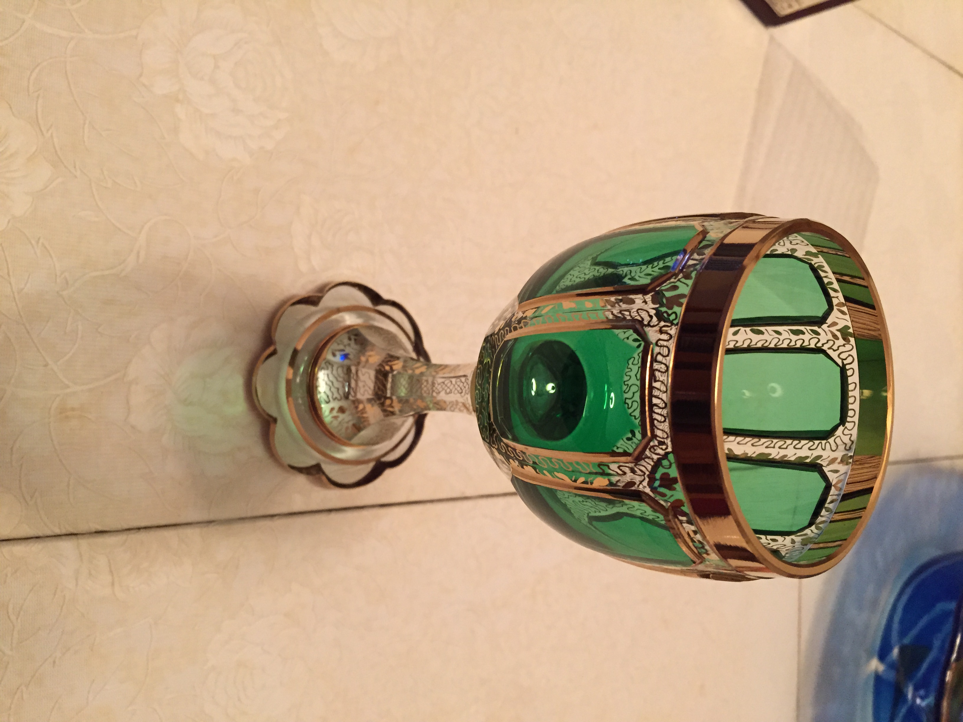 We inherited these glasses from my grandmother. They are very beautiful green glass goblets (set of 12) that are inlaid with gold. There is no signature/markings on any of the glasses. They are about 7 inches high with a diamter of about 3.5 inches.
