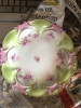 9" diameter plate with scalloped dark blue edging, green Iris design with lace gilt sponging overlay. Back is stamped with Cross swords with R. C. placed right and left of the swords, a crown at the center top of the swords and MONBIJOU at the bottom of the swords all in dark green lettering