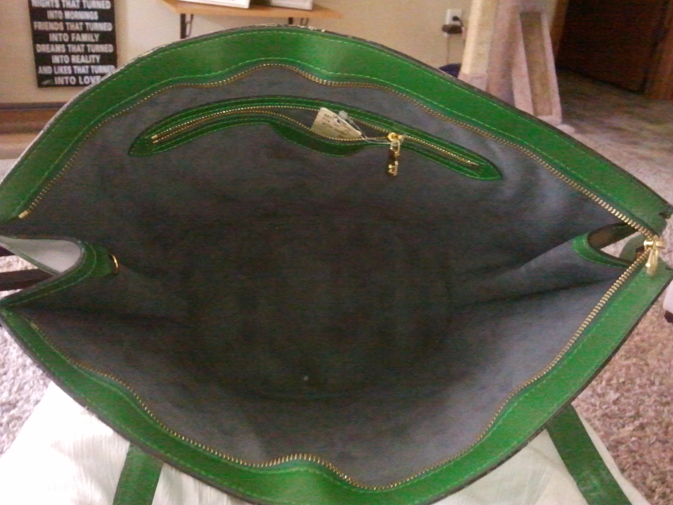 It's a grass green louis vuitton bag. Its 17 inches wide and 12 inches long. It's lined with a grey velvet. The price tag is still attached to the inside pocket. There is a gold zipper on top, and one on the inside pocket. On the bottom right corner louis vuitton logo and one on the zipper.