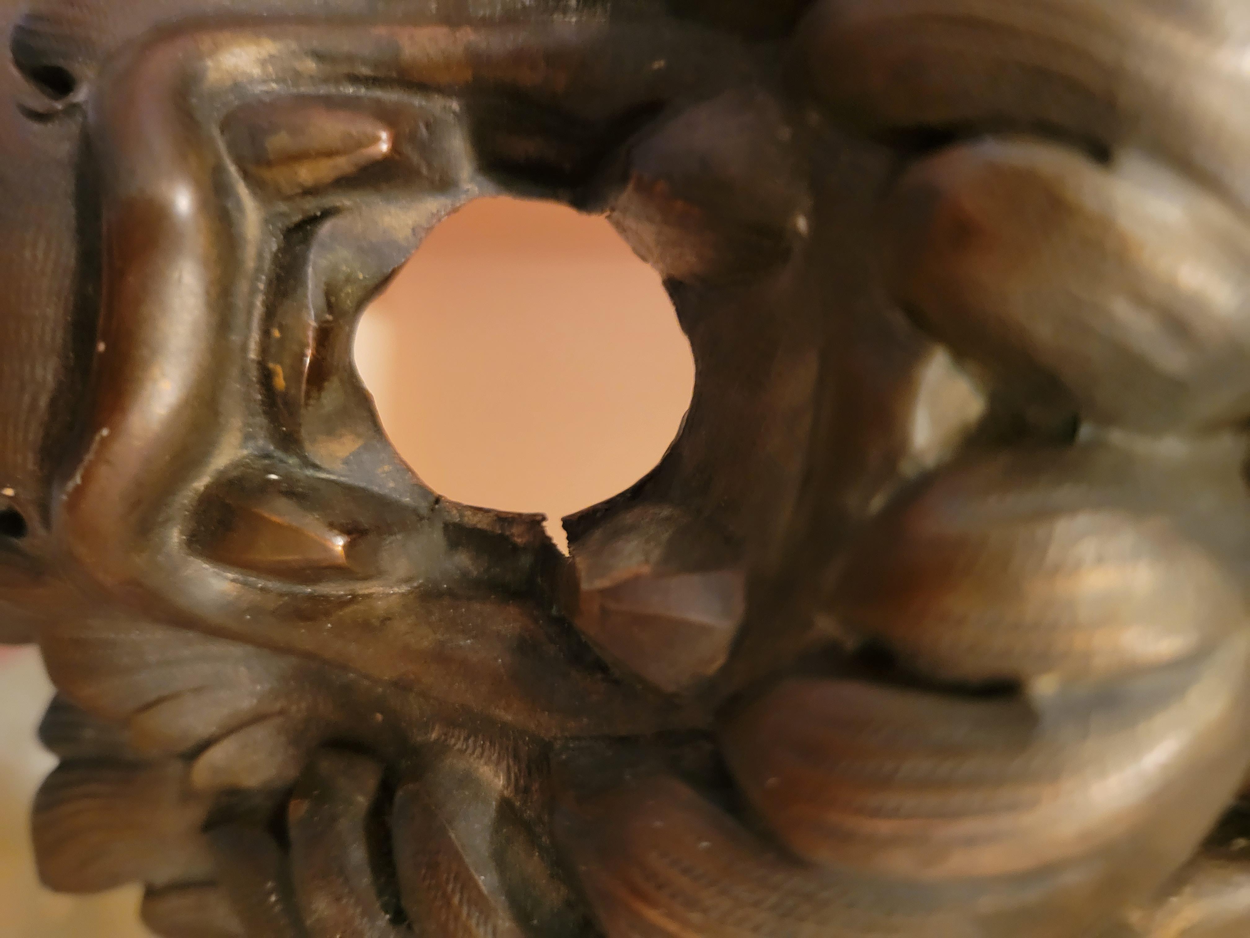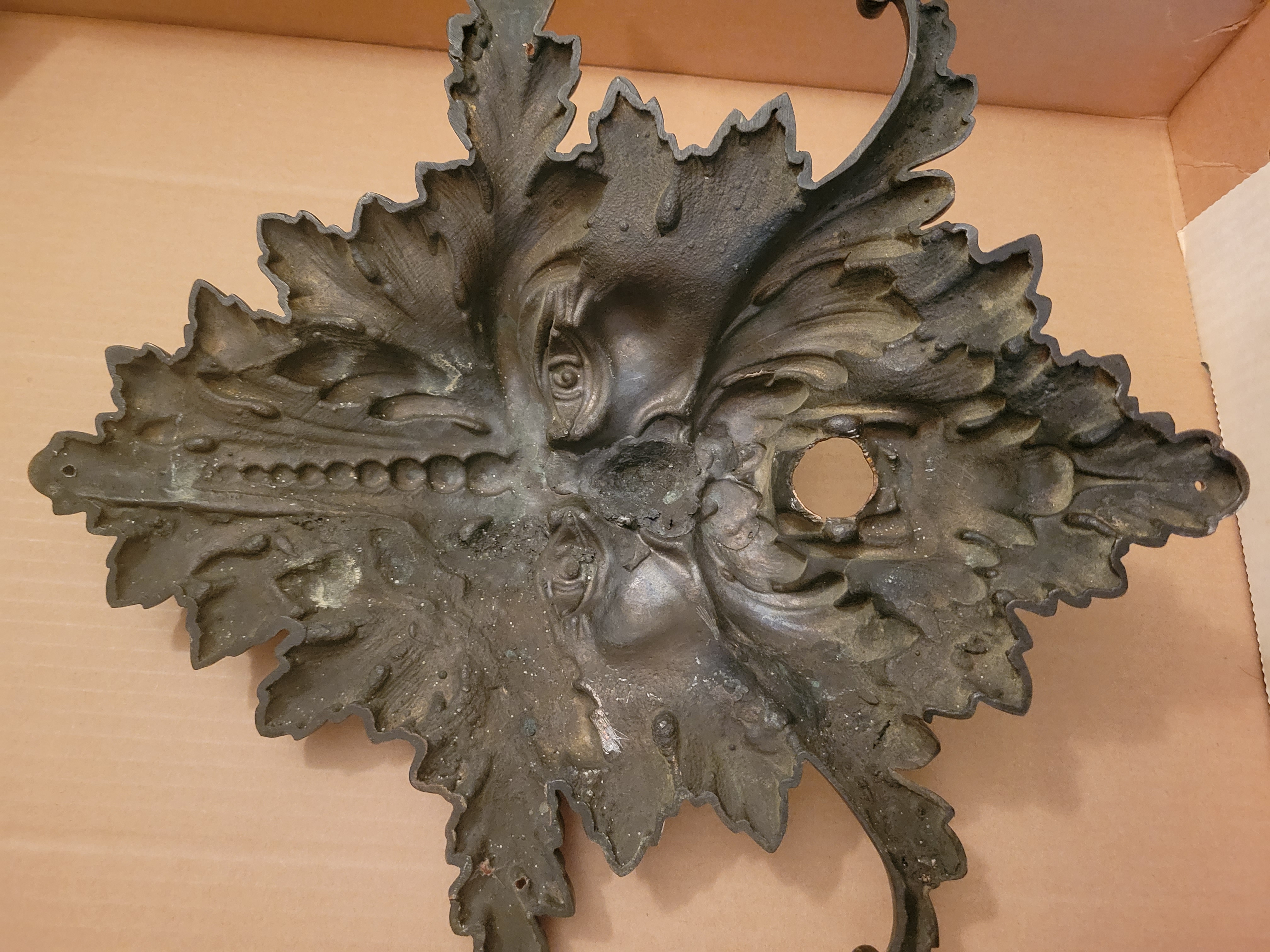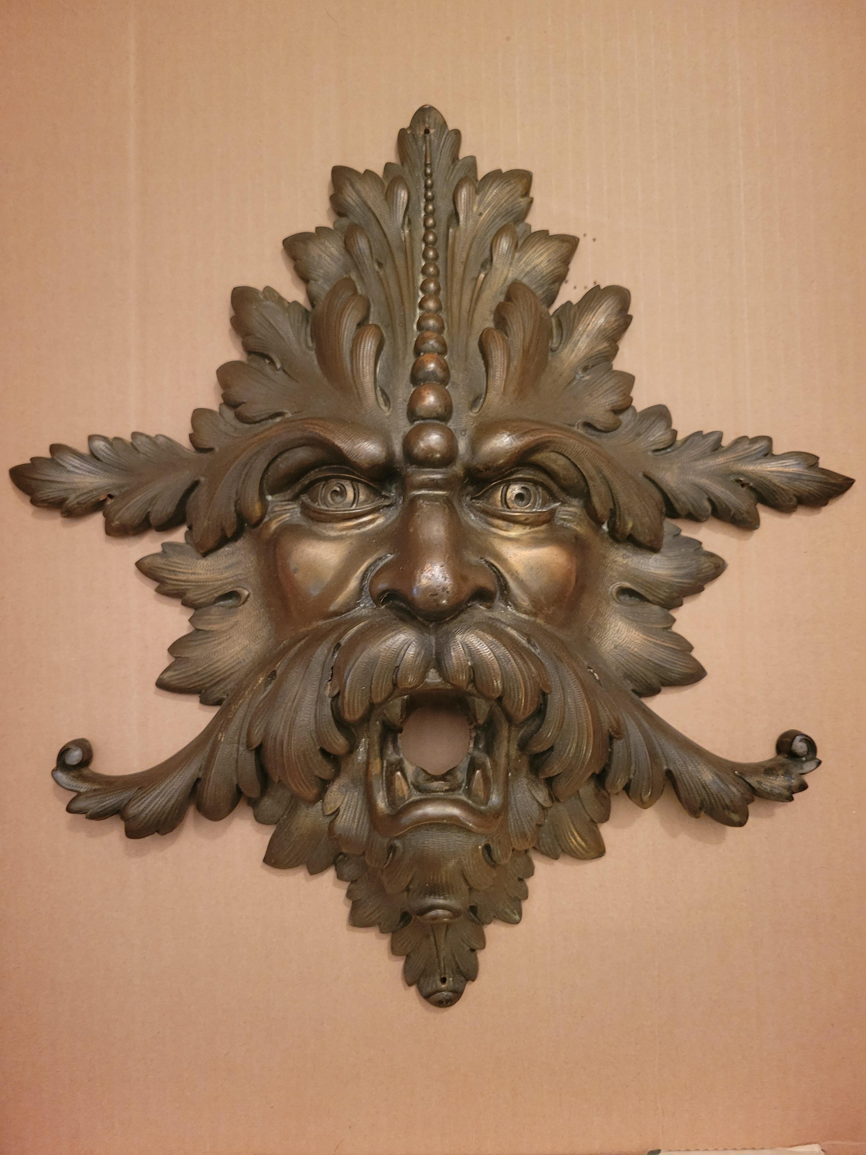 Originally mounted on a very nice mahoghany plaque, I used to think it was a fountainhead, however now I believe it was a very large doorknocker as there are squared notches on each side of his mouth.