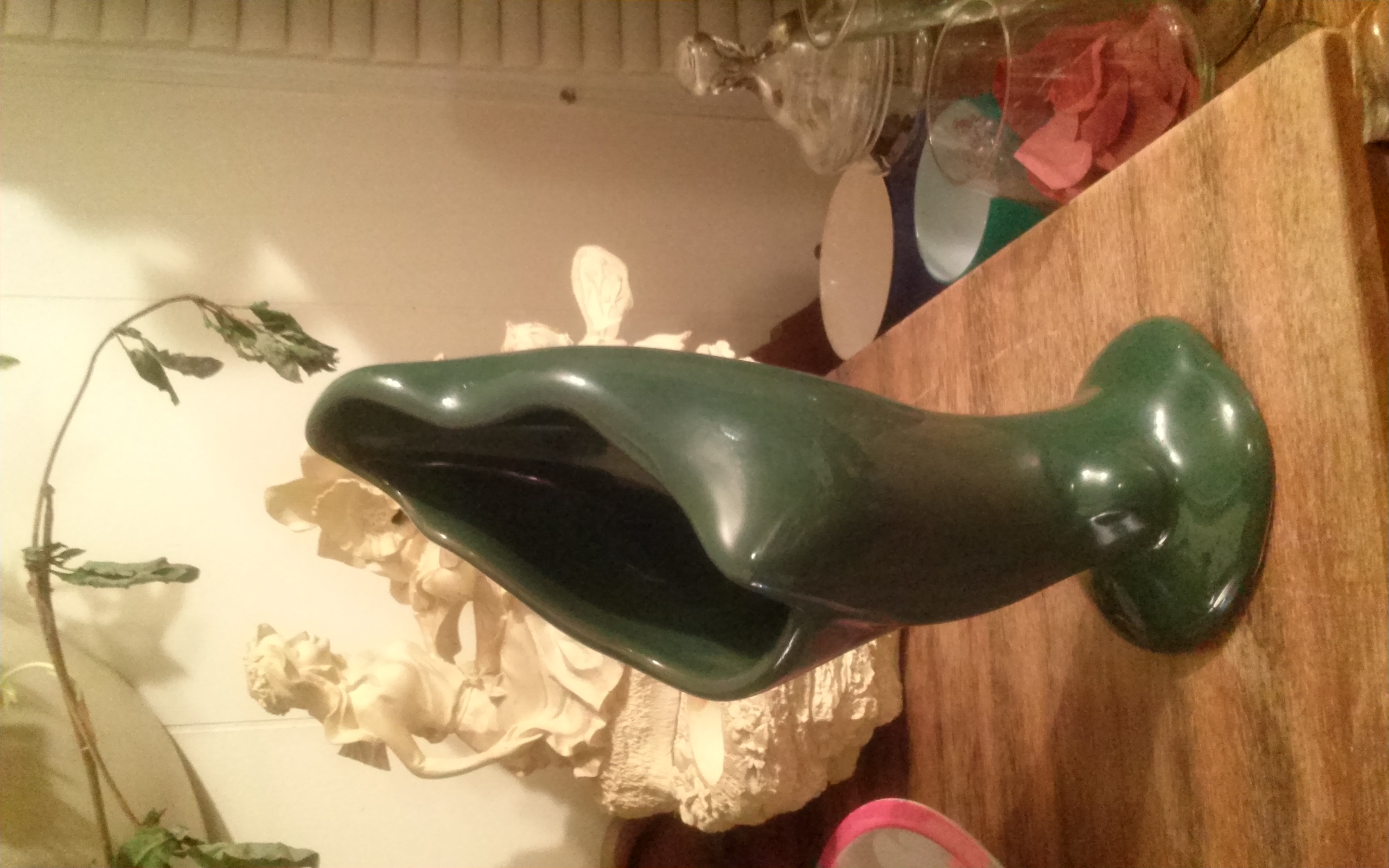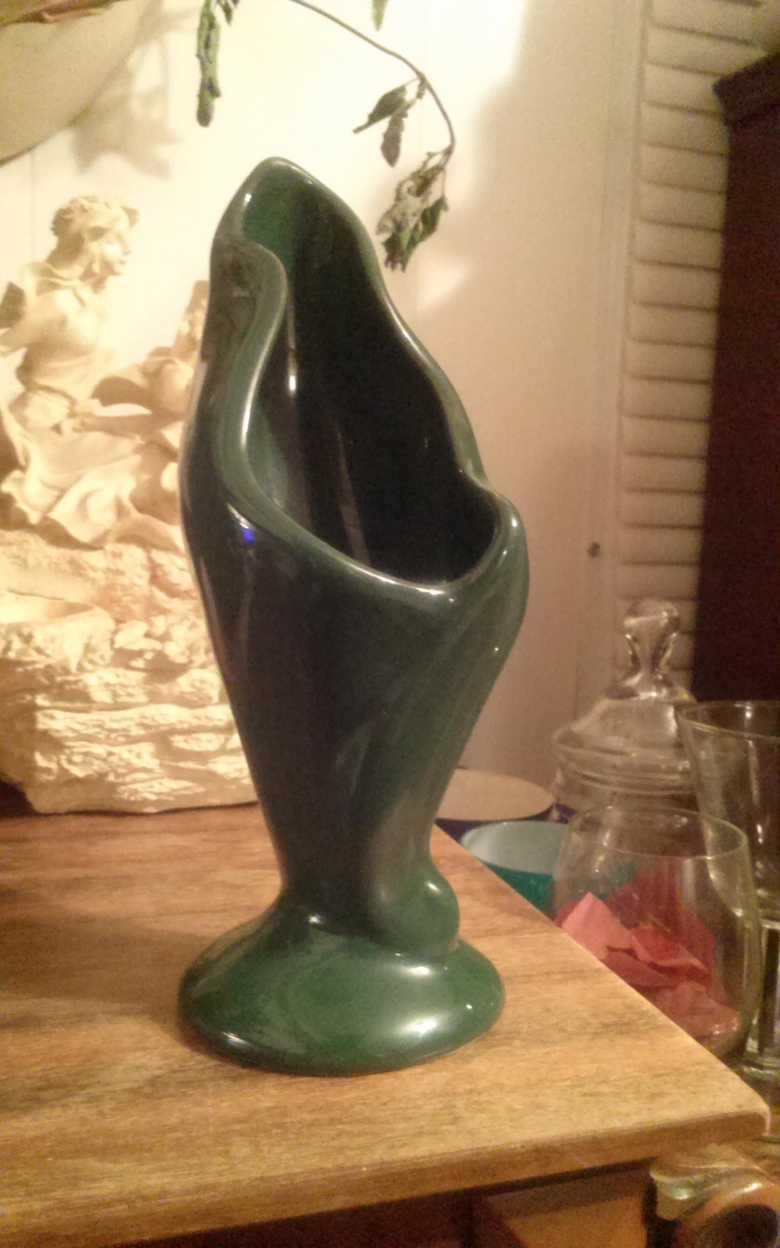Very unusual deep green leaf type vase in very good condition no chips in paint no markings on vase.