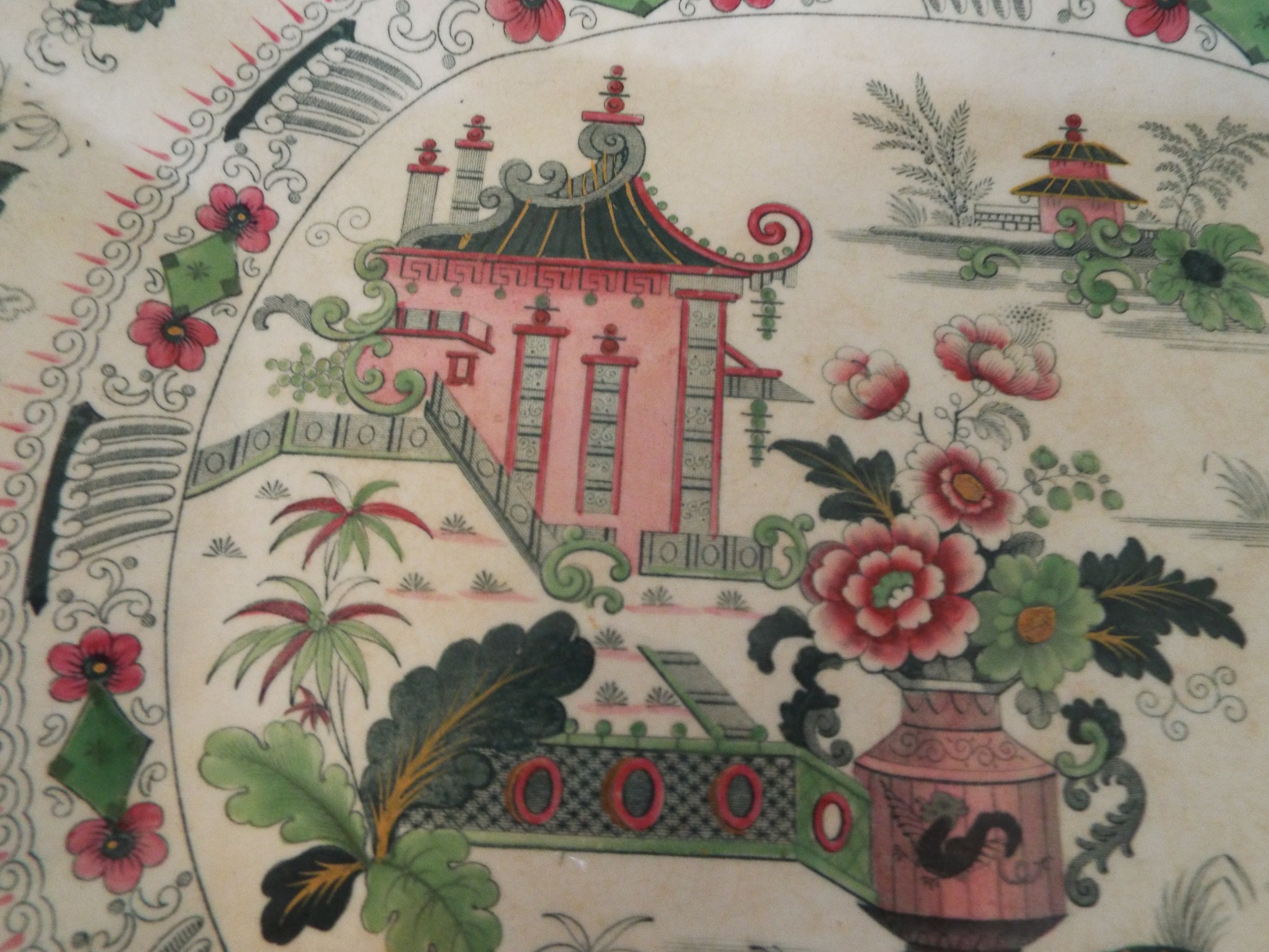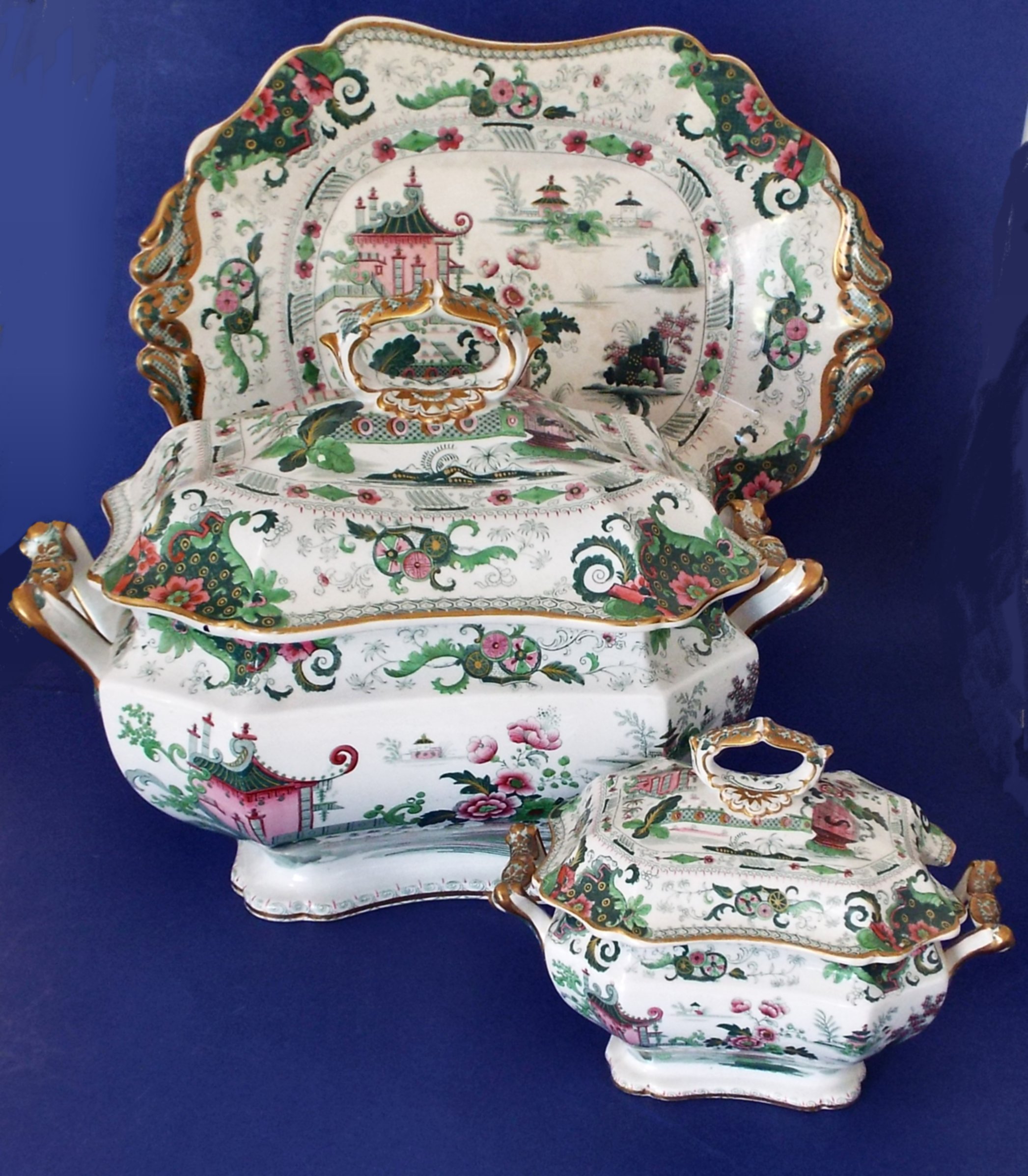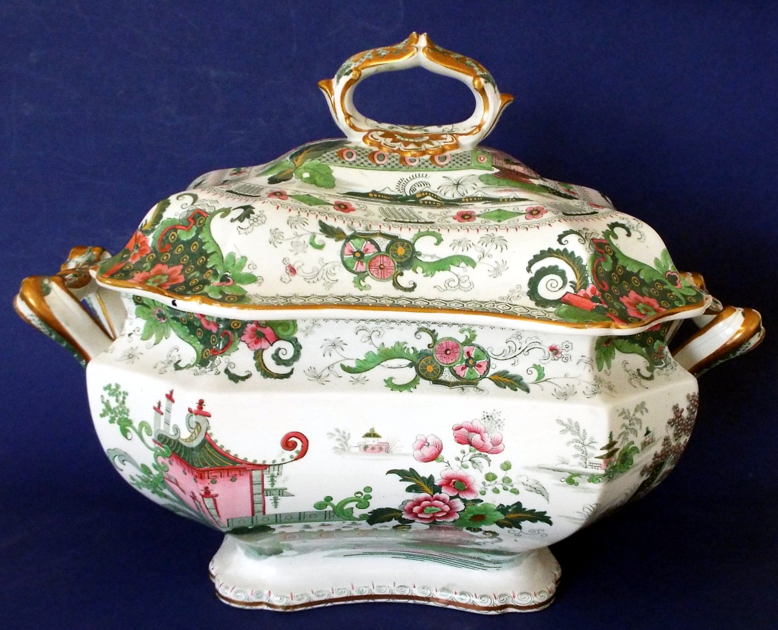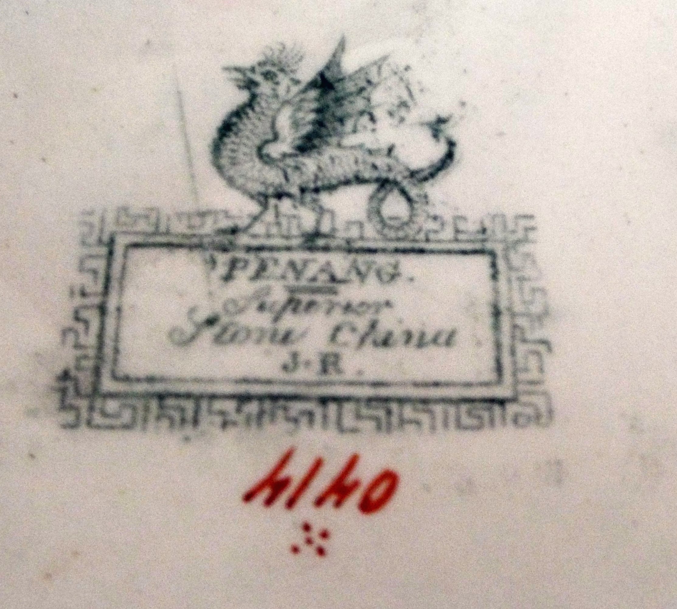 I purchased these tureens and platter at an Estate Sale. I have researched to no avail. I thought perhaps they were made by J. Ridgway but I can't find a Ridgway marking that matches. The soup tureen is marked on the bottom with a trademark of a decorative banner or rectangle with a ornate lion./dragon ? standing on top. Inside the rectangle it states, "Penang, Superior Stone China". Below the rectangle are the initials "J.R". The main color are green and a mauve rose pink with a white background. All of the other matching pieces are only numbered on the bottom. There is an old letter inside the Tureen from the owner that was addressed to an individual that she was giving the dishes to. In the letter she mentioned that these were antique and that she had only seen these dishes in a museum in Boston and that they were very old. They are heavy! Any information would be appreciated.