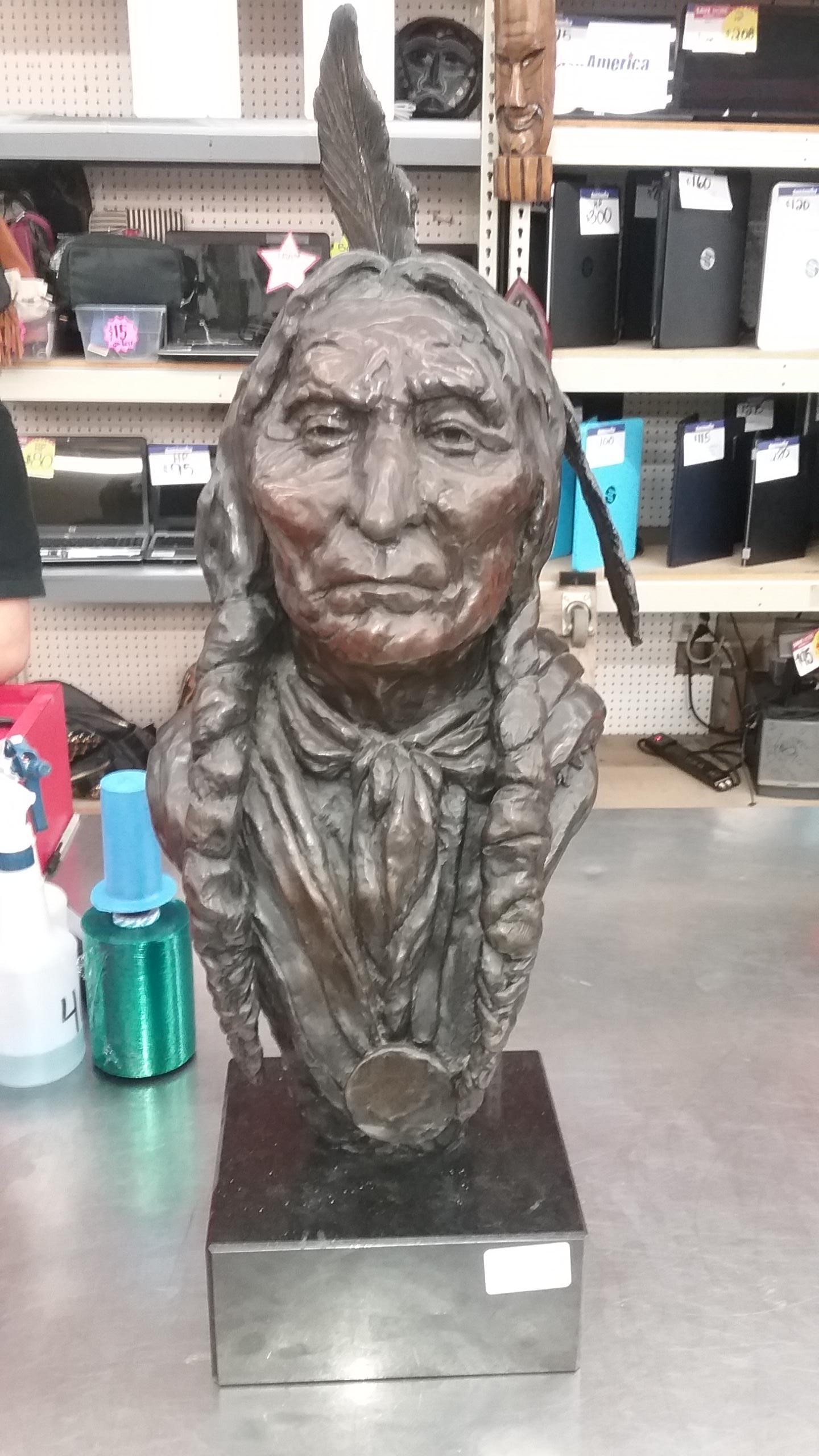 Opportunity to purchase a bronze bust of an Indian. Griffin Chiles published a book on the sculptures. I could only find 1 example of another bust on display at a post office owned by ALDWELL ARTS COUNCIL. The artist donated all of the private collection to Christopher Newport University in Newport News, Virginia.