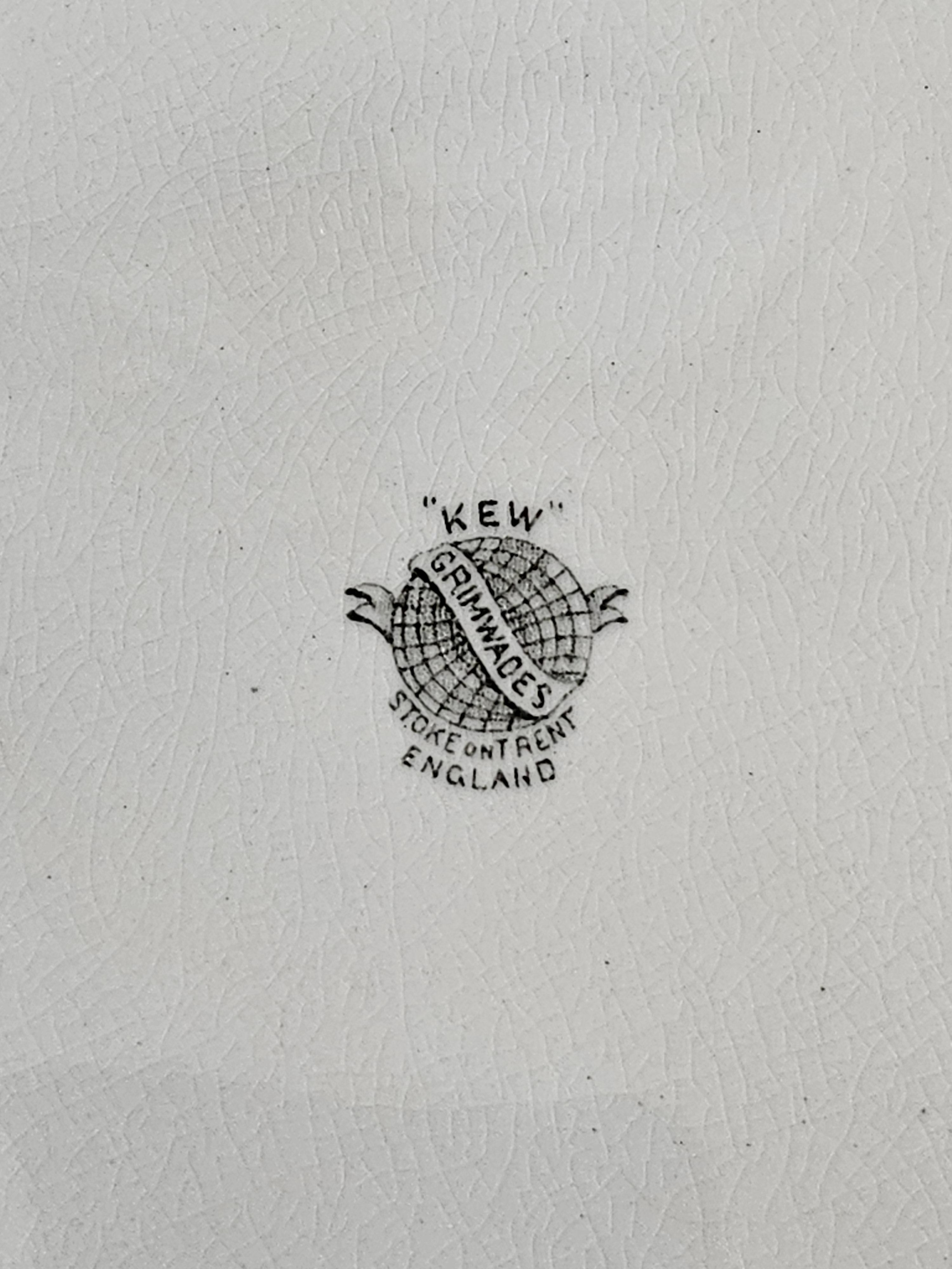 I have a Grimwades Stoke on Trent porcelain oval platter. It is called "Kew" on the underside. I estimate it is 60-70 years old. It is in very good condition with no chips or cracks. However it does have some staining and crazing in the glaze.