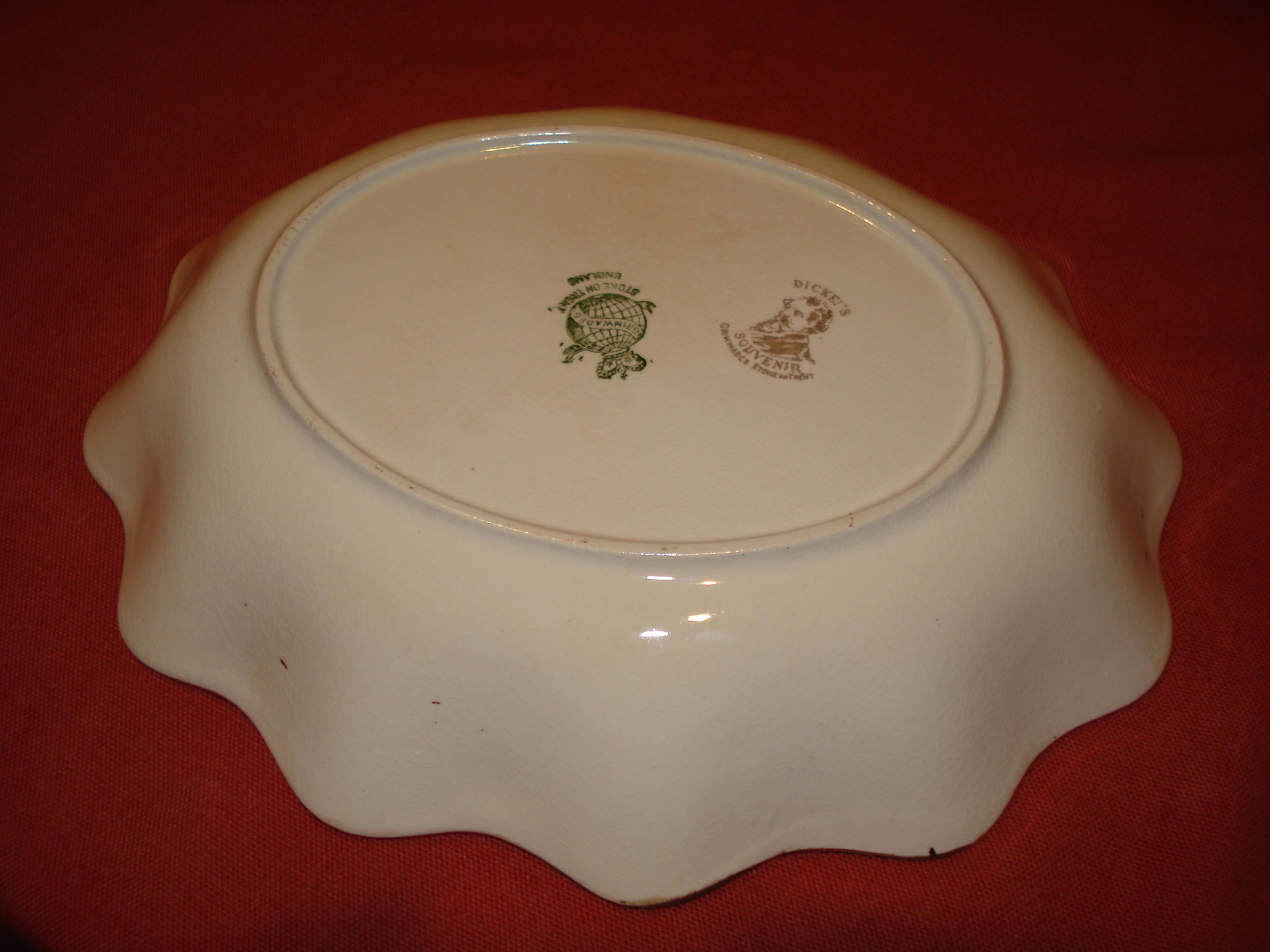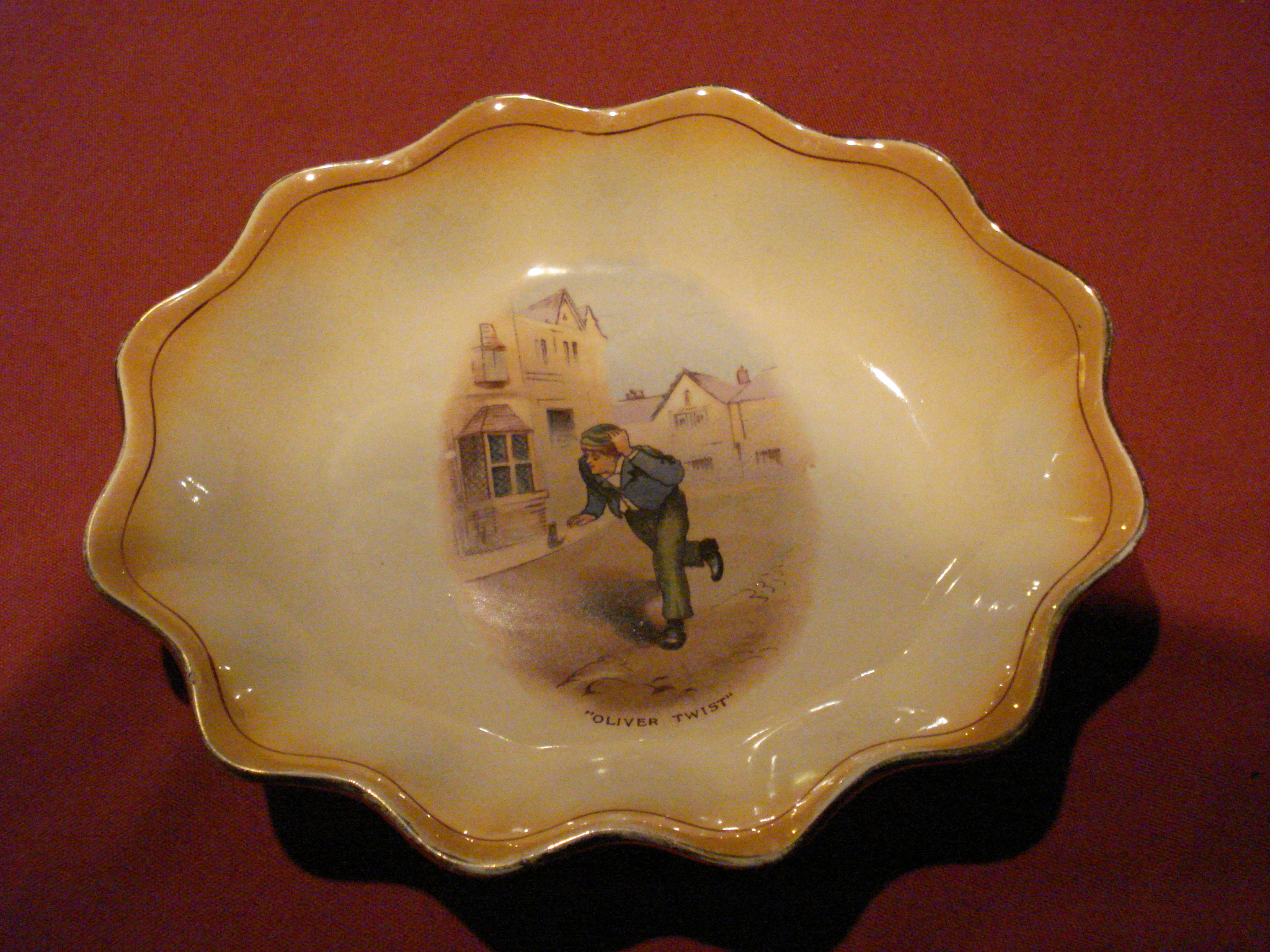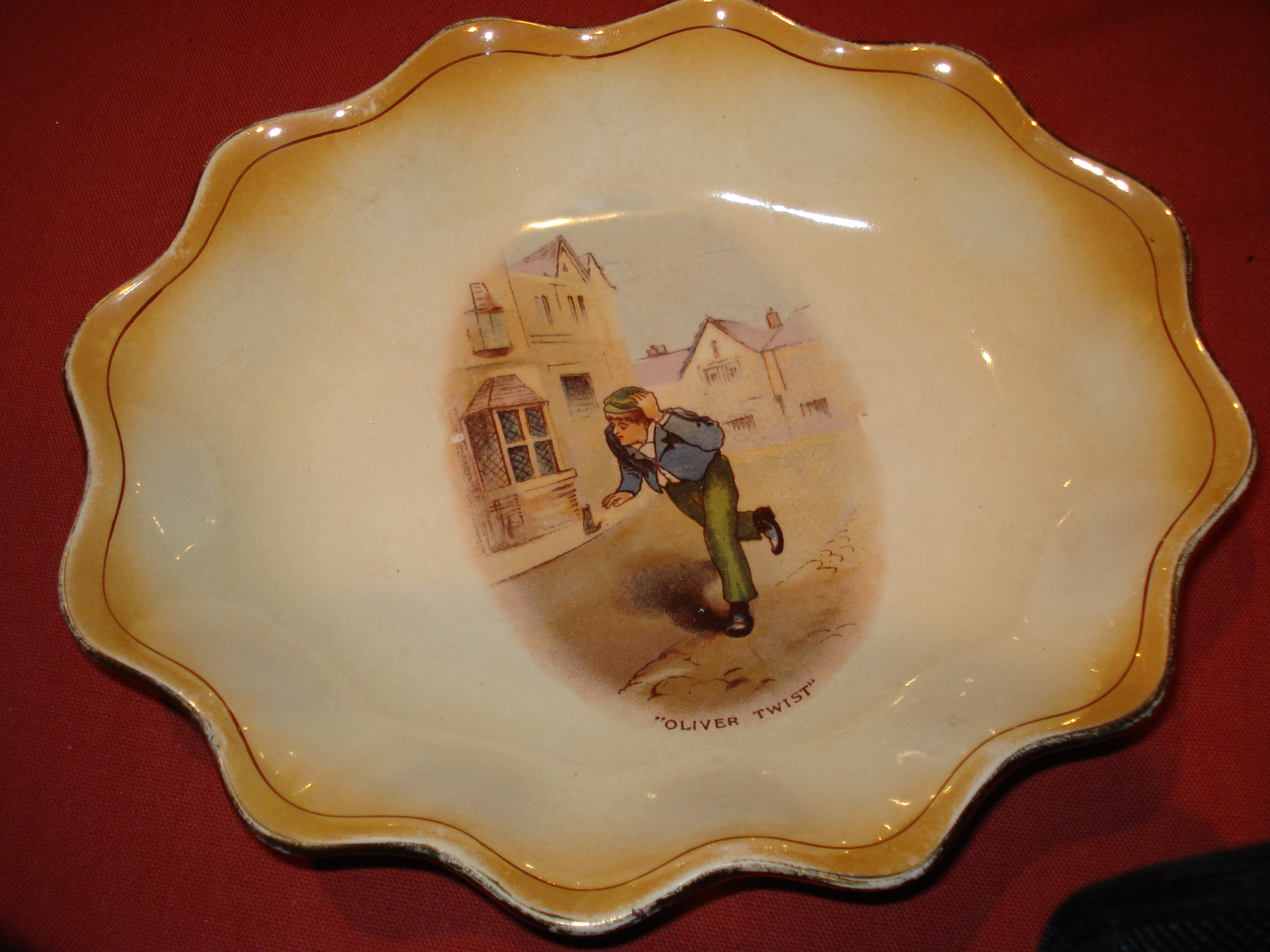 bowl/plate with a picture of Oliver twist made by grimwades stoke on trent has dickens souvenir written on the bottom