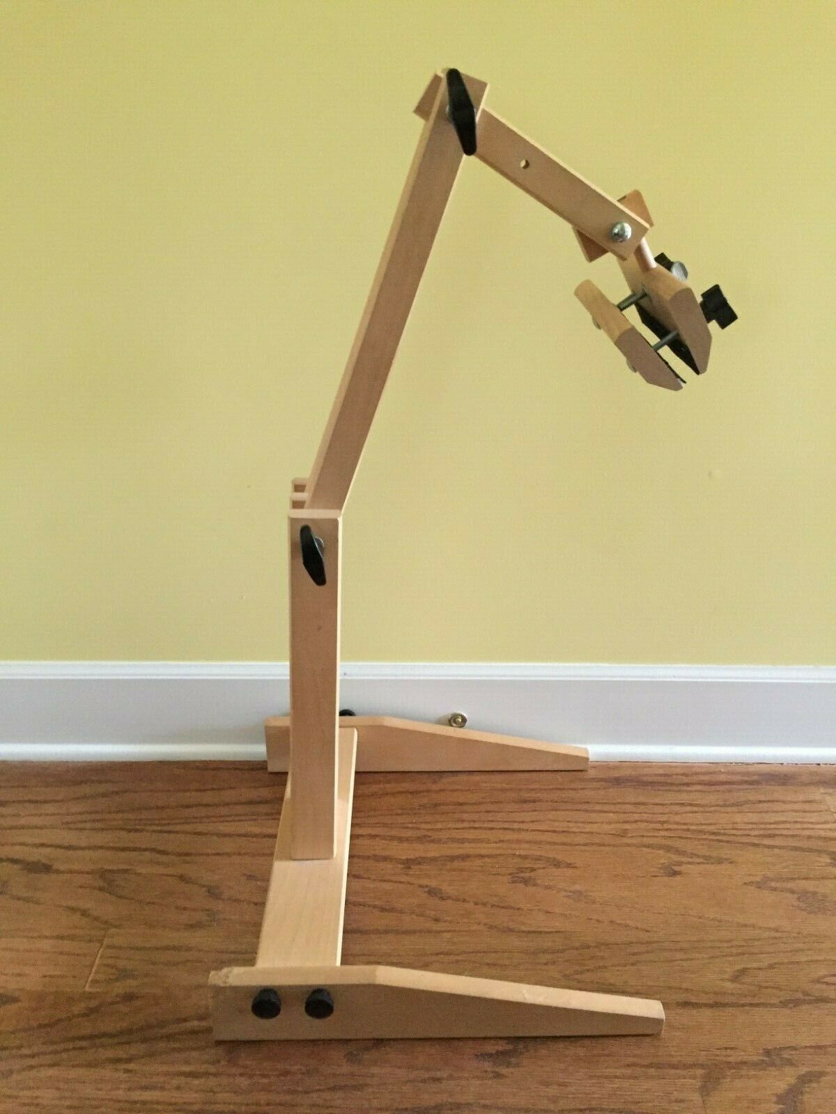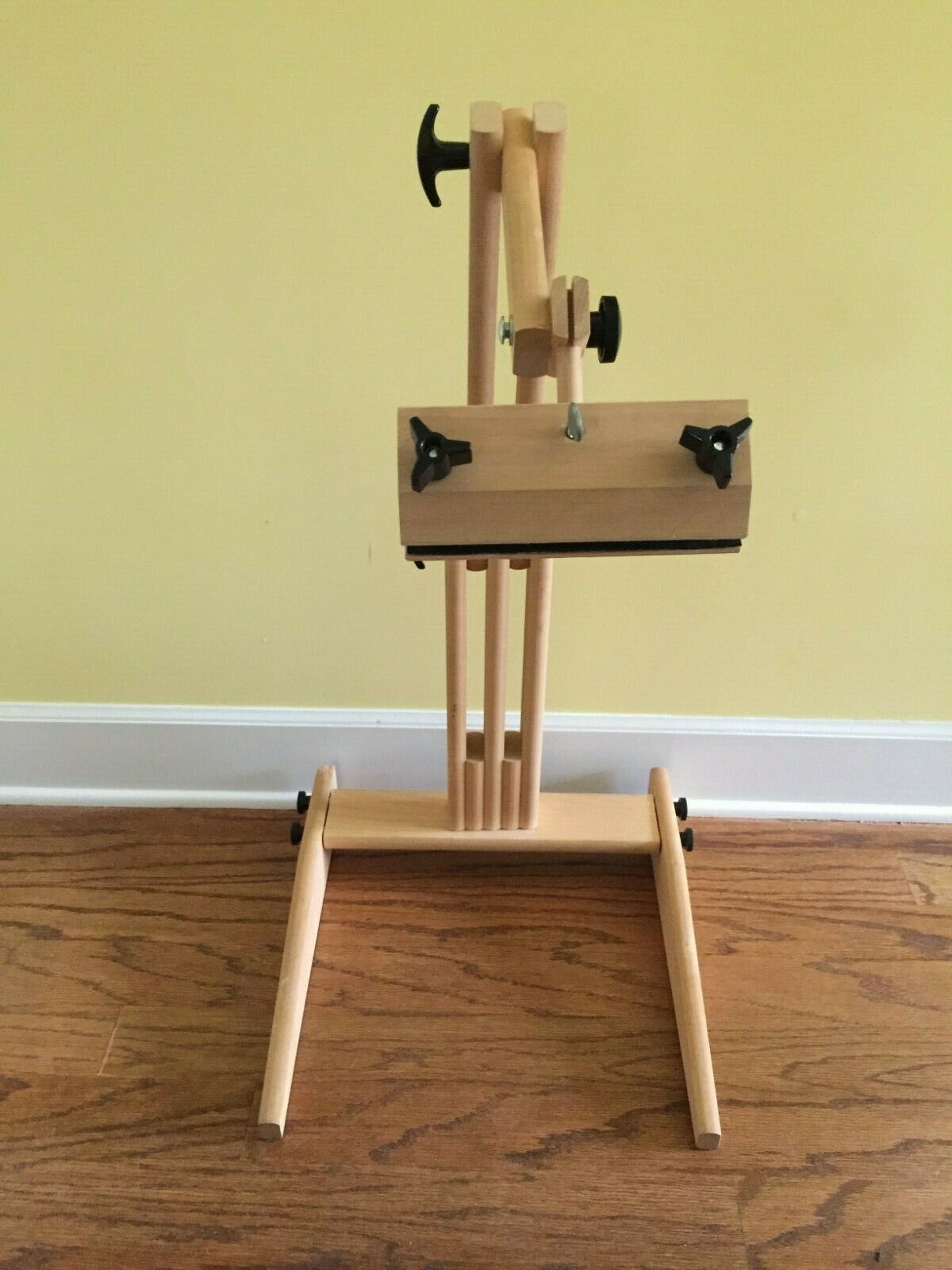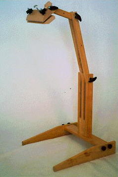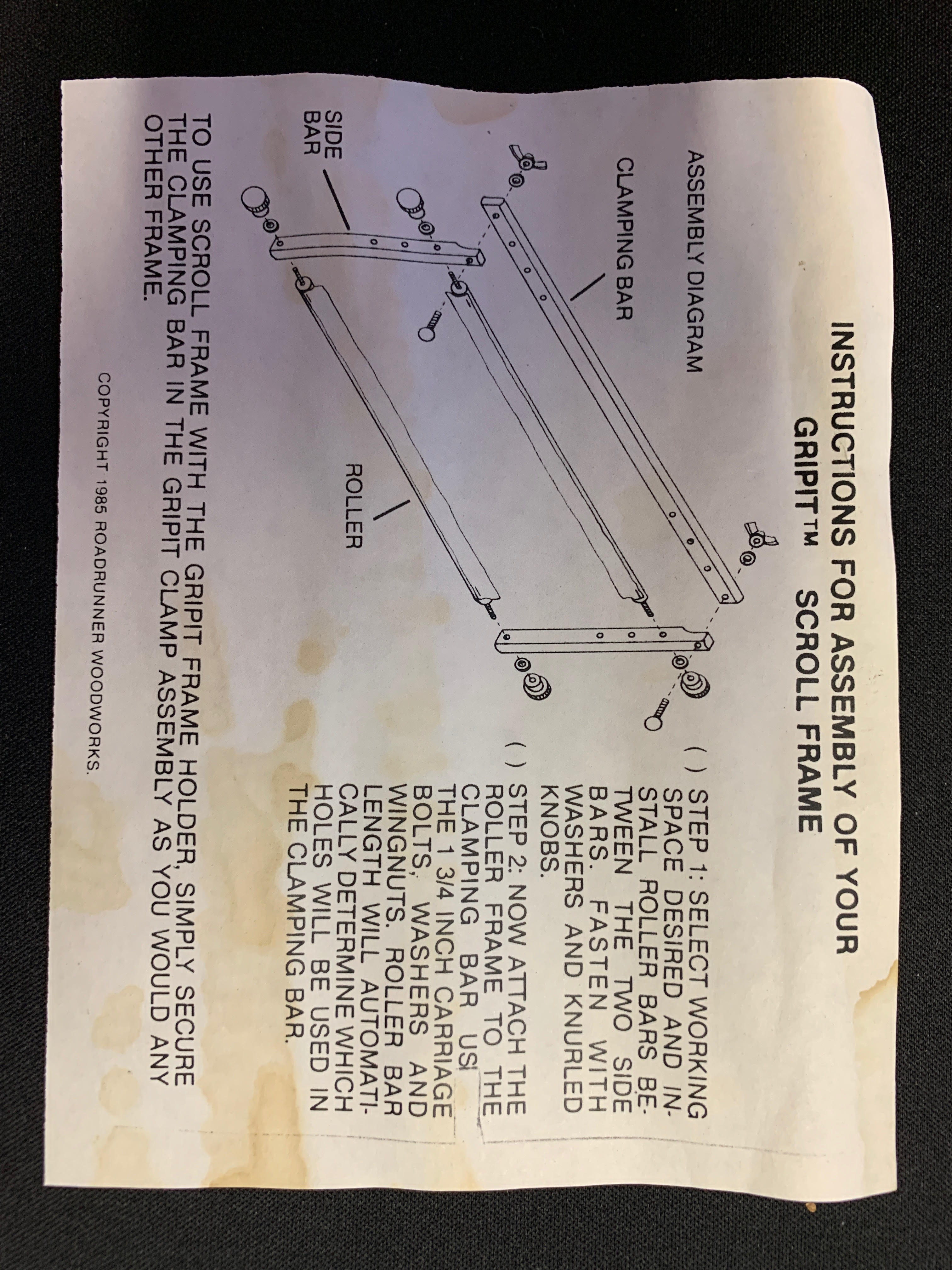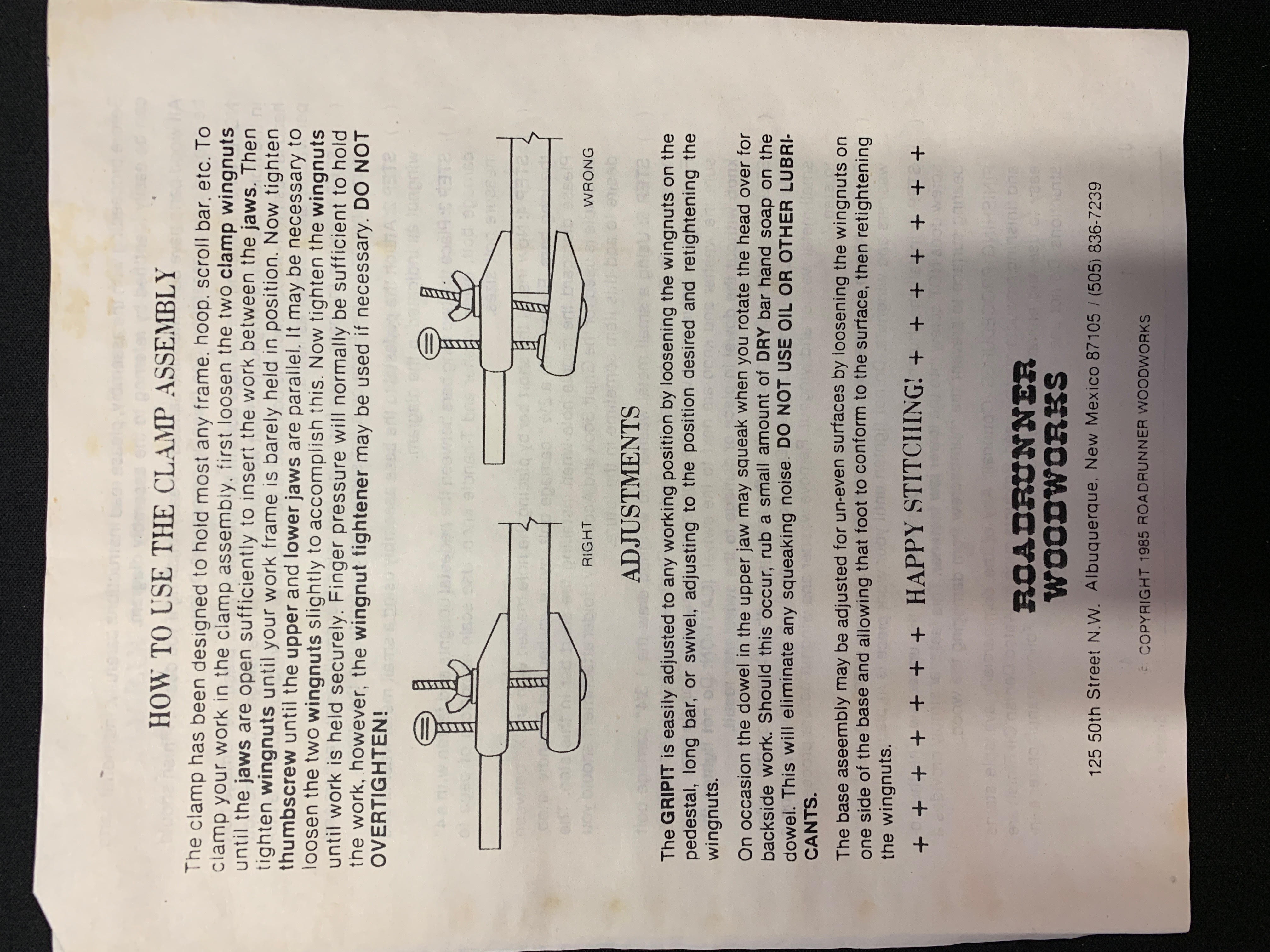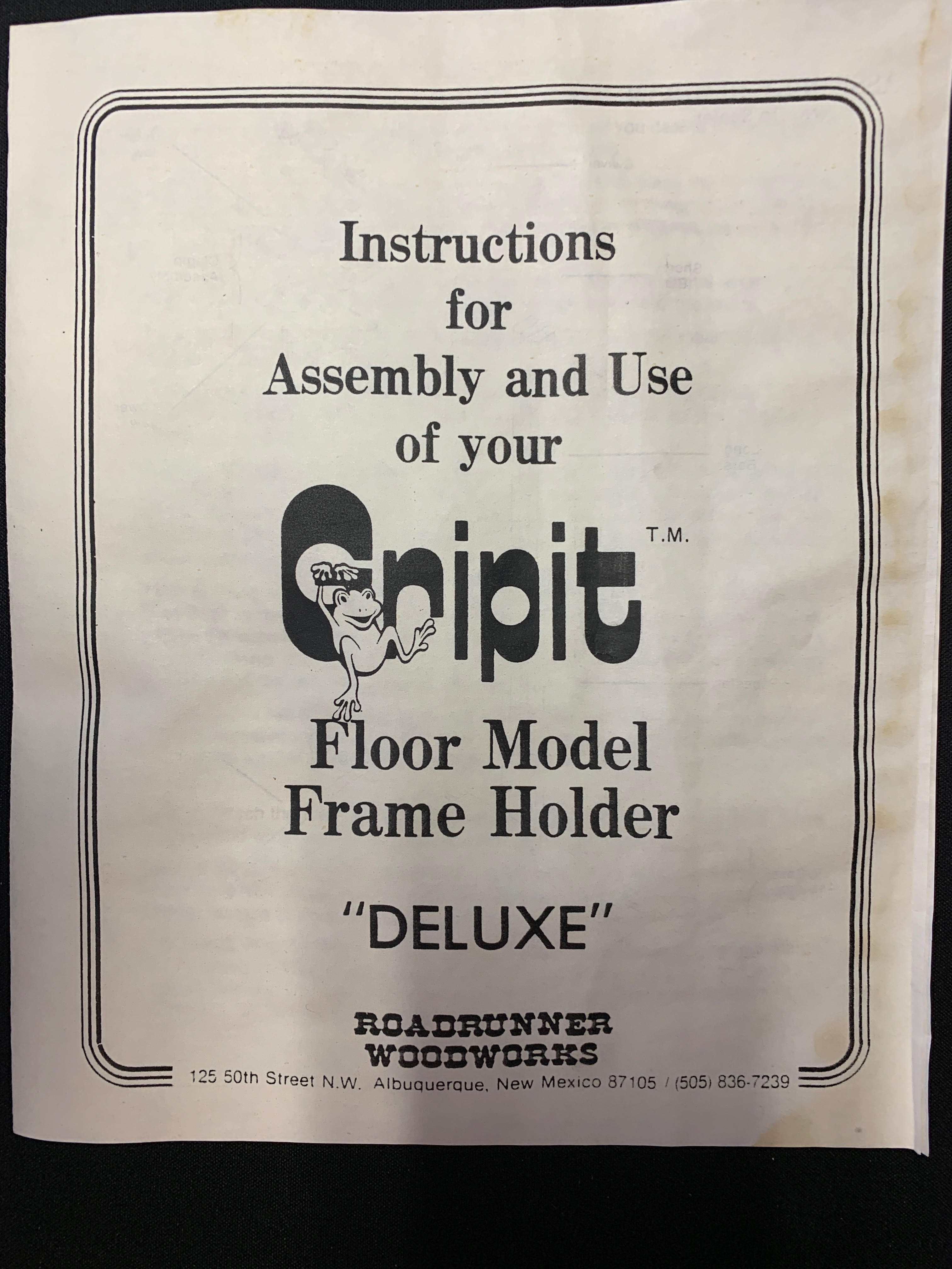 Gripit Floor Model Frame Holder "Deluxe"; Roadrunner Woodworks; 125 50th Street N.W. Albuquerque, New Mexico 87105. Copyright 1985 Roadrunner Woodworks. Includes one pair 22" long roller bars, side bars, easy tightening knobs and unique clamping bar which eliminates having to clamp directly over your fabric. Adjusts for 5", 7" or 9" work space between rollers.