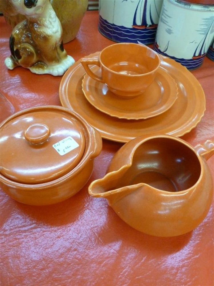 "Group of unmarked orange potter pieces (Red Wing?) including 9.25" and 6" plates, coffee cup, and cream/covered sugar set"