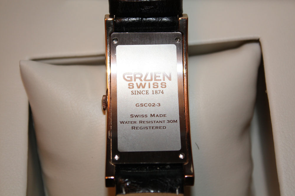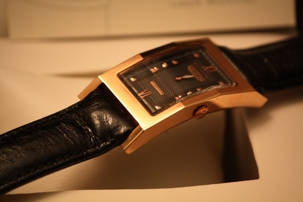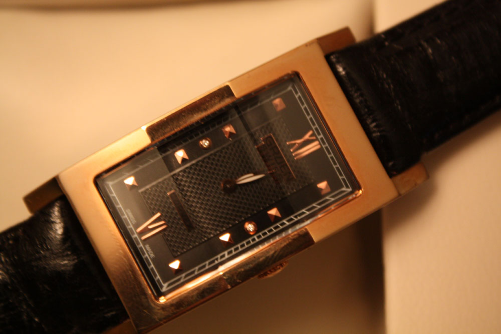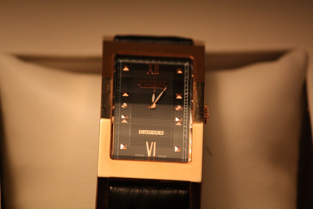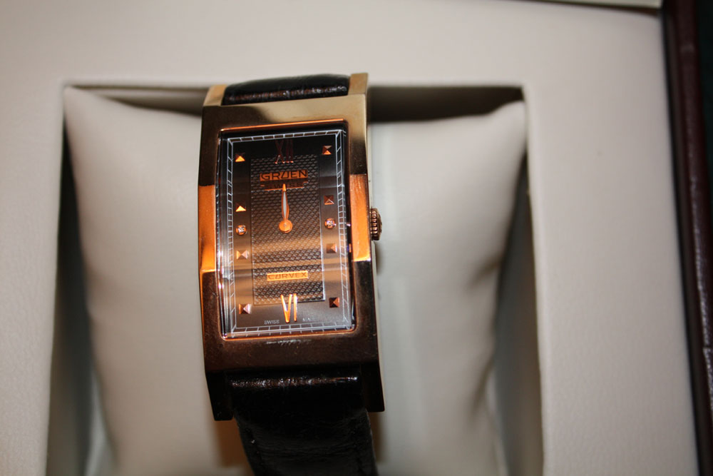 The watch features roman numerals and a shiny metal, I believe it to be Rose Gold,