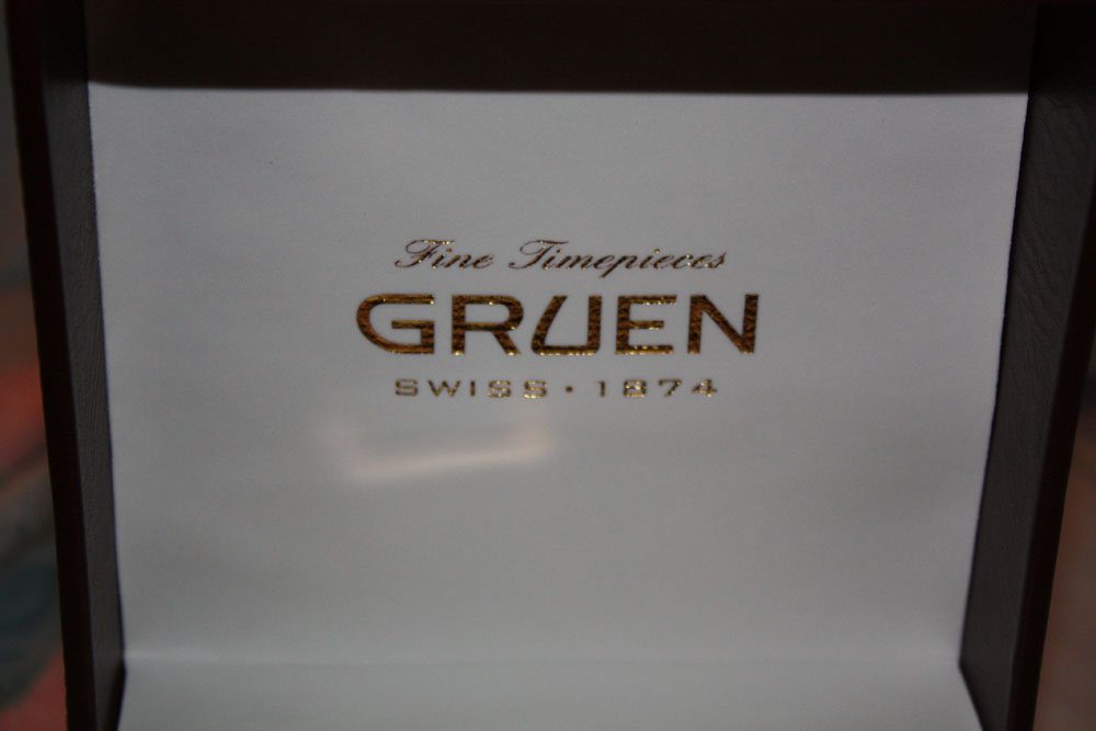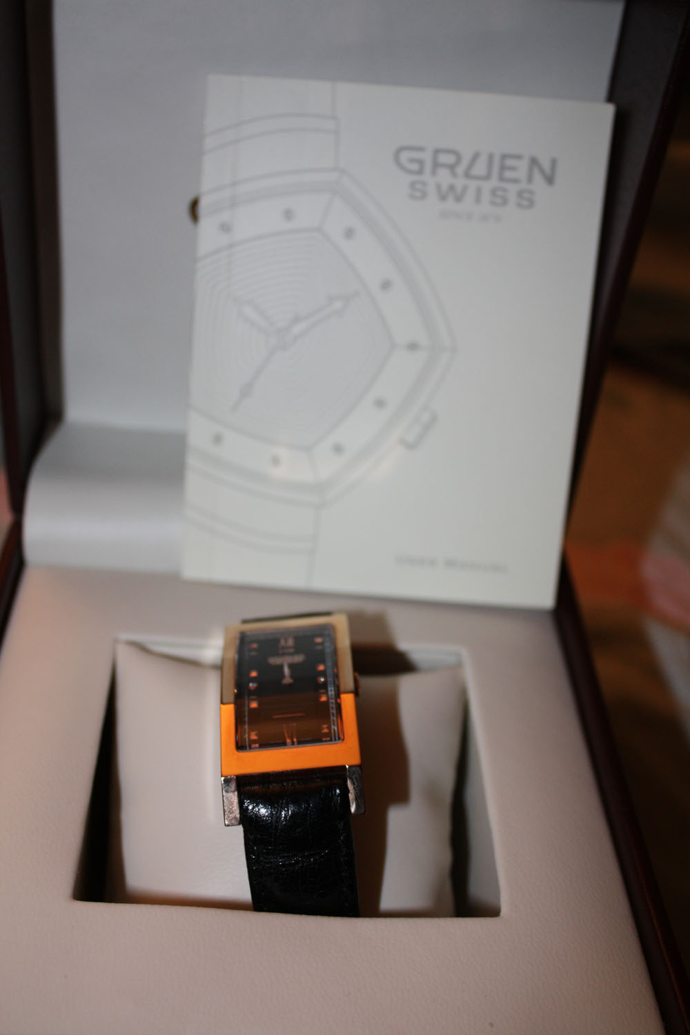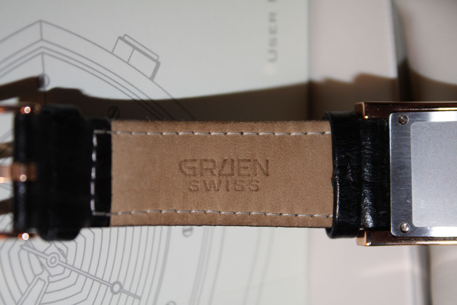 The watch features roman numerals and a shiny metal, I believe it to be Rose Gold,