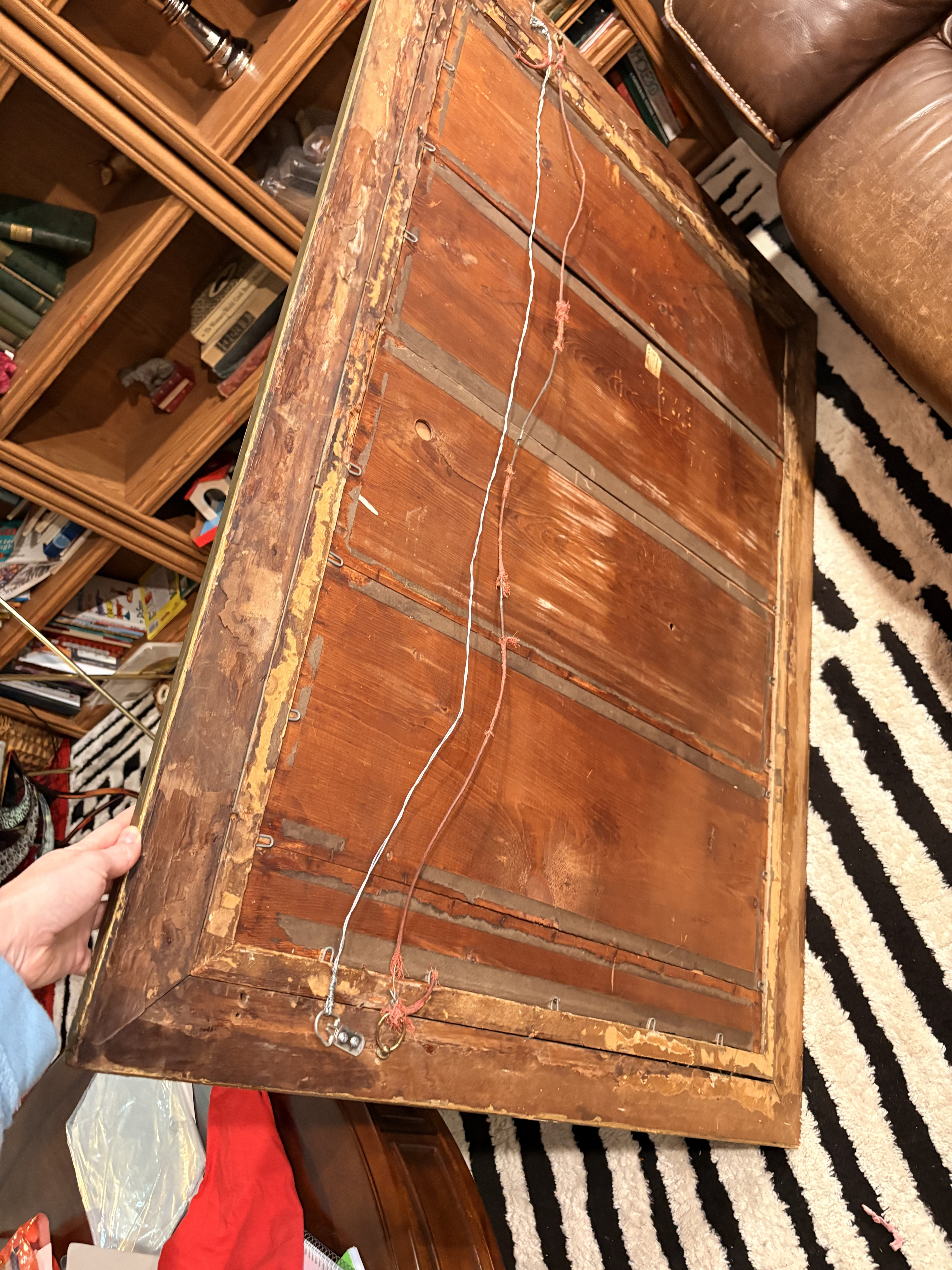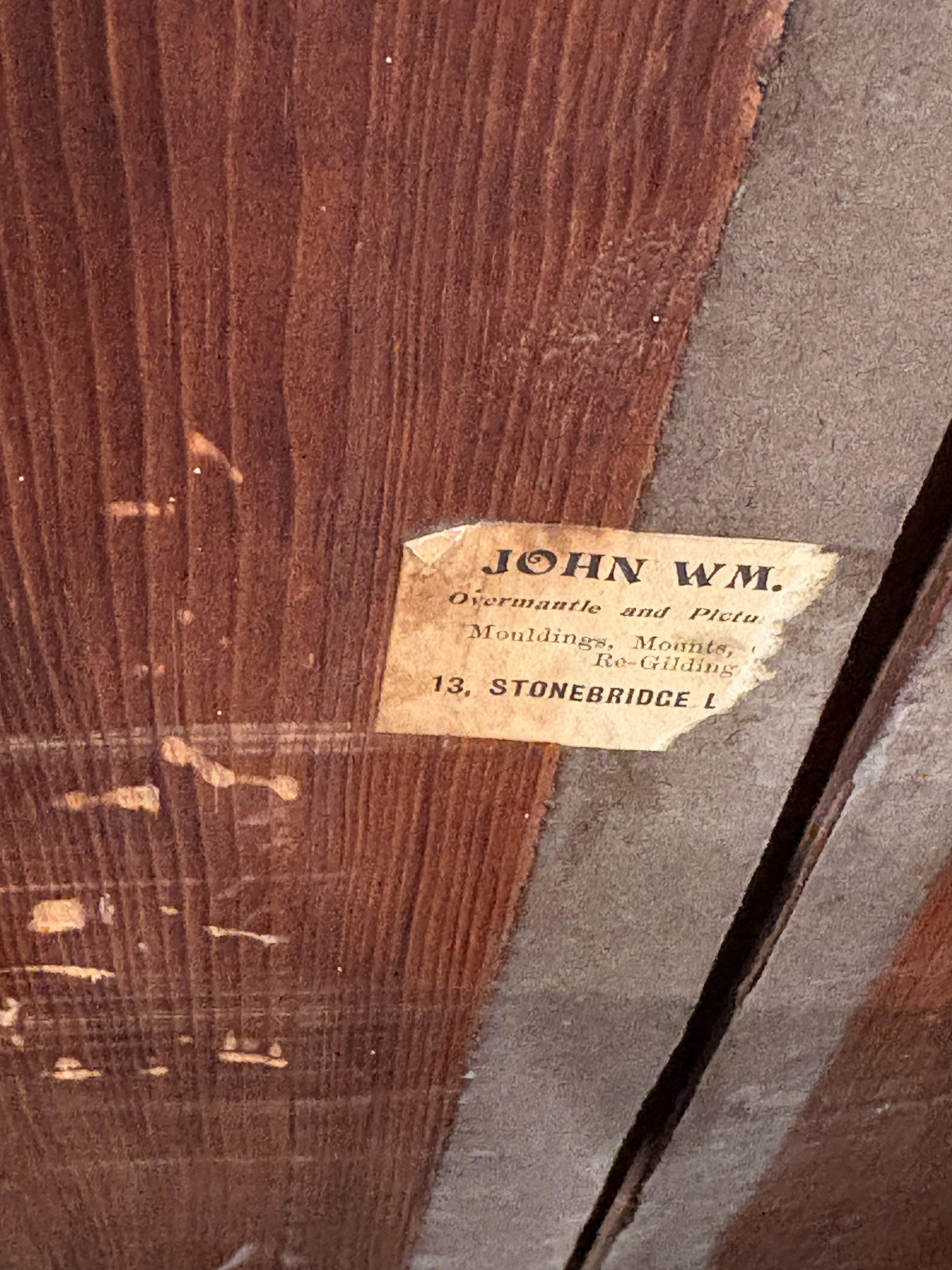 This picture is in a heavy gold frame. There is wood paneling on the back, and half a sticker from whomever framed it. There is some minor chips in paint and the frame is two pieces put together. A smaller sat into a larger frame.