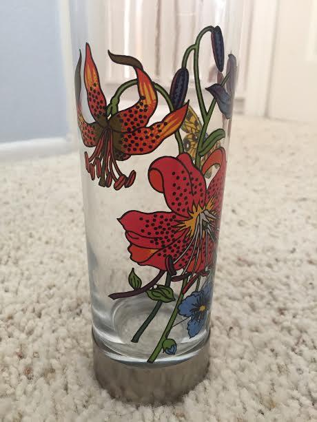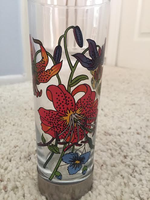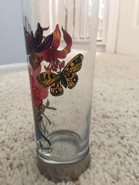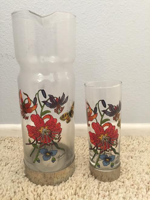 We received this set through the producers of various vintage game shows. It orginally would be used as a prize for the winners. It appears to be a part of the original design "Flora" by Vittorio Accornero that was popular on many Gucci scarves and was originally designed for Grace Kelly. Beneath the design is the official, vintage, cursive "Gucci" in black. On the bottom of the pewter area there is an impression that reads "GUCCI ITALY". This set includes six glasses that measures 6 " tall and 2 1/2" in diameter. Would so greatly appreciate an appraisal on this. Thank you!