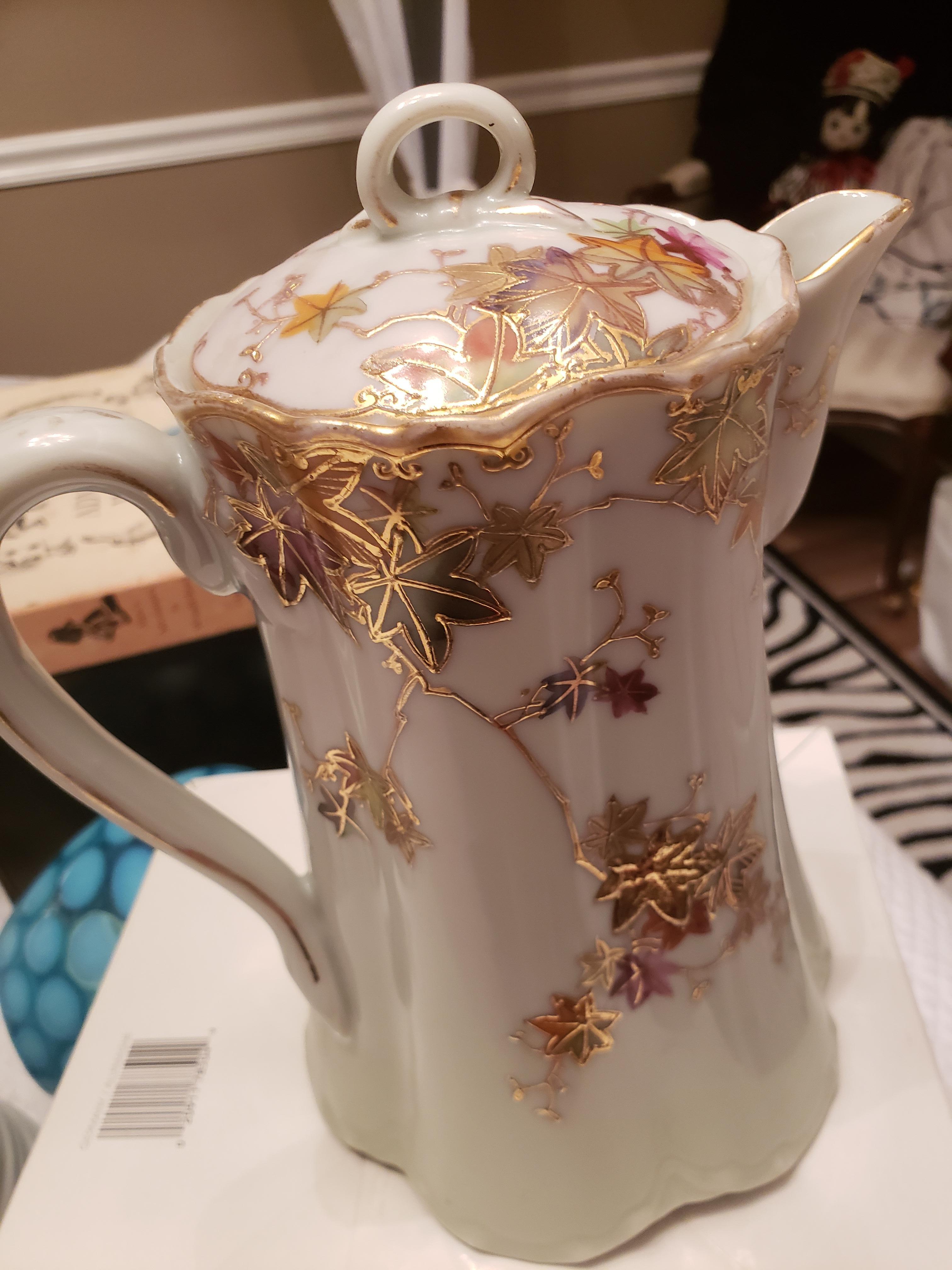 This teapot or chocolate pot has no identification marks. Plan on selling. Please help. Its white with multi colored leaves guilded in gold