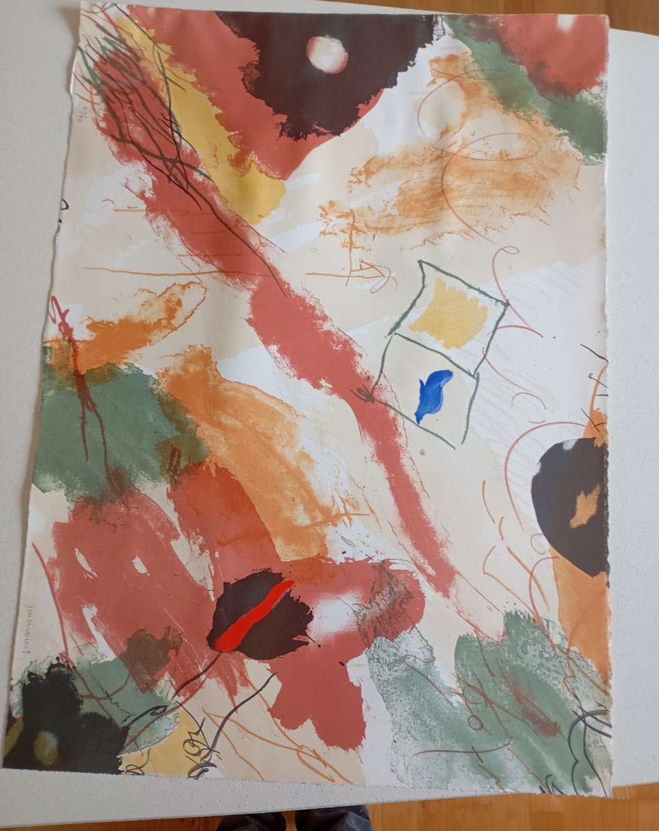 This lithograph features a vibrant abstract composition with a mix of colors including reds, greens, and yellows, along with a blue accent. The dimensions of the piece are approximately 54 cm x 74 cm (21.25 in x 29.13 in). The paper is a fine quality Velin, weighing 250 g/m², which is typical for lithographic prints.