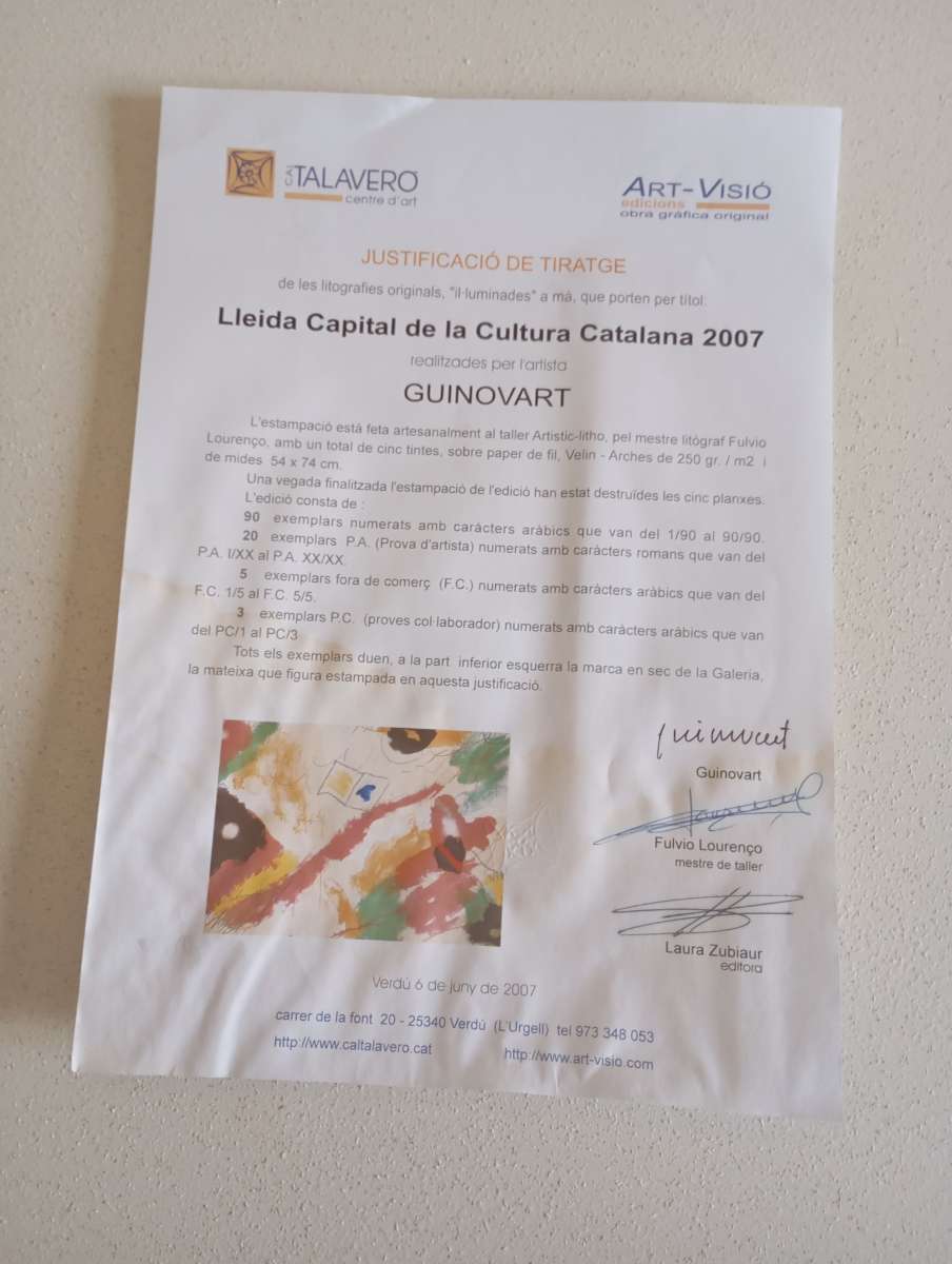 The lithograph is attributed to the artist Guinoart, specifically created by Fulvio Lourenço, a master lithographer. Guinoart is known for its artistic contributions to the Catalan culture, particularly in the year 2007 when this piece was produced as part of the "Lleida Capital de la Cultura Catalana" initiative.