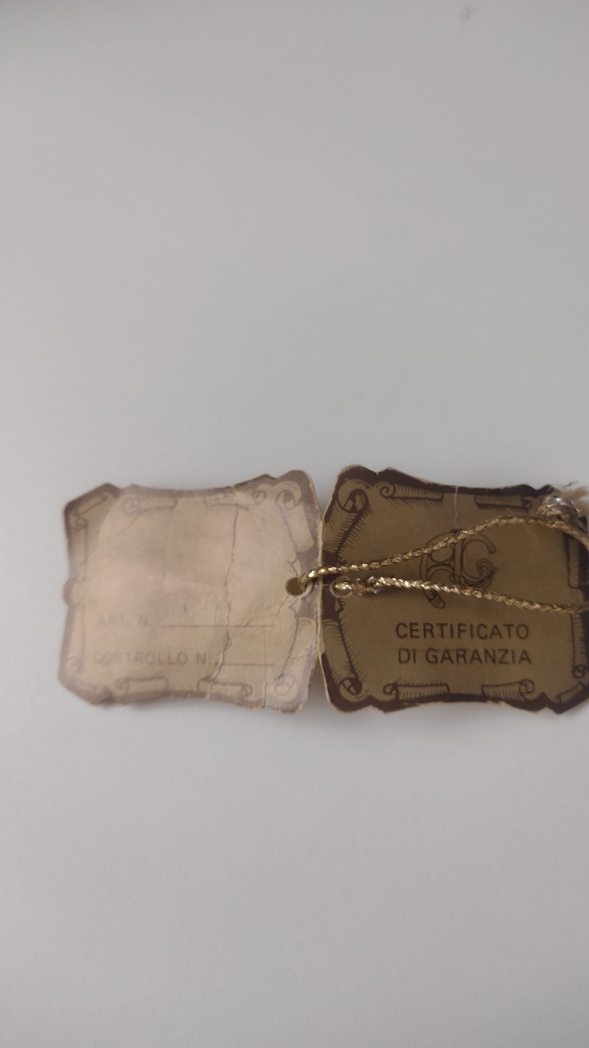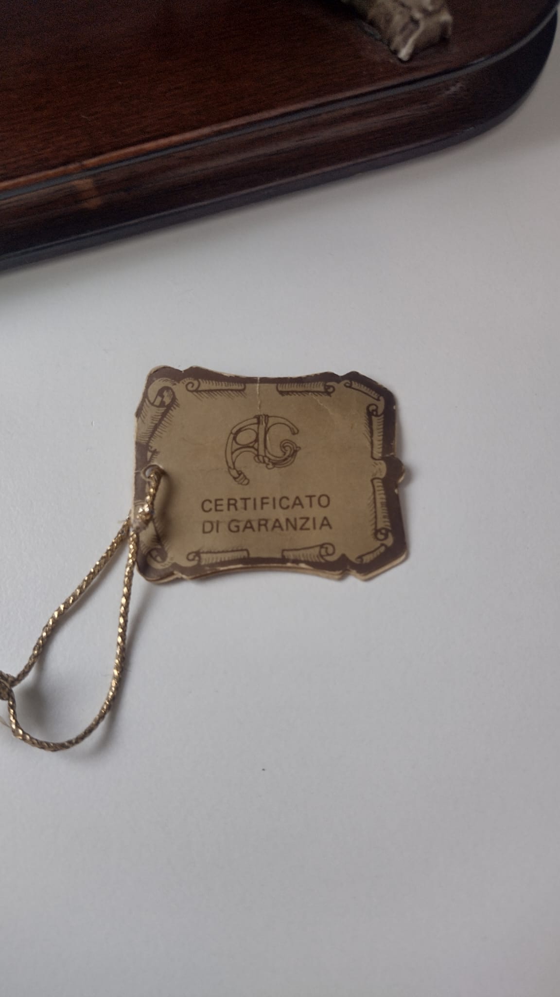 It has a certificato di garanzia, with art n.: 499 and controllo n.:8. On the back it has a mark with black marker, it seems. On the side are the letters g. a. engraved and on the bottom is a badge with made in italy taped. The badge and mark could maybe be added later.