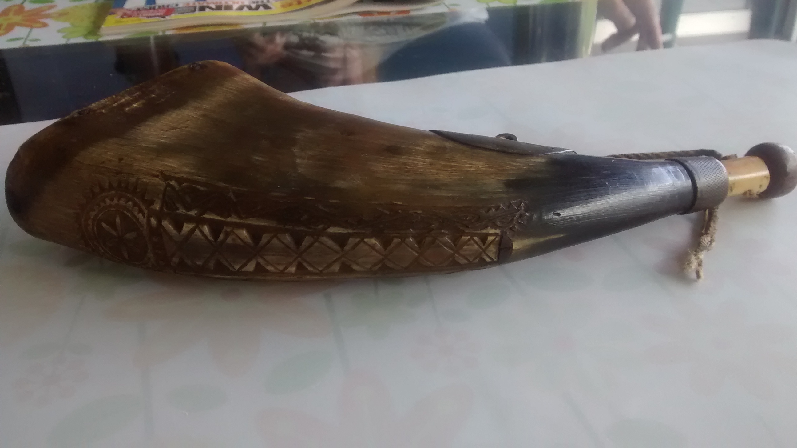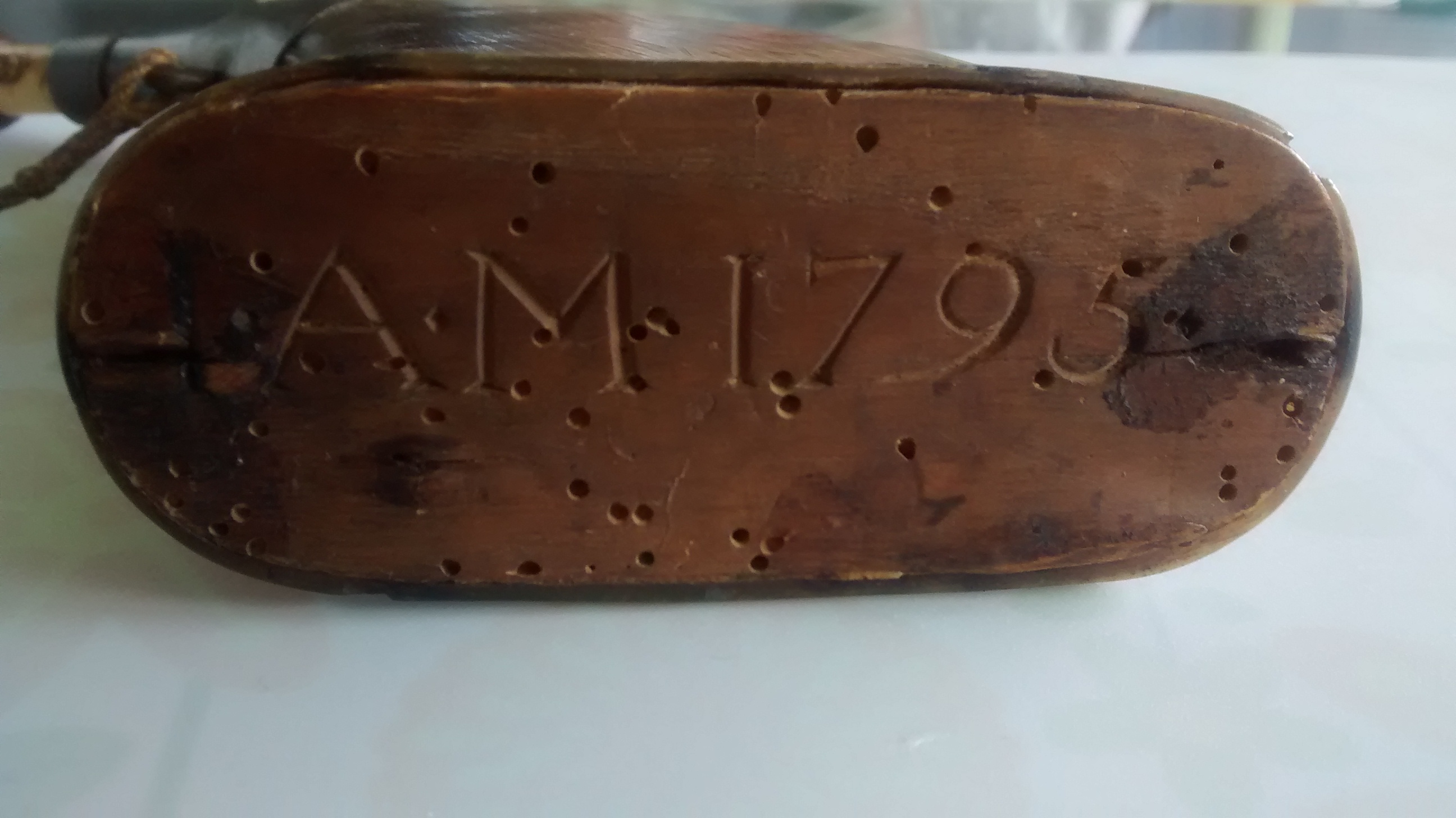 Approximately 25cms long, it has a pattern engraved along one edge, it has what looks to be an ivory, or bone stopper. On the bottom it has A.M.1795 carved into it