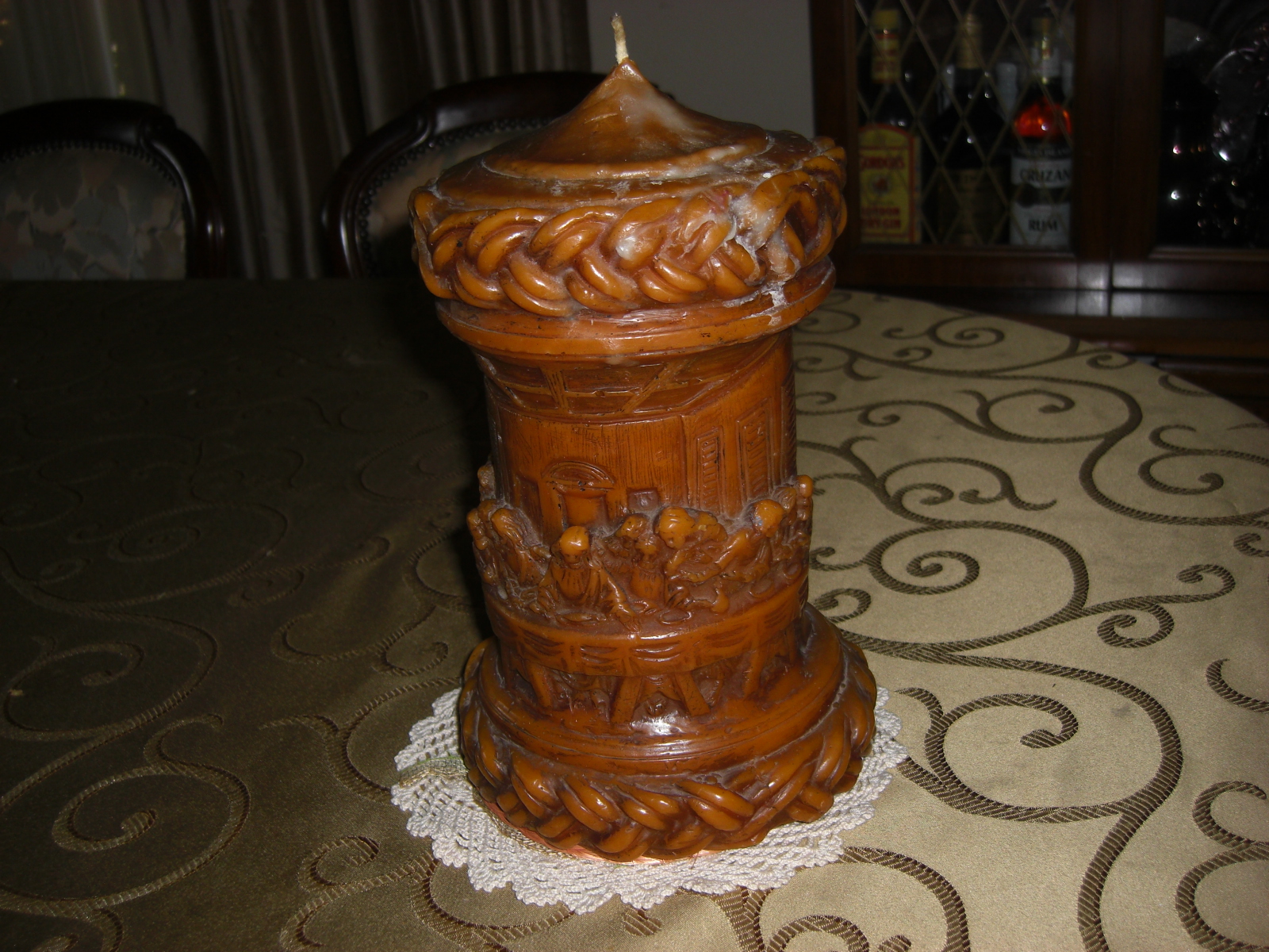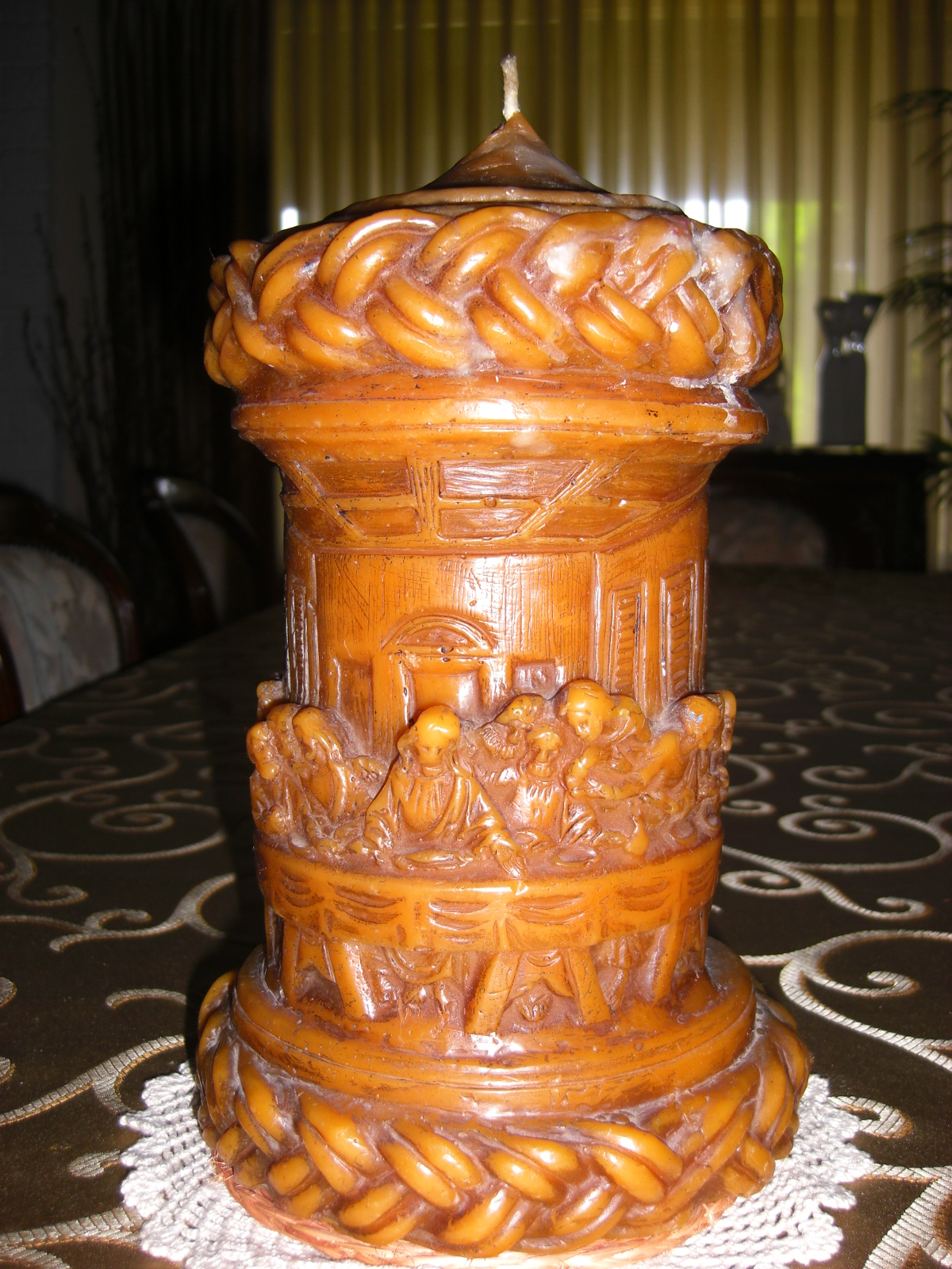GOLDEN BROWN COLOR. HAND CARVED. THE LAST SUPPER IS CARVED AROUND WITH THE WINDOWS, DOORS AND BEAMS BEHIND IT.