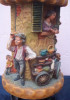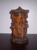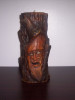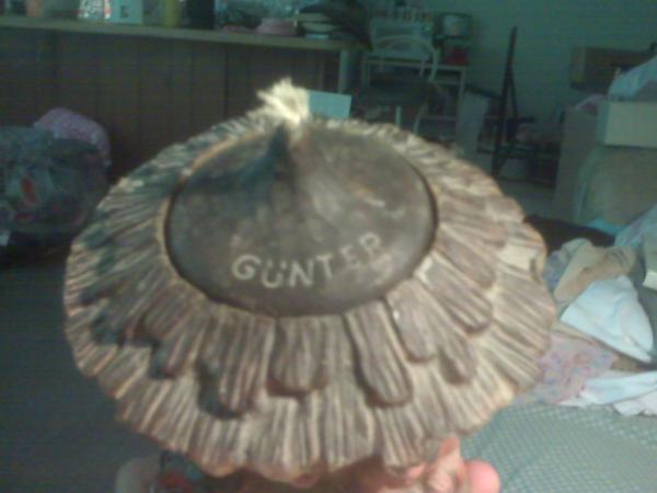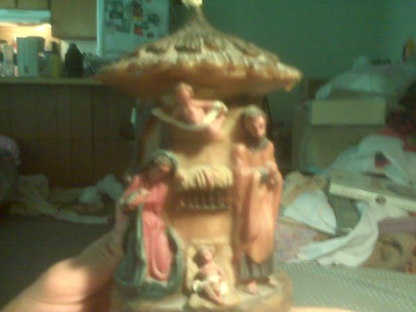 Round wax candle with Nativity scene. Top is shaped like the top of a hut. It has a lid made of wax that also says GUNTER. Scene is very vivid, with figures coming out of the wax, like a donkey out of a stable with a cow coming out of the other side. Is dusty.