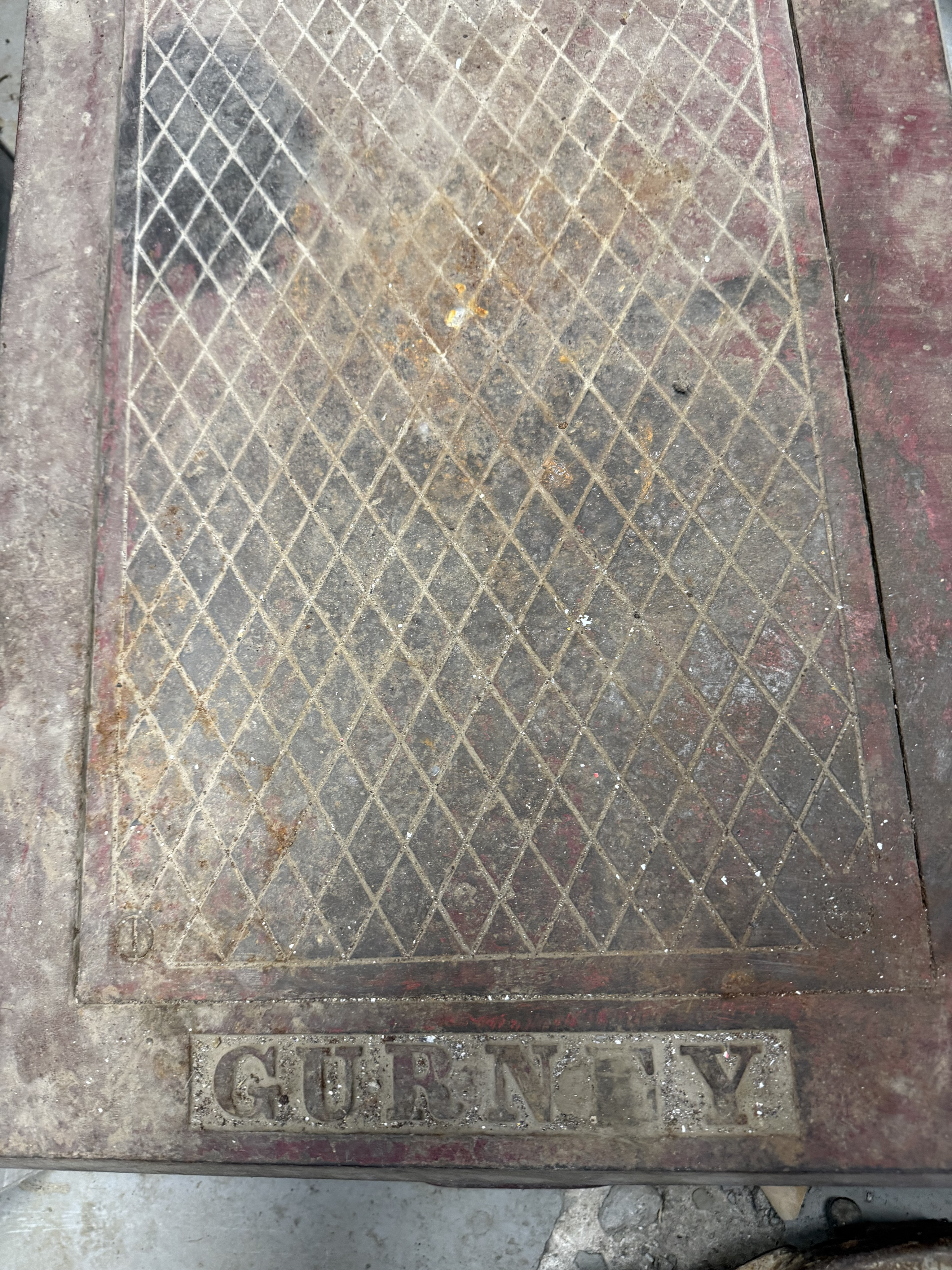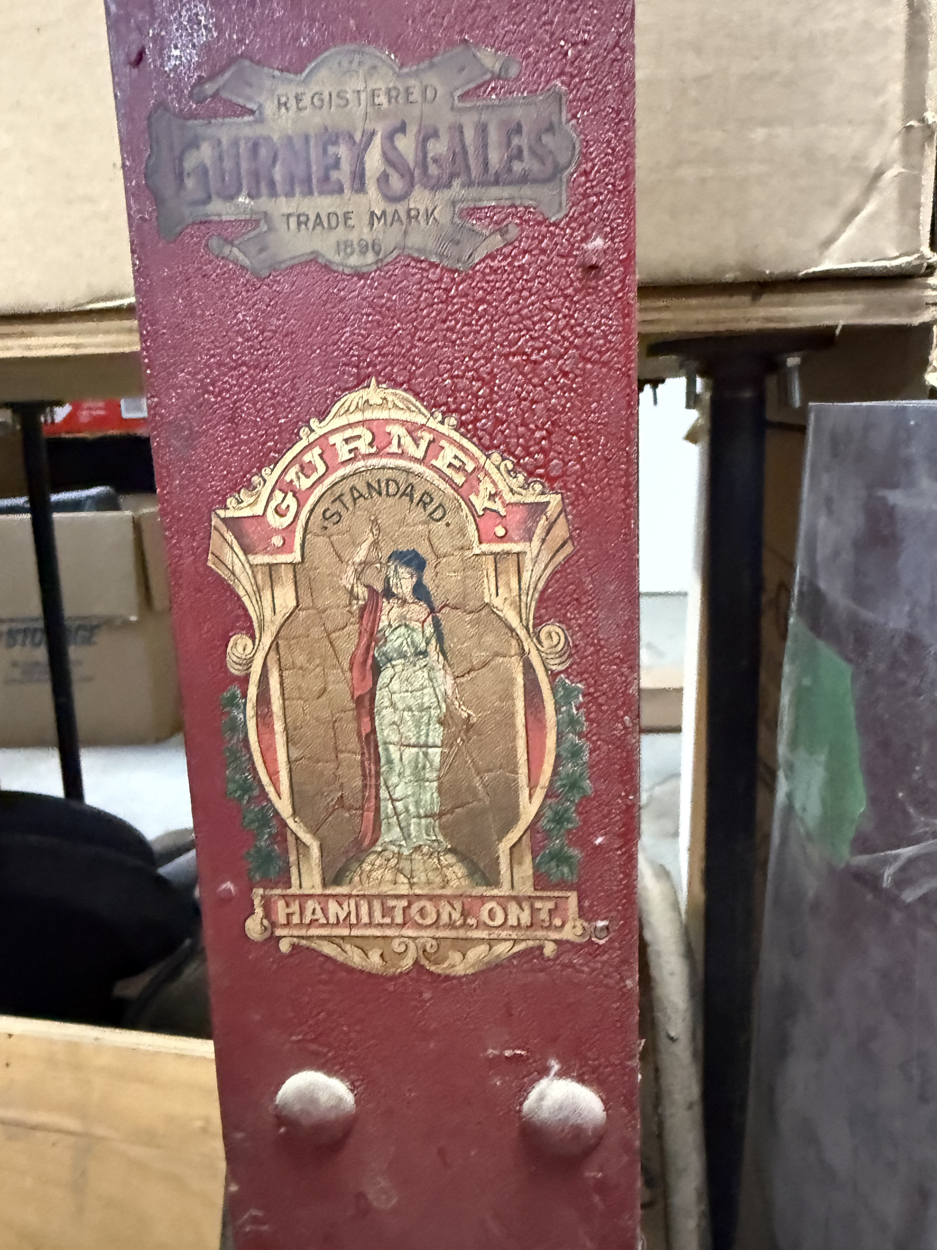 Gurney floor scale. Made in Hamilton Ontario. Not in business anymore. Has some dirt on it but in great condition. Weighs accurately. Labels are intact but show a bit of age. Dated from 1957. The year after our company was founded. One owner.