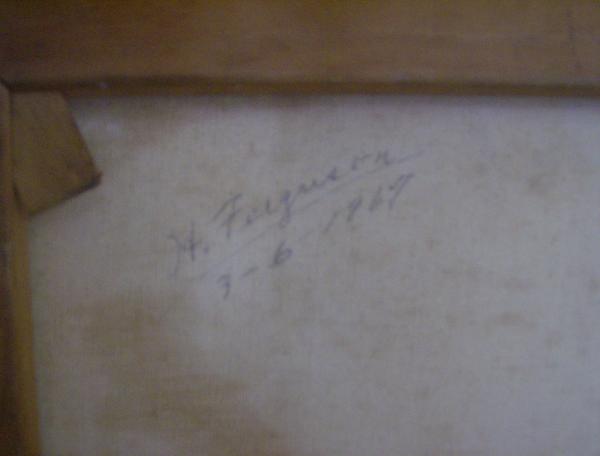 Oil on canvas, doesn't appear to have ever been retouched since it does same some cracks in the paint and some aged wear, there are a few spots where the paint has been worn. It's a very beautiful painting with a background in many fading shades of orange it grows darker at the bottom left side where there is some sort of basket holding what appears to be white and brown flowers. It has Asian calligraphy on it, 3 rows at the top right and one small, perhaps name, at the bottom right by the basket. The frame also appear to be original, marked from Anco Bilt Glendale, NY (both 24/18 markings also). The signature "H. Ferguson" and date "3-6-1967" are written in pencil and the signature is underlined, the date below the line. It's located in the left top corner of the back of the painting.