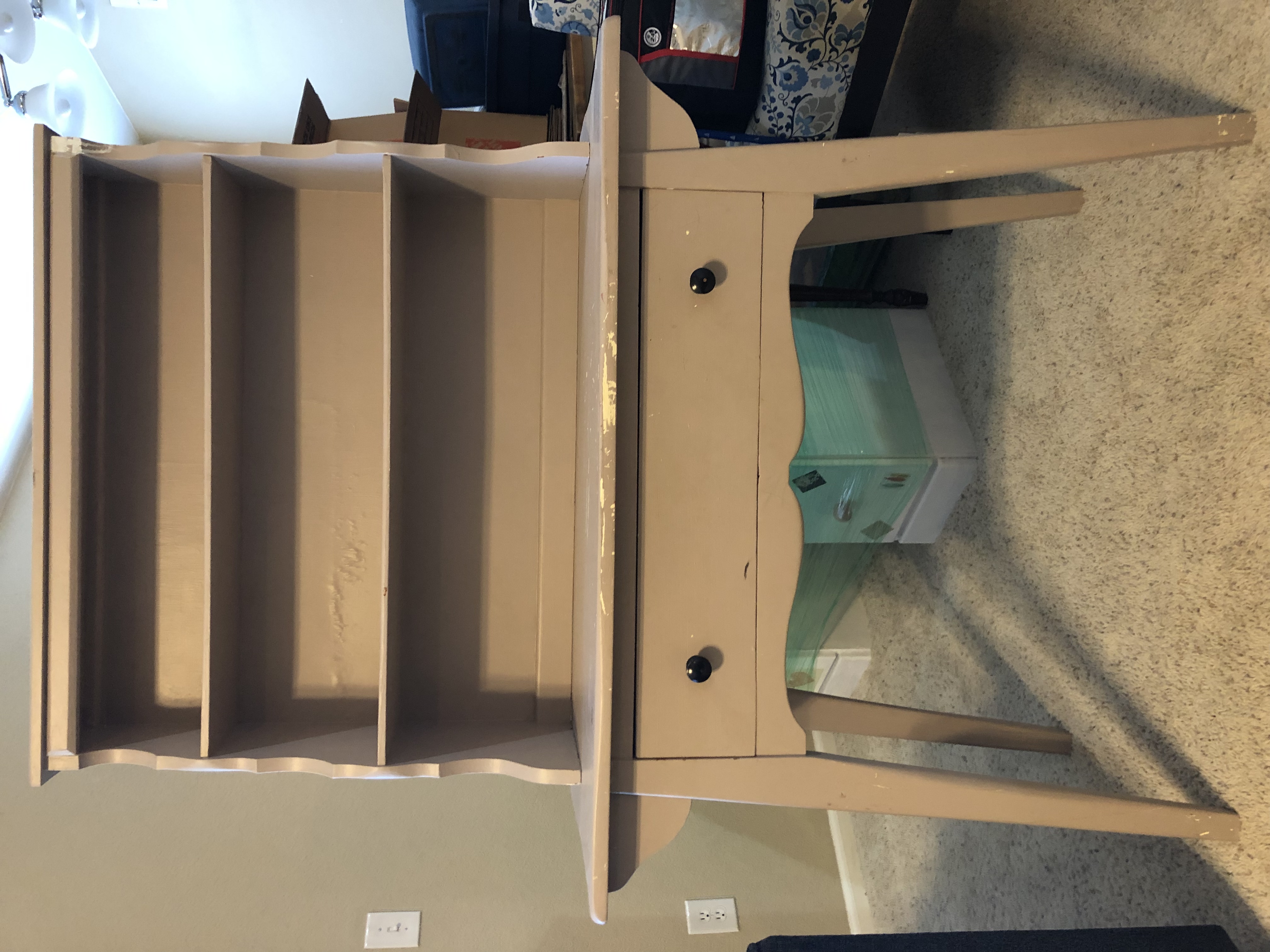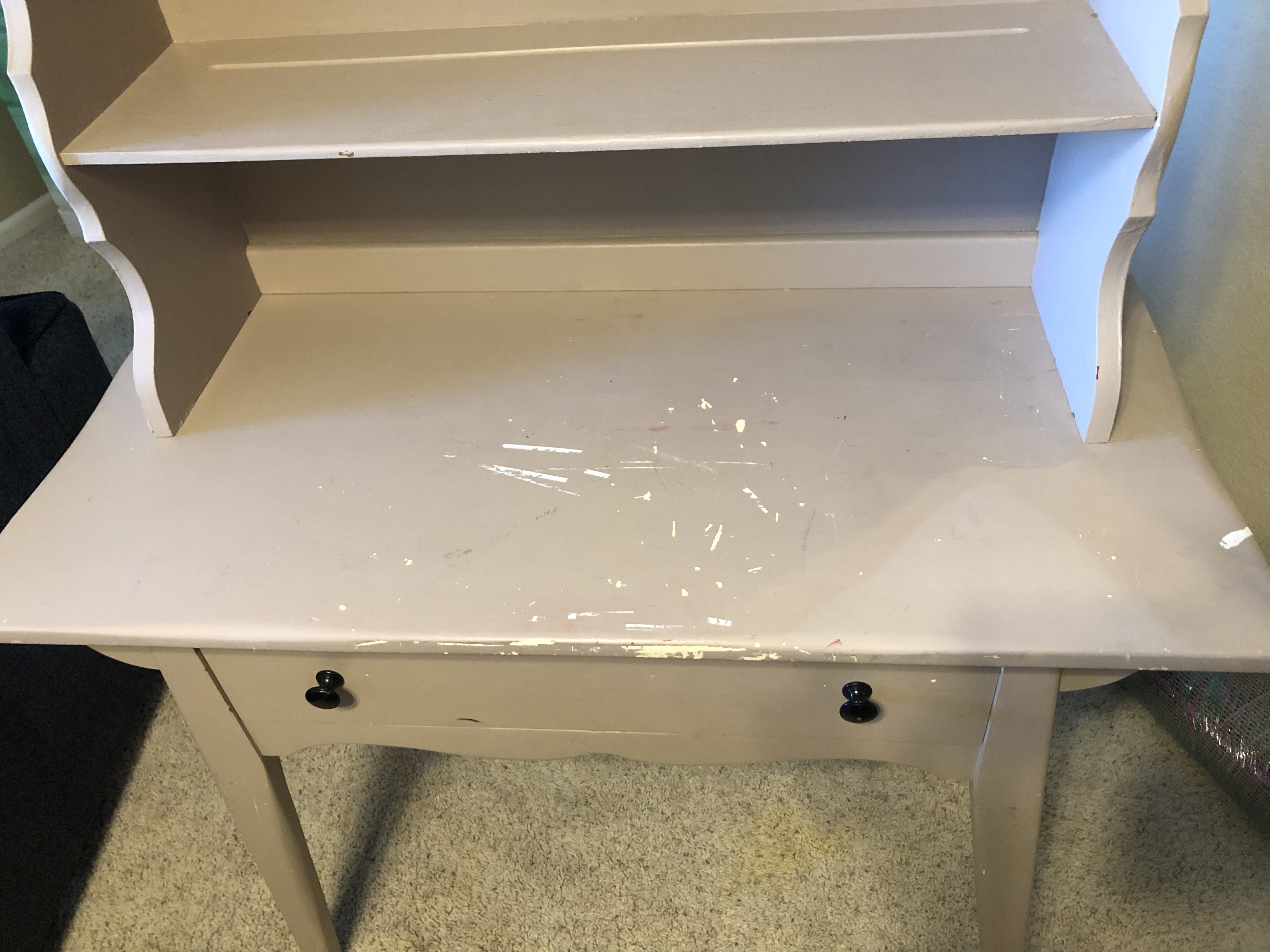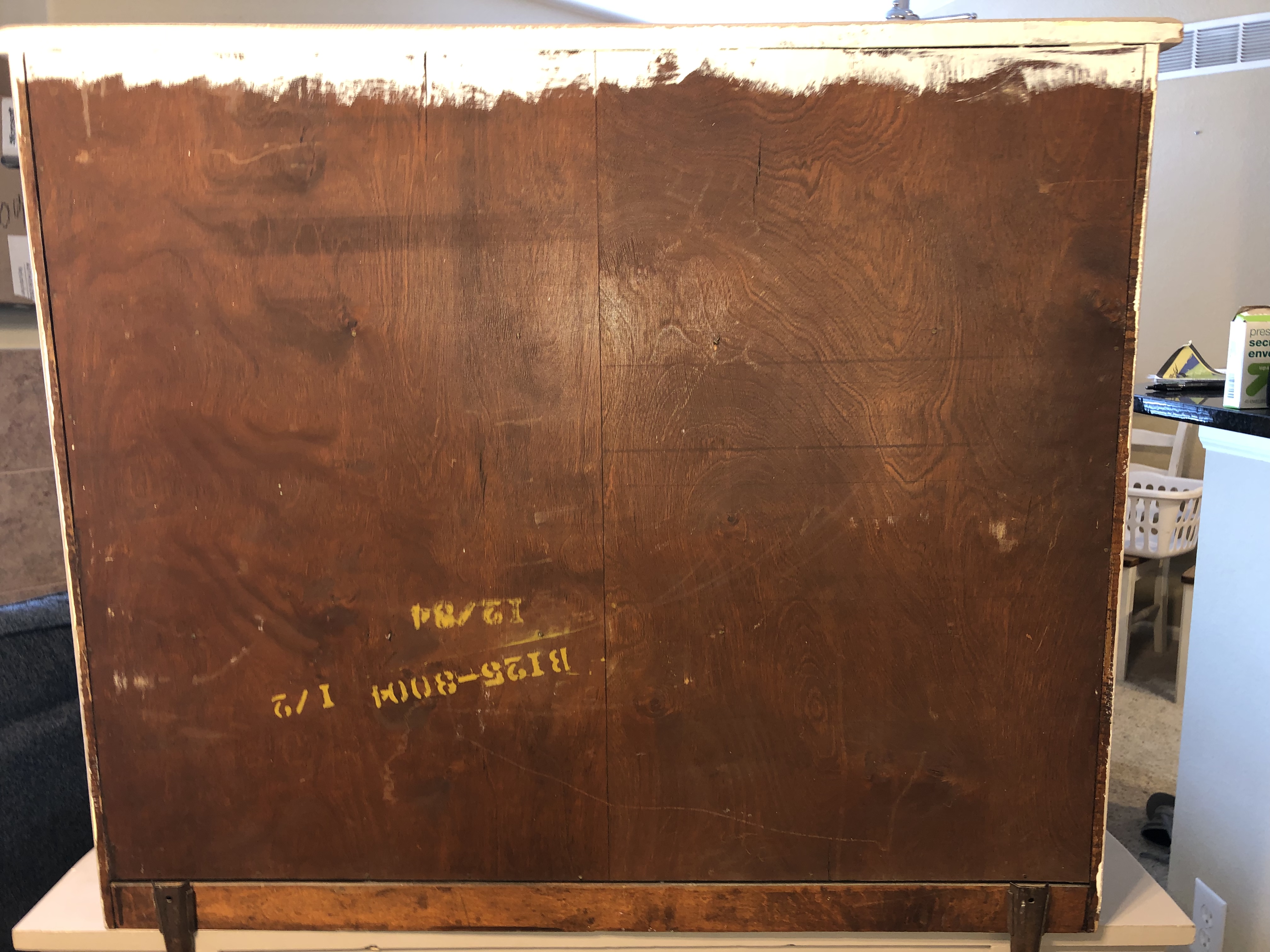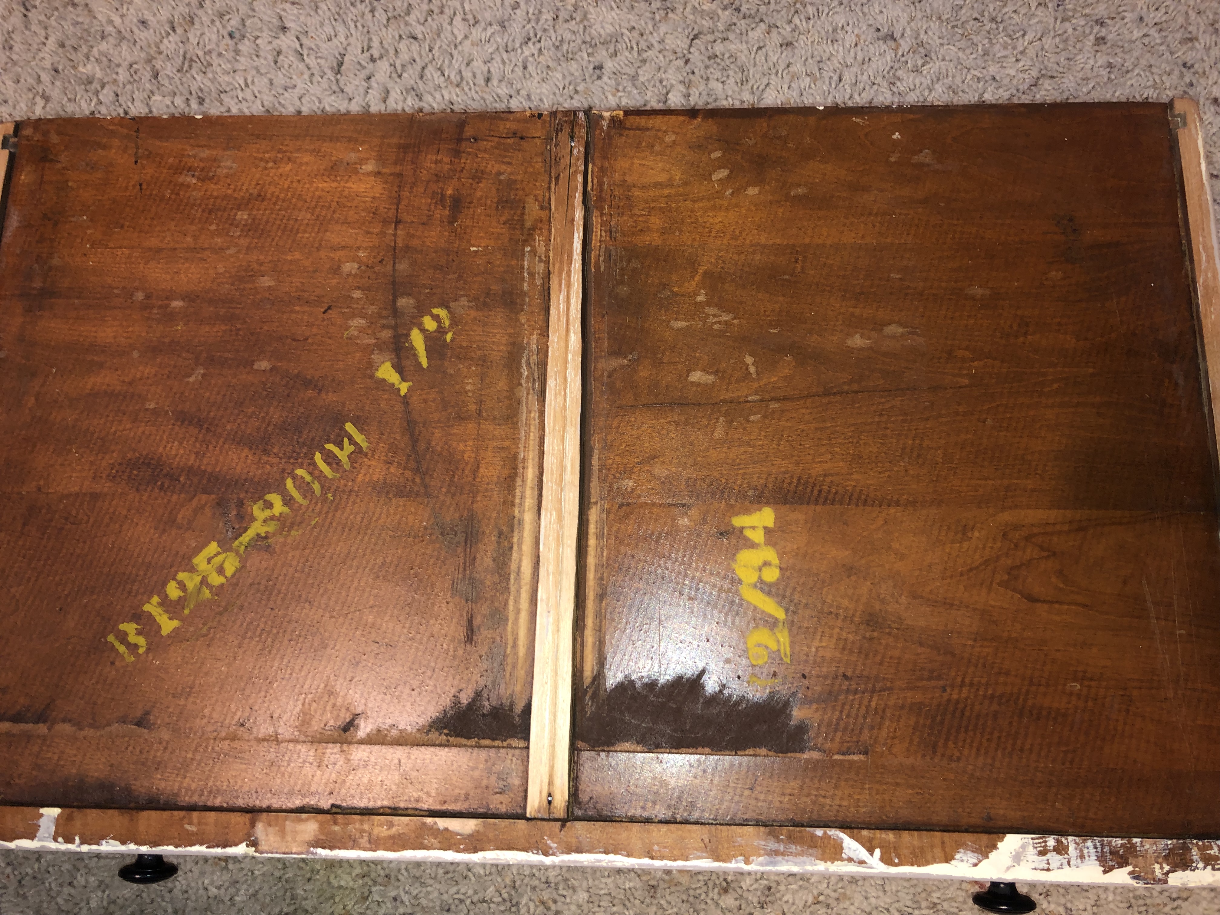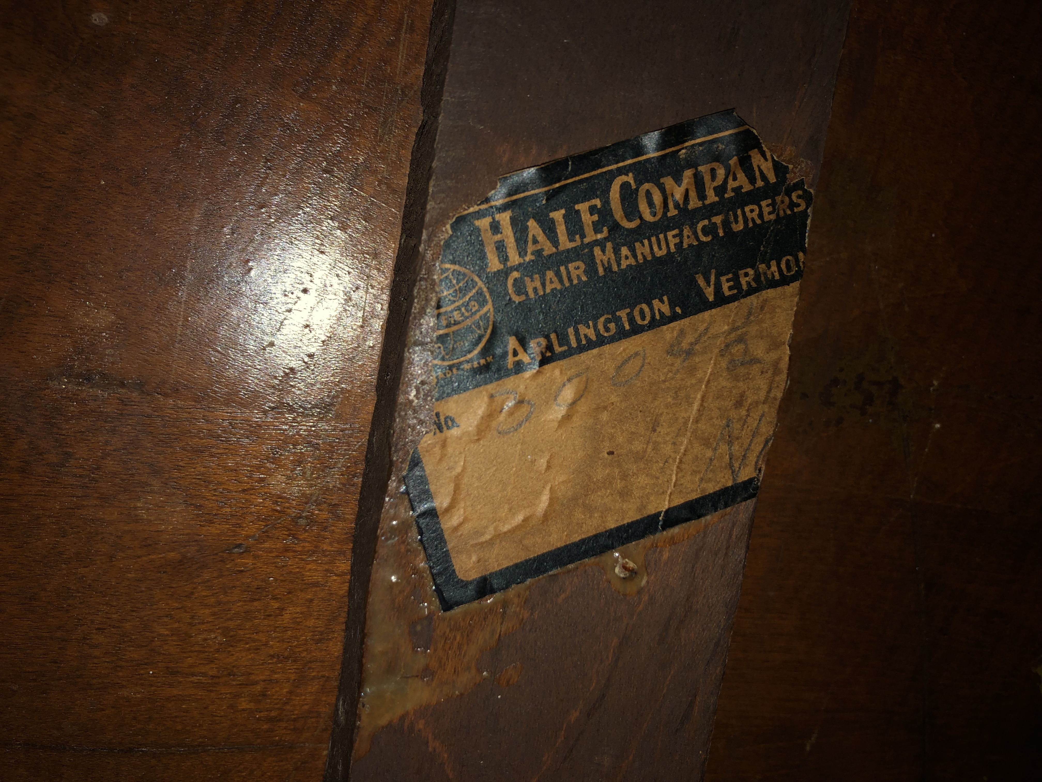 This is a two piece desk made by Hale Company. The stamp on the back reads “B125-3004 1/2 12/34”. It has at least three thick coats of pint on it. The wood all seems to be in very good shape aside from that though. The top is held to the bottom by 2 three piece brackets made by Keeler Brass Company.