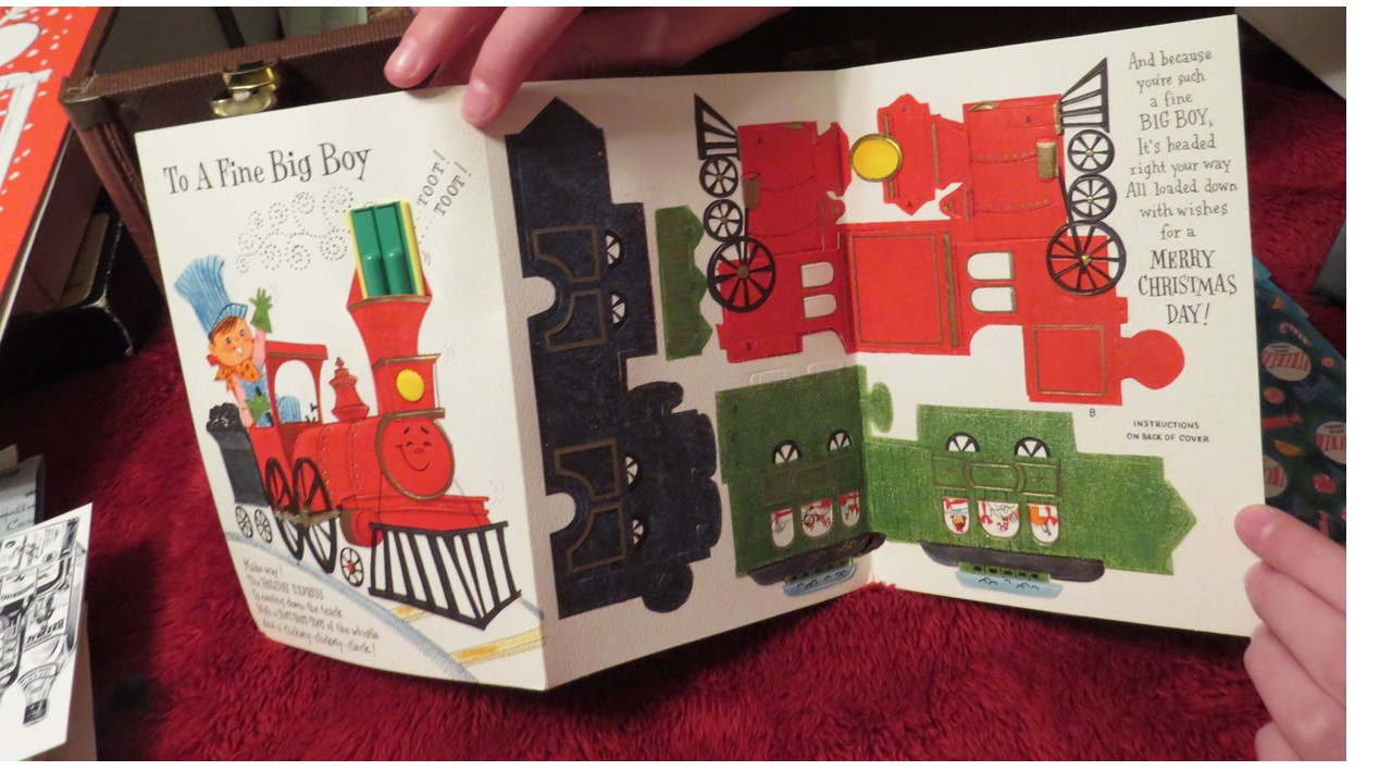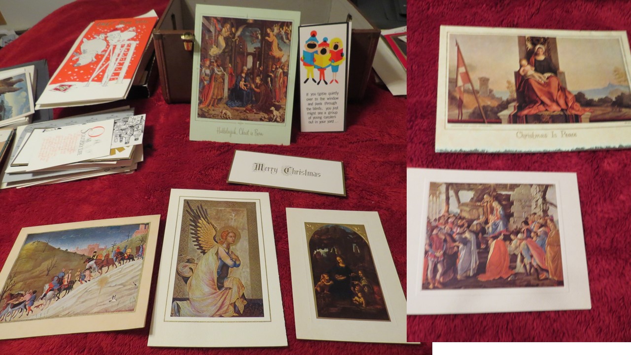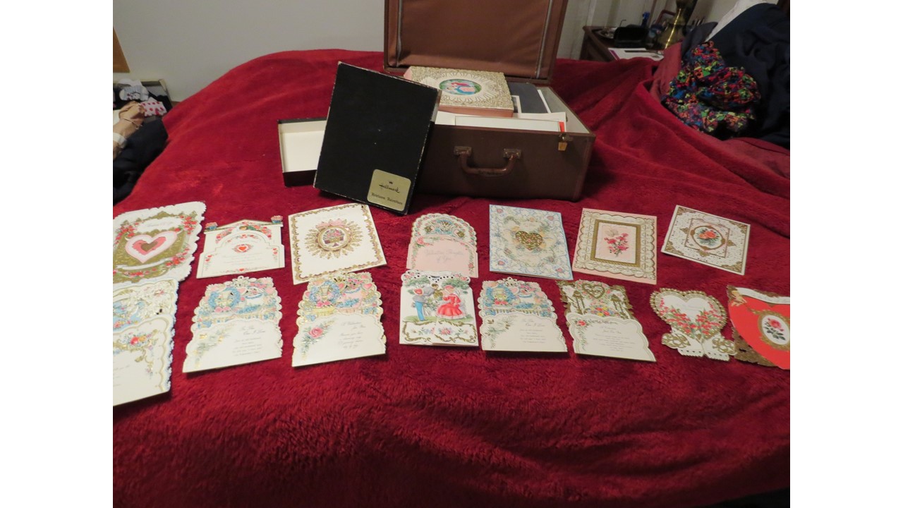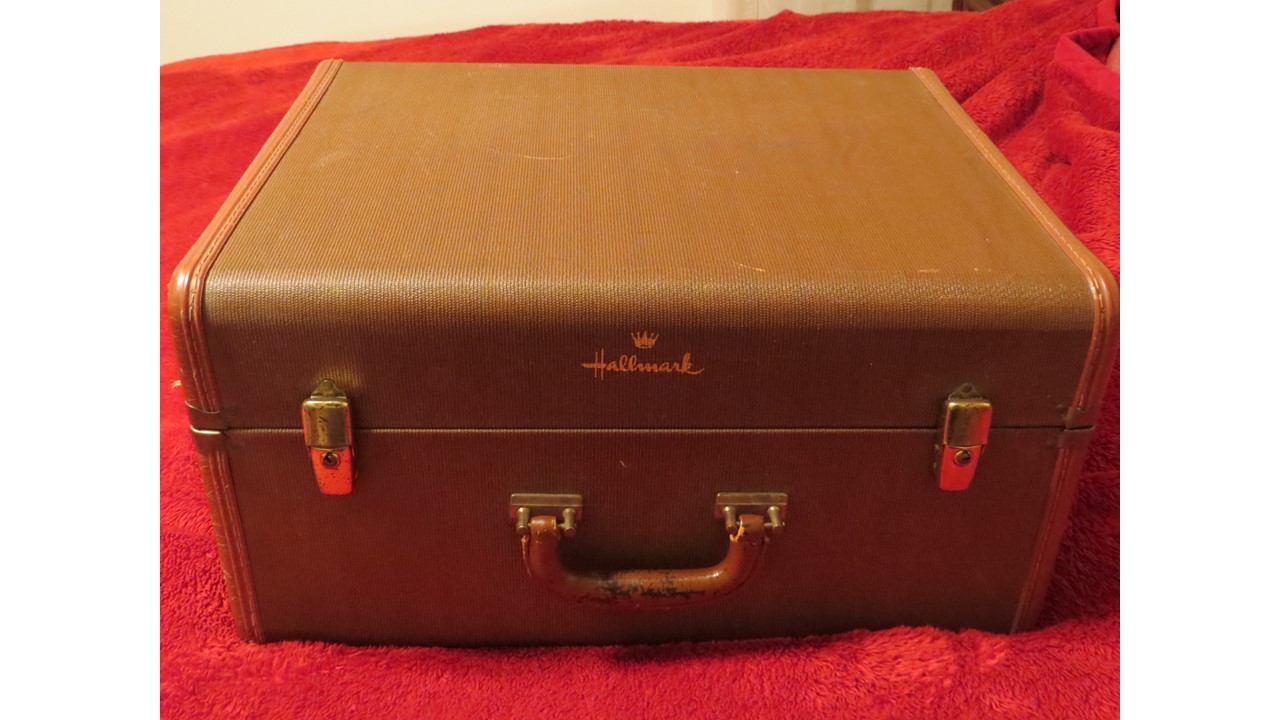My church received this as a garage sale donation. The heavy suitcase appears to be a card salesman's box. The box is stamped "Hallmark" on the outside and is filled with over 50 Hallmark sample cards inside. The cards are unused and are primarily Christmas, New Year's, and Valentine's Day cards though a few Easter, Mother's Day and others are included. They appear to all be sample cards. The box also contains some price lists (for example, price per 12 cards). The case itself has a zippered top compartment and a larger compartment with two partitions that can be used to separate the space. Based on the New Year's cards, we believe the box dates about 1964. Many of the cards are labeled "heirloom cards" and are extremely ornate. Some are popups. Others are labeled "contemporary" and are less so. Some of the cards use artwork on the front. Some are popout paper nativity scenes or such. One has a lace together boy's wallet in a pocket. All the cards are generally in very good to excellent condition. A few have some light yellowing on the back.