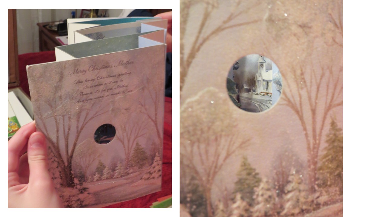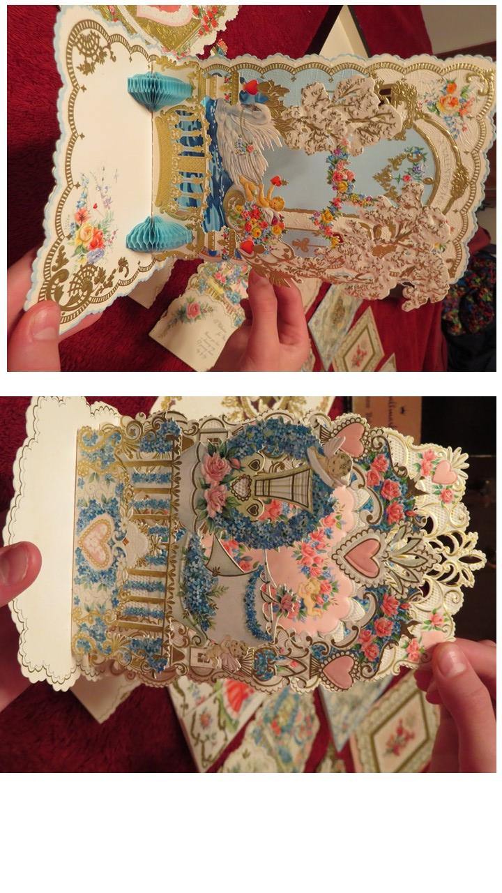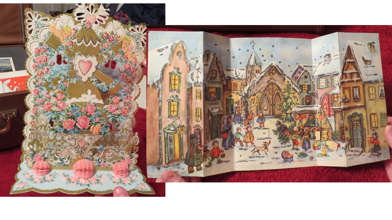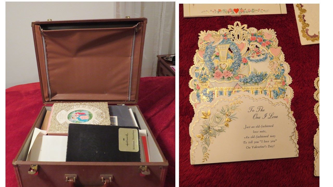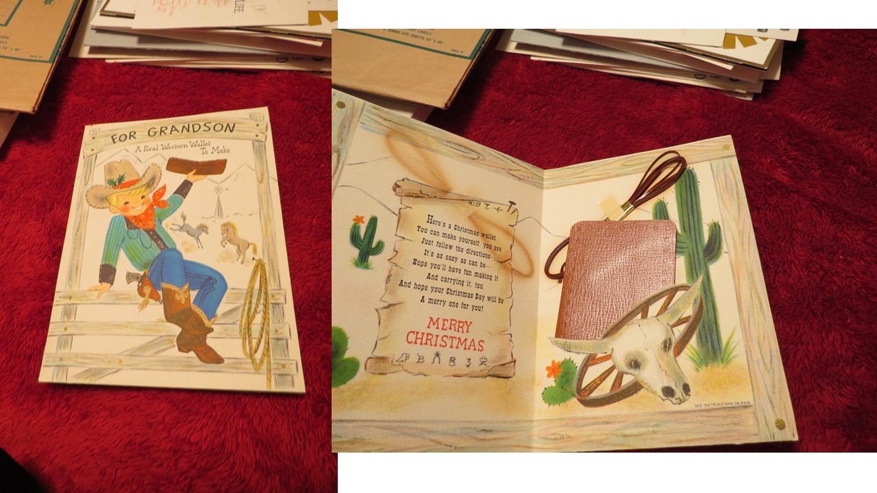 My church received this as a garage sale donation. The heavy suitcase appears to be a card salesman's box. The box is stamped "Hallmark" on the outside and is filled with over 50 Hallmark sample cards inside. The cards are unused and are primarily Christmas, New Year's, and Valentine's Day cards though a few Easter, Mother's Day and others are included. They appear to all be sample cards. The box also contains some price lists (for example, price per 12 cards). The case itself has a zippered top compartment and a larger compartment with two partitions that can be used to separate the space. Based on the New Year's cards, we believe the box dates about 1964. Many of the cards are labeled "heirloom cards" and are extremely ornate. Some are popups. Others are labeled "contemporary" and are less so. Some of the cards use artwork on the front. Some are popout paper nativity scenes or such. One has a lace together boy's wallet in a pocket. All the cards are generally in very good to excellent condition. A few have some light yellowing on the back.