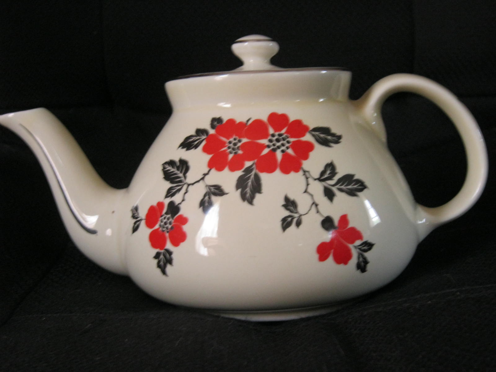 The is a cream colored teapot with the red poppy design on from and back with gold trim around top of teapot and spout and some on the handle. The knob on top also has gold trim.