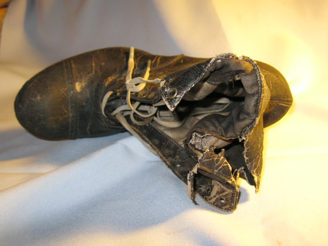 The condition is no where near new looking, the leather is dried and cracked, the top around the ankle support is ripped some, and the shoe lace is in two pieces, though it does still have both of the metal aglets and all of the metal eyelets. The sole is complete, but not in excellent shape and the heal is dried and cracked.