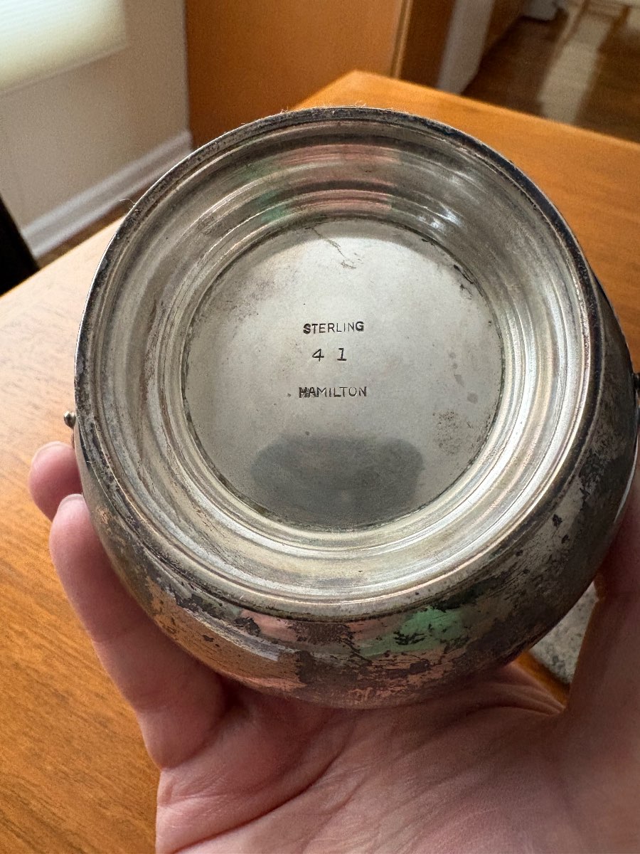 Physical Description: This is a small sterling silver sugar bowl with a rounded body and a domed lid. It features two curved handles and a finial on top. The bowl has a polished interior and a tarnished exterior, indicative of age. The dimensions are approximately 4 inches in height and 5 inches in diameter. The base is marked with "STERLING 41 HAMILTON," indicating its material and maker.
