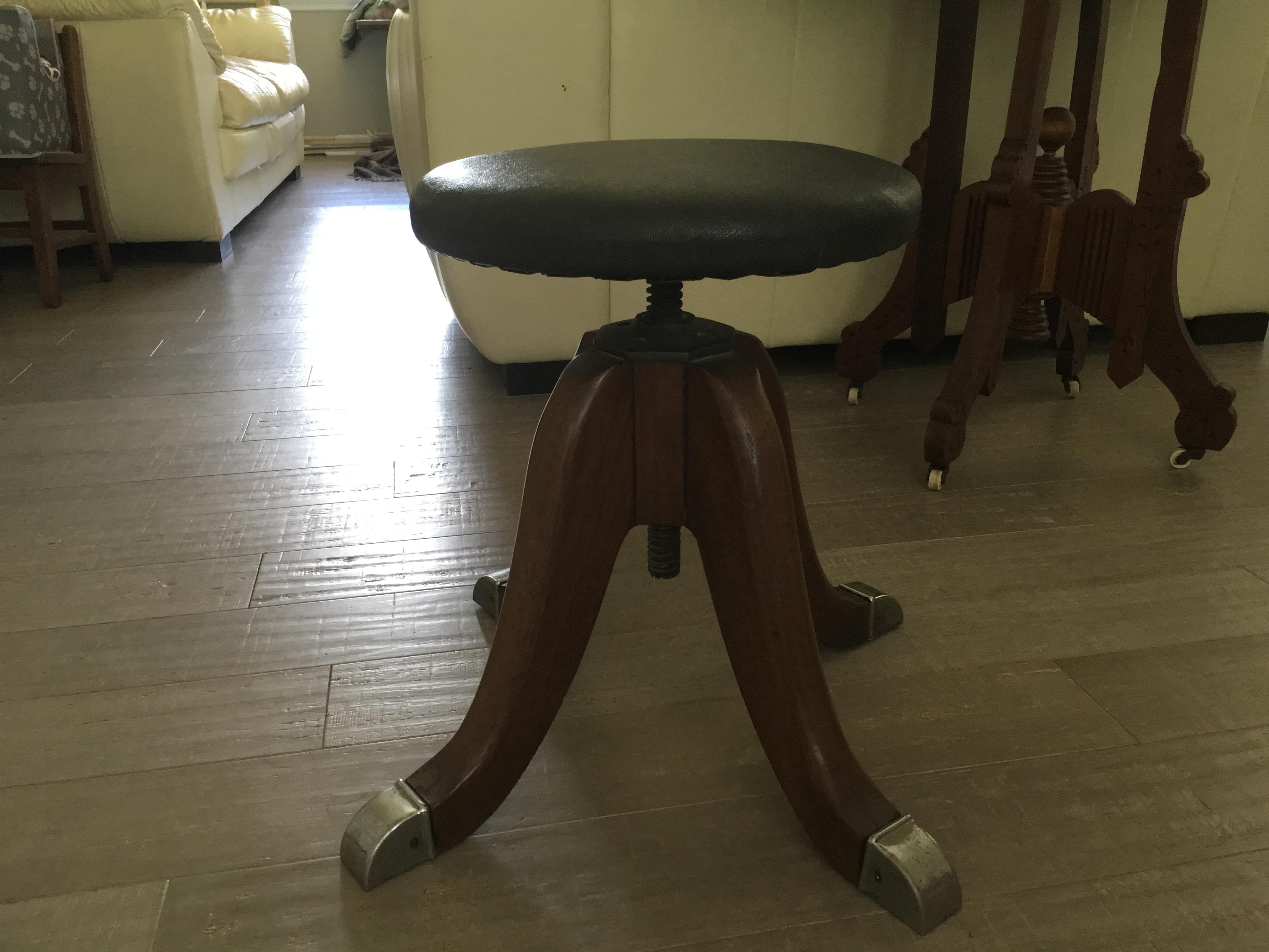 This is a 1950’s piano stool manufactured by the Hamilton co out of Two Rivers, Wis. They may be out of business or doing business under a different name. The seat is leather and swivels up and down. The feet have steel caps over the wood. This is a heavy stool but I am not sure of the kind of wood that was used. I have spent many hours trying to find another stool like it to no avail.