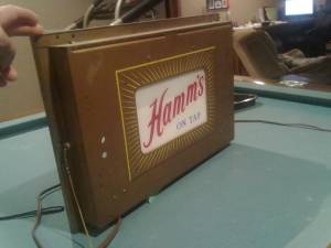 Hamms Lighted Beer Sign, flourescent bulb. Steel frame. Very old. Works. Ballast is maybe getting weak but is replacable.