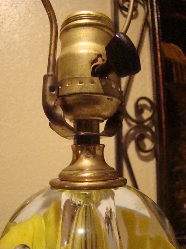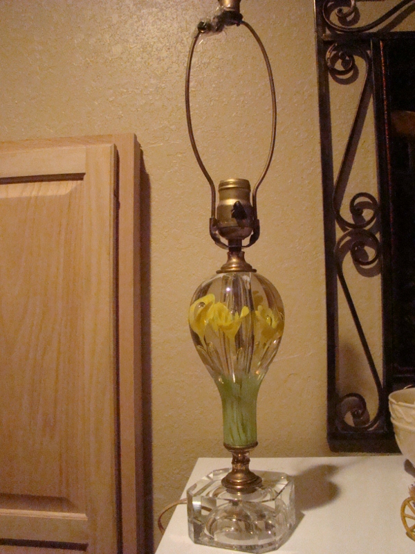 Once thought to be a lamp from Murano, it is not. The socket was made in the US by John Paulding Co. so it is thought to be possibly assembled in the US. The hand blown glass maybe shipped over from France or Belgium? I have not been able to come up with any real info on this lamp. I have included a piture of the matching ashtray also. Daffodils with one bubble in the center of each flower.