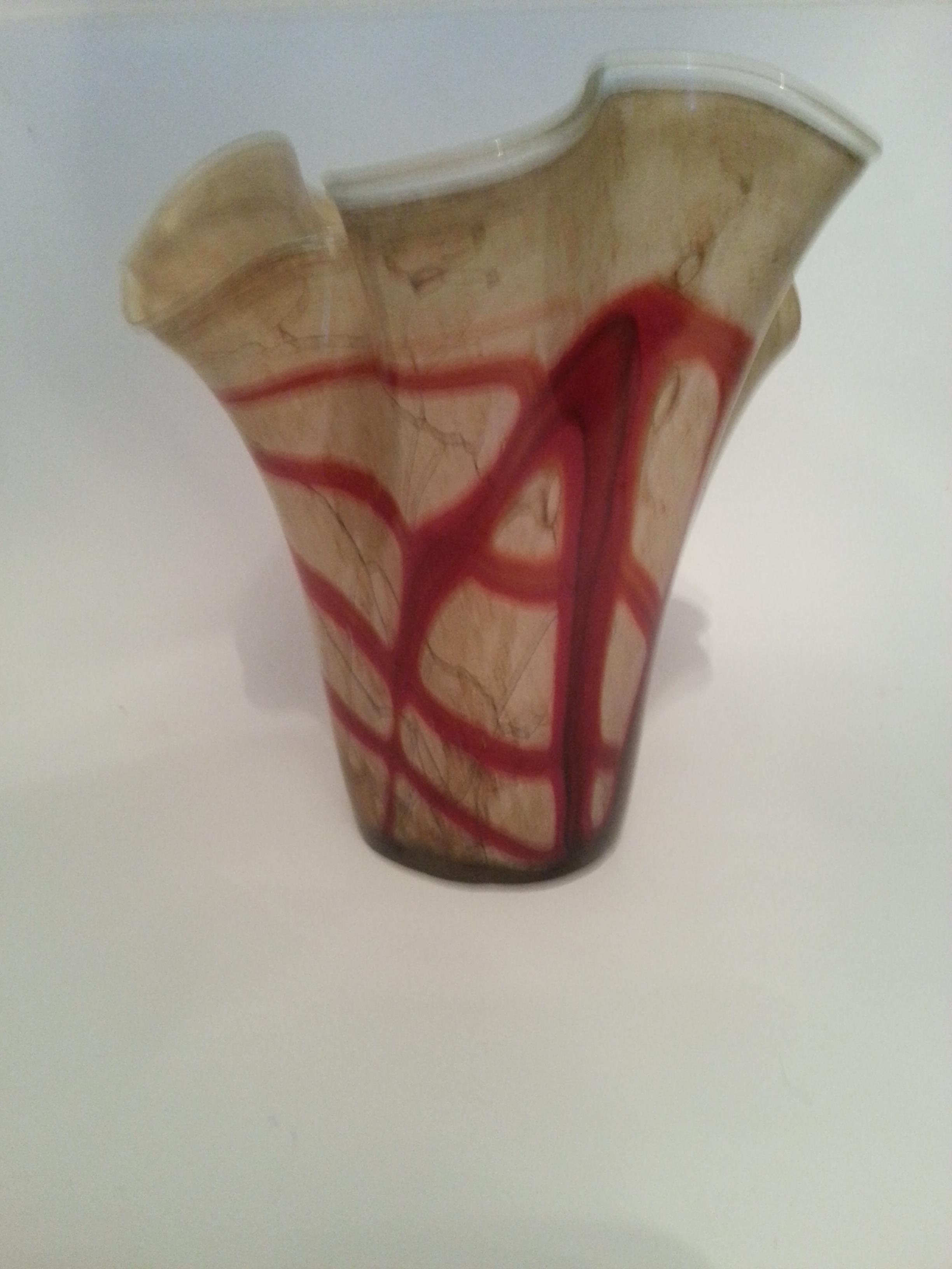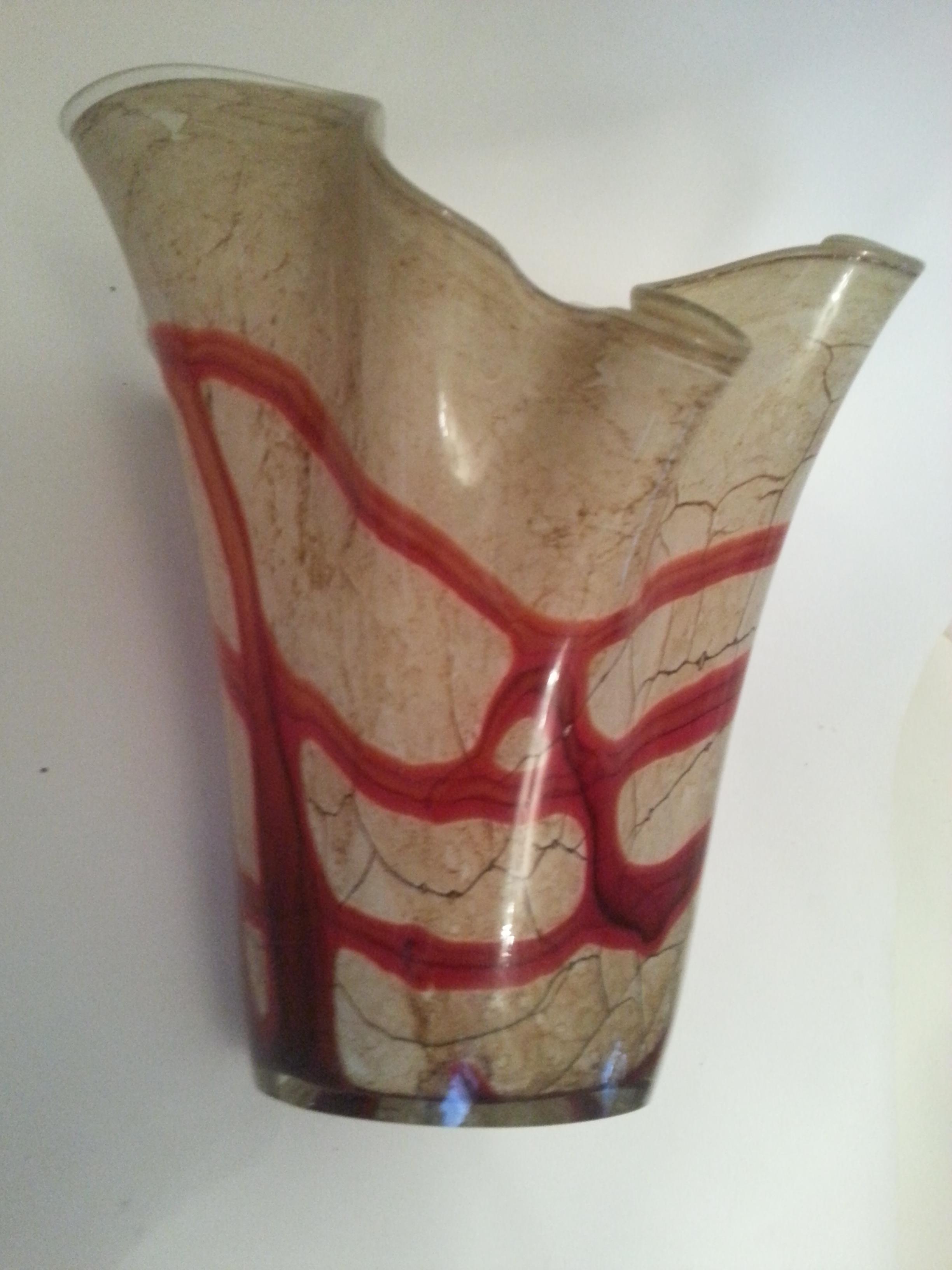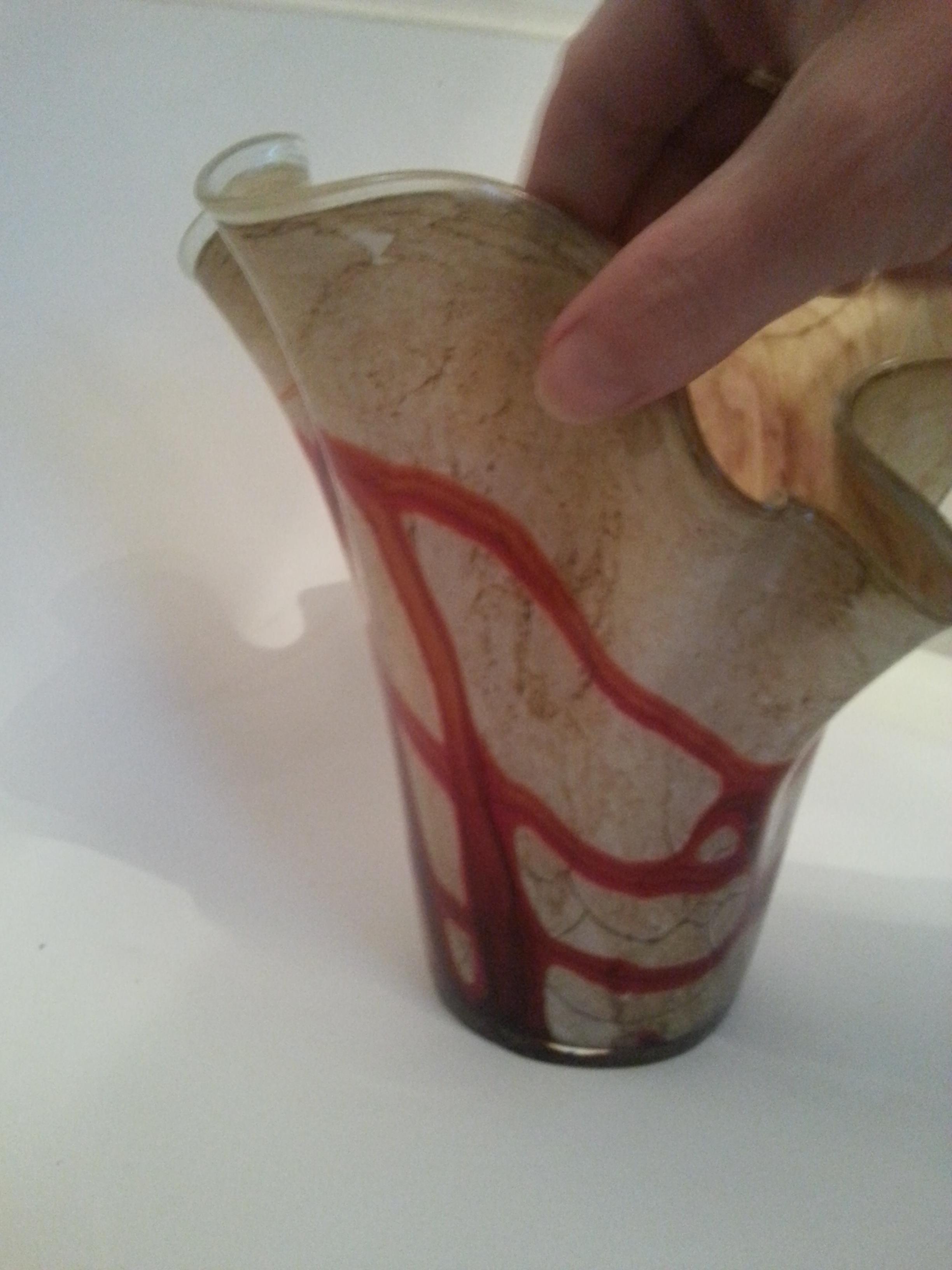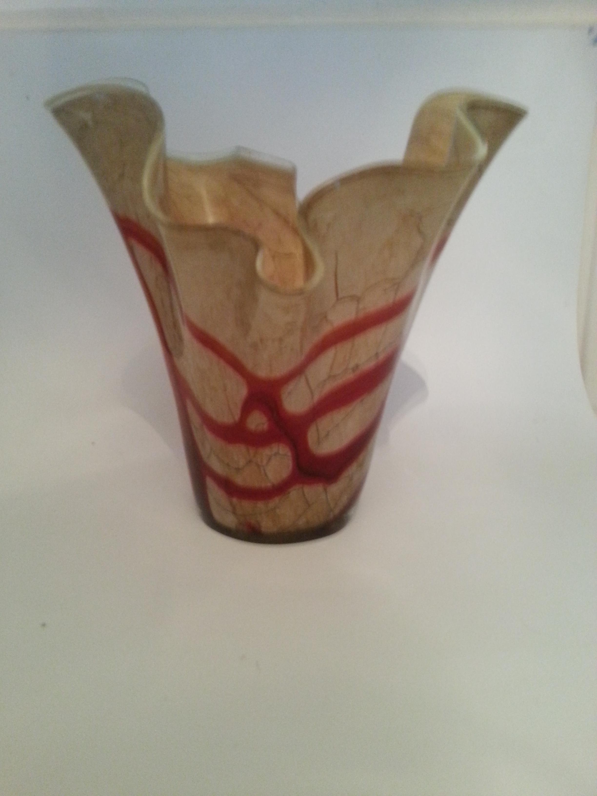 heavy glass vase ripple top ruffle lovely glass red going through it and cream/biege grainy cracked effect