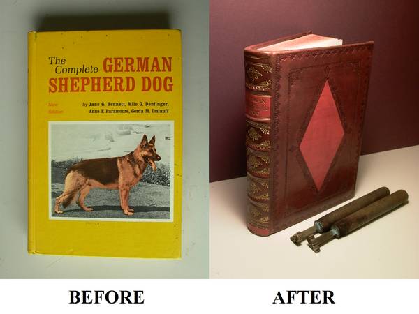 A 1977 edition of "The Complete German Shepherd Dog" rebound in full calf, with hot blind-tooled covers, 18kt gold tooled spine, hand dyed calf leather, sprinkled edges, and marbled paper lined inside-covers, by the Little Wolf Bindery in Port Moody, BC, Canada. Little Wolf bindings are rare as the binder is highly selective. Headbands are handwound, with false raised bands on spine. The book is highly illustrated with many pictures of German Shepherd dogs but we are interested in the value of Little Wolf bindings.