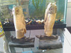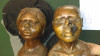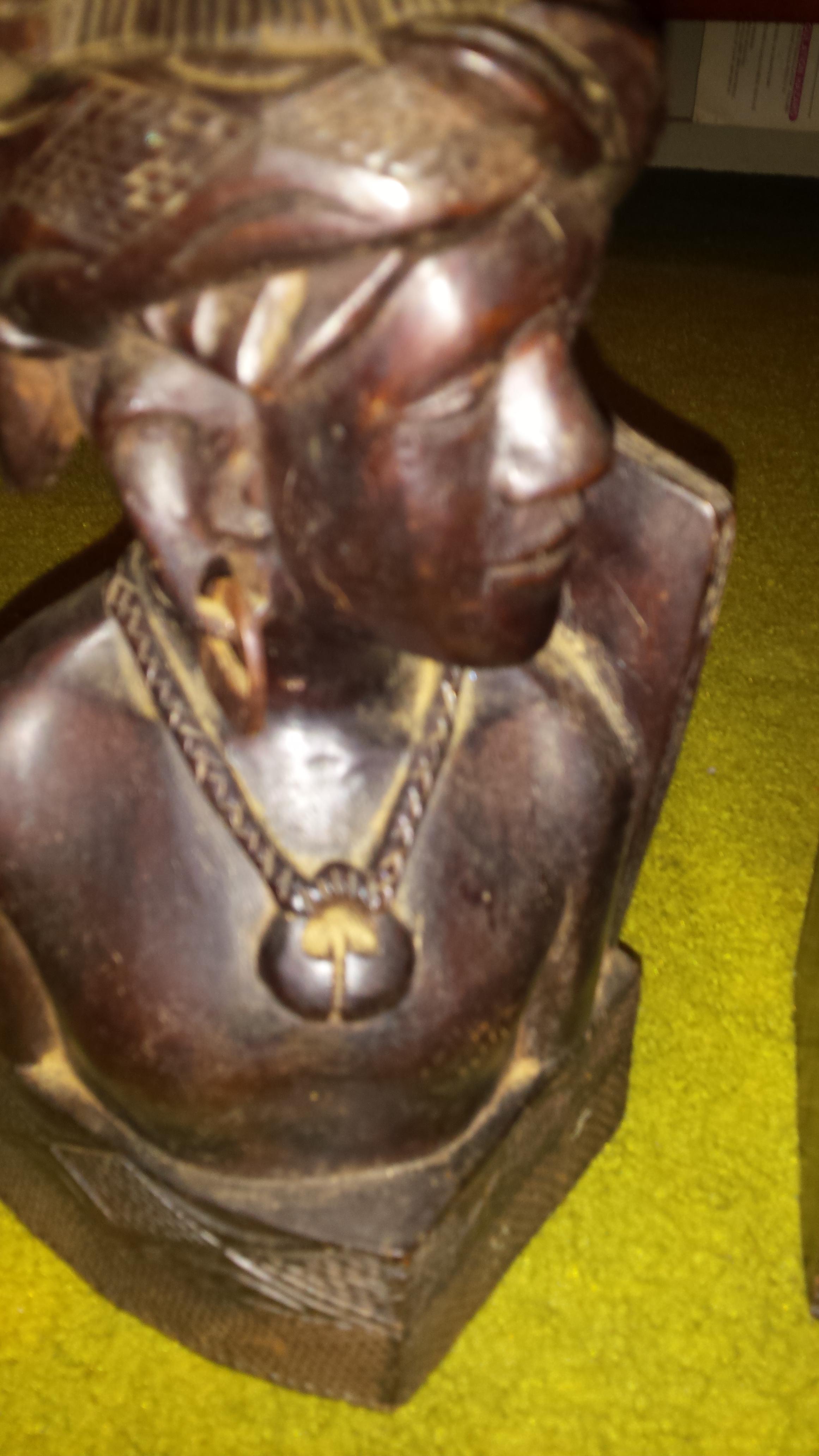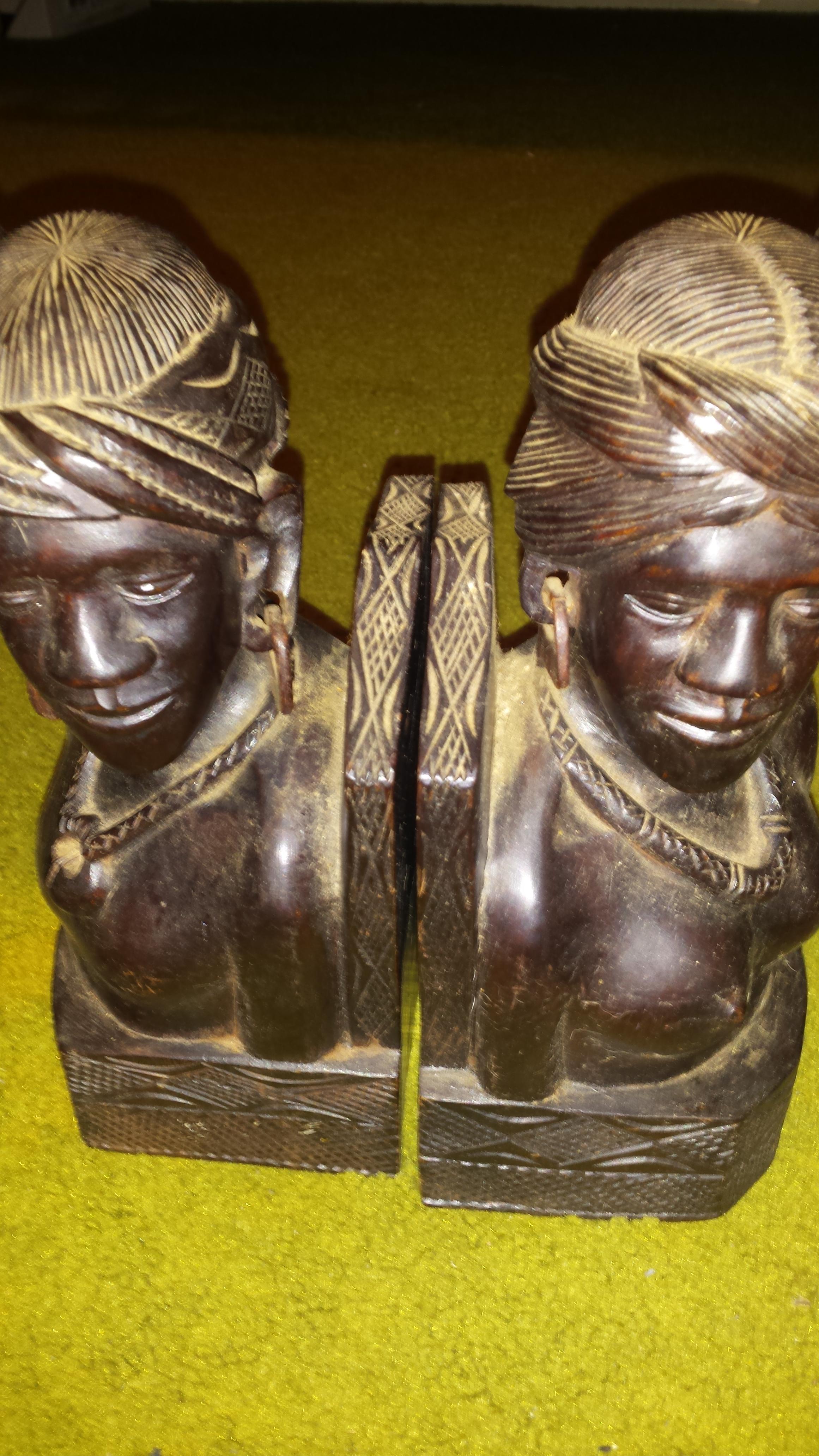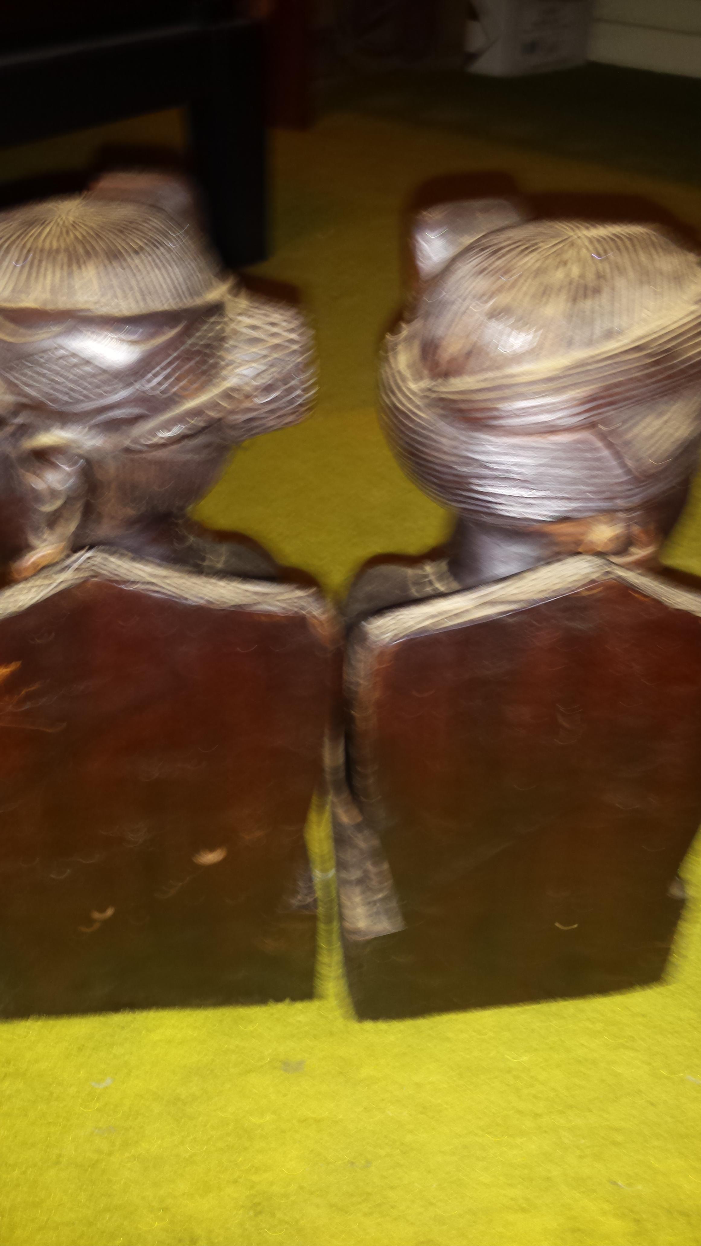 Two hand carved wooden busts / book ends of an African man and woman. No signature but a roughly engraved number 3 on the bottom of each. I don't know what kind of wood it is.