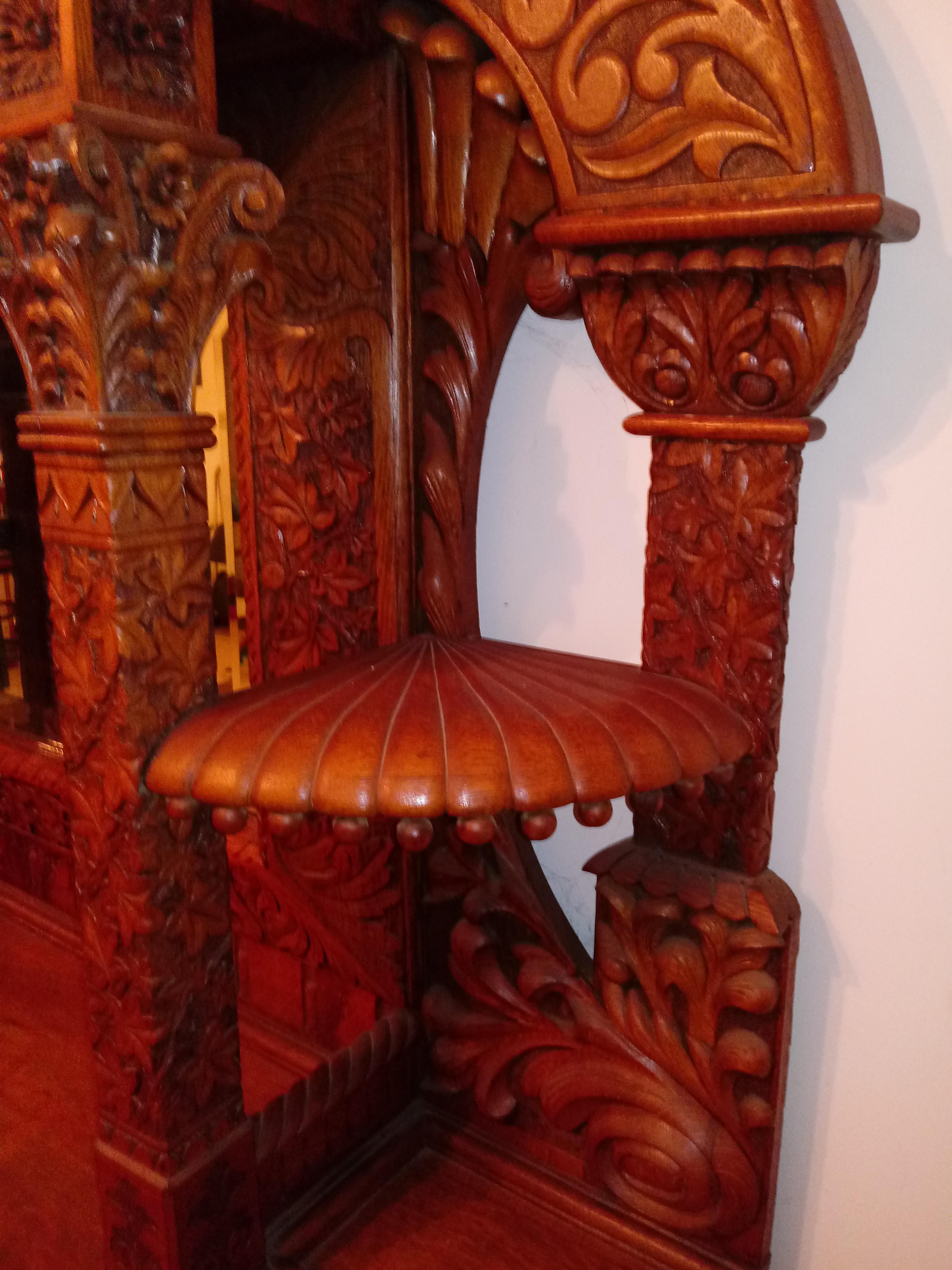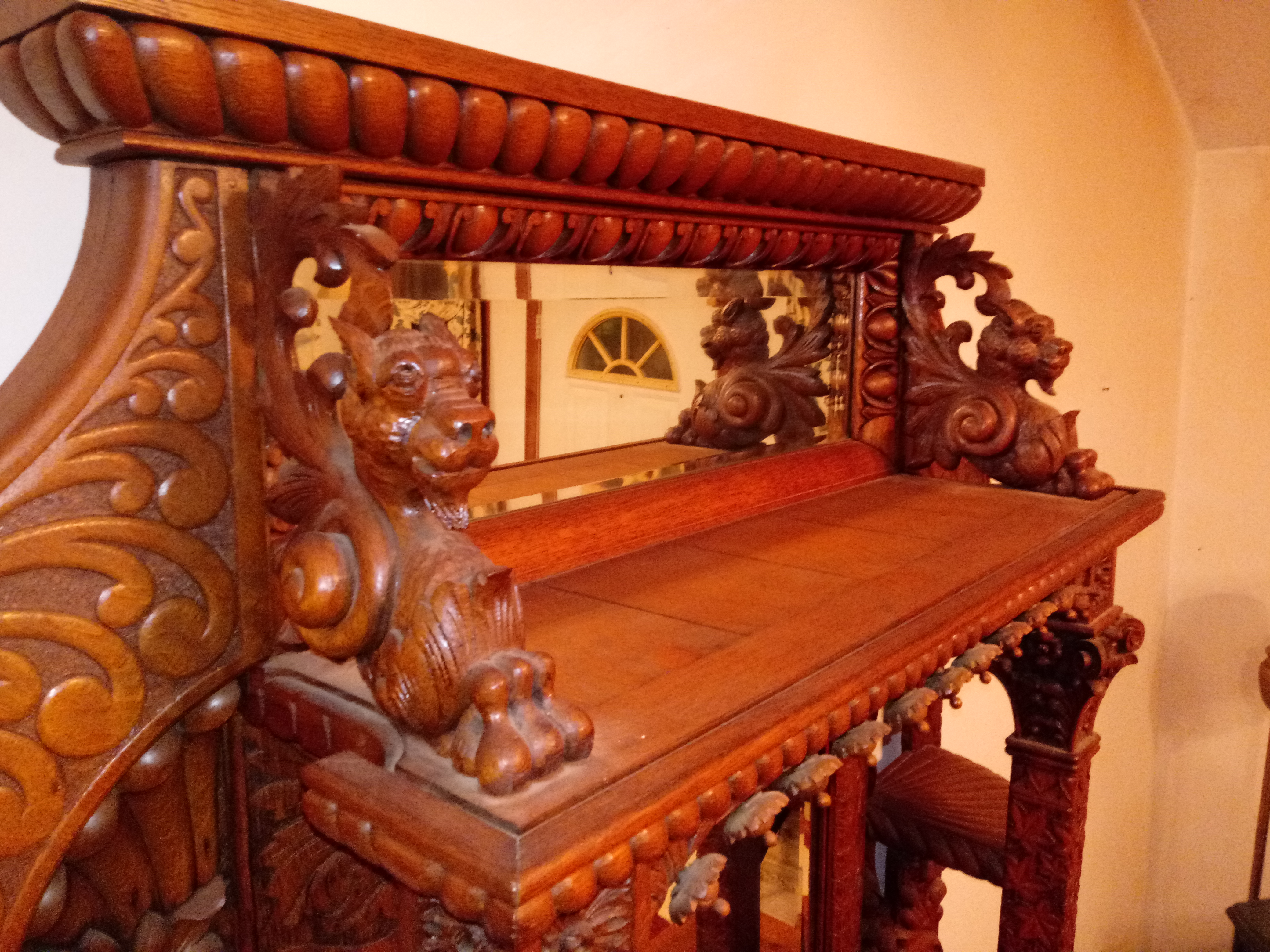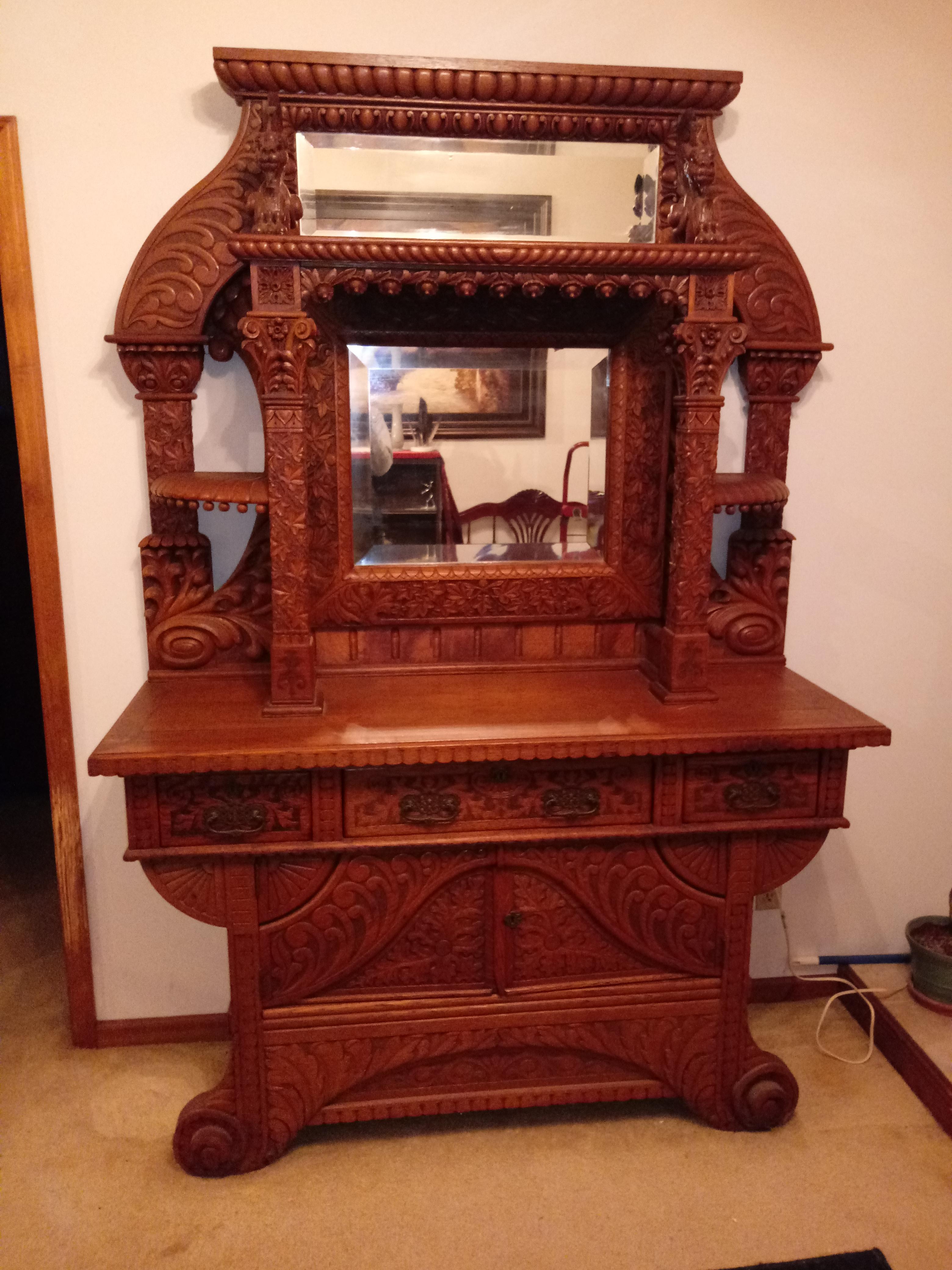 My father purchased this piece at an auction in the early 1980's. I'm not sure exactly what he paid for it, but I believe it was several thousand dollars. He said he bought it because he thought it looked like something that came out of a medieval castle. He told me he believed it was possibly a commissioned piece for a wealthy family, possibly royalty, with the work being performed by a skilled woodworker(s). It features 2 matching gargoyles on the top. It also has 2 beveled mirrors. There's also a small area on the design at the bottom of the left side post that was apparently left unfinished for "spiritual" reasons. The 2 front doors open up to a storage space. The board at the bottom of this space can be removed, and there's another "hidden" storage space beneath it. Any idea what the value is for this piece? Not planning on selling it. Just wondering what it might be worth. Thanks!