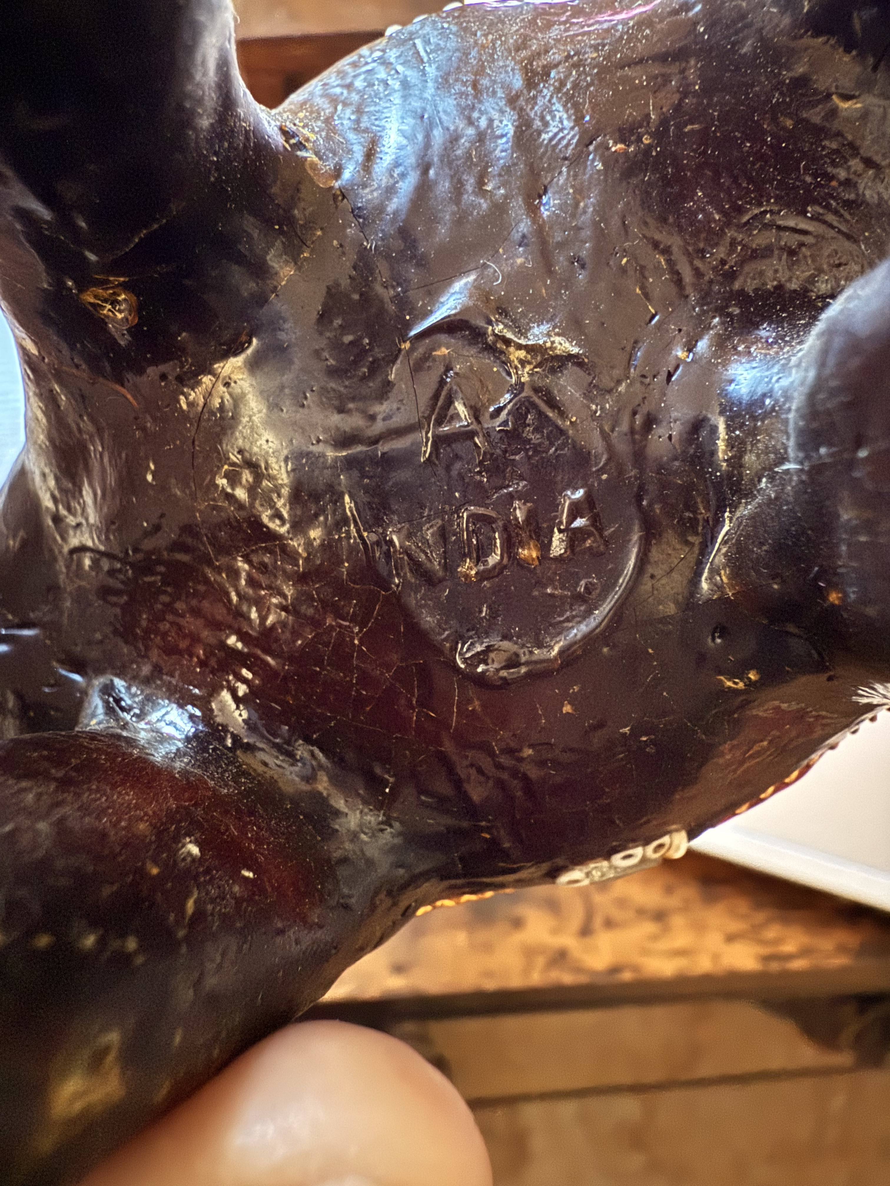 This mark suggests export from India, likely sometime between the 1960s and 1980s when tourist-oriented crafts from India became widely available abroad. The "A" above "India" may indicate a regional workshop or artisan designation, but it is not a documented manufacturer’s hallmark.