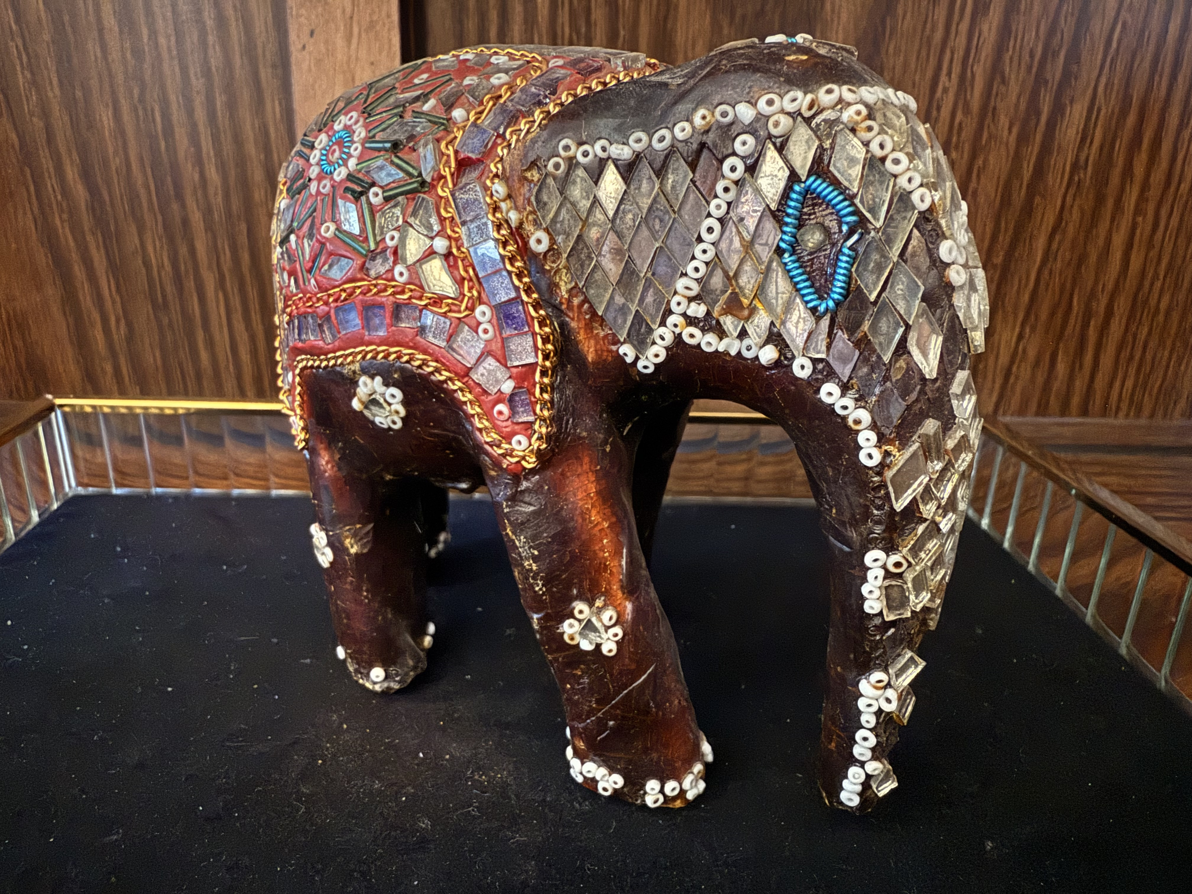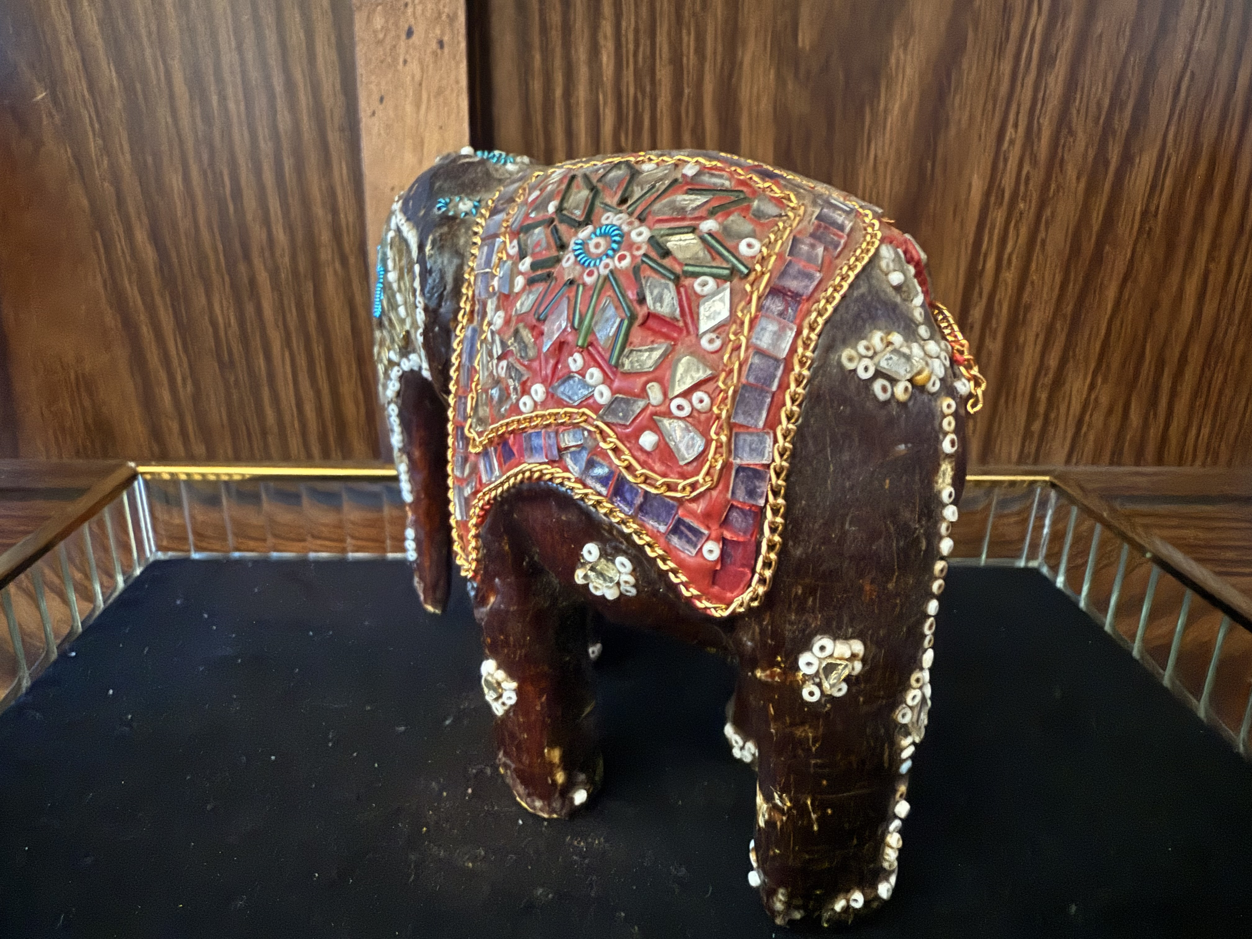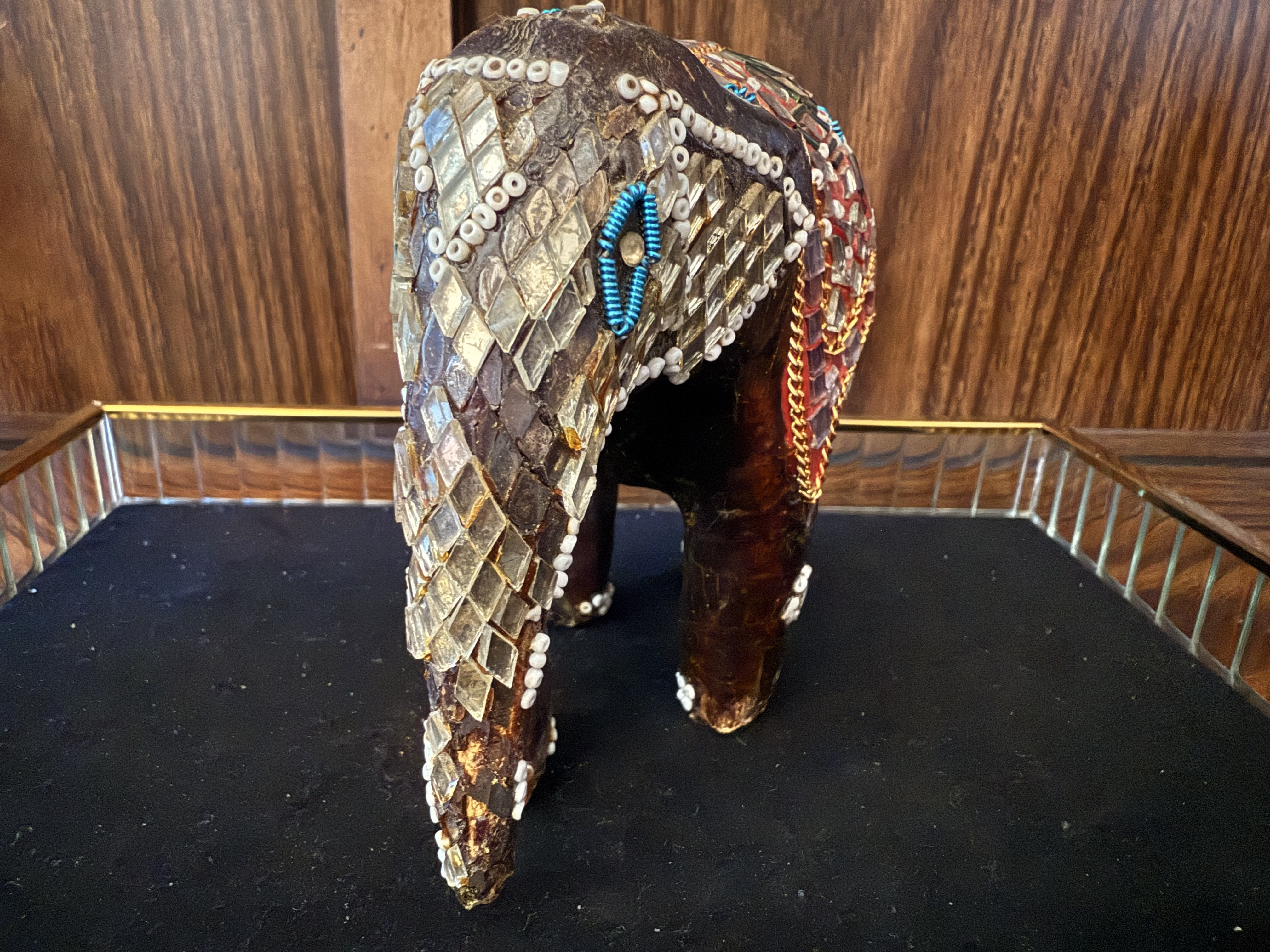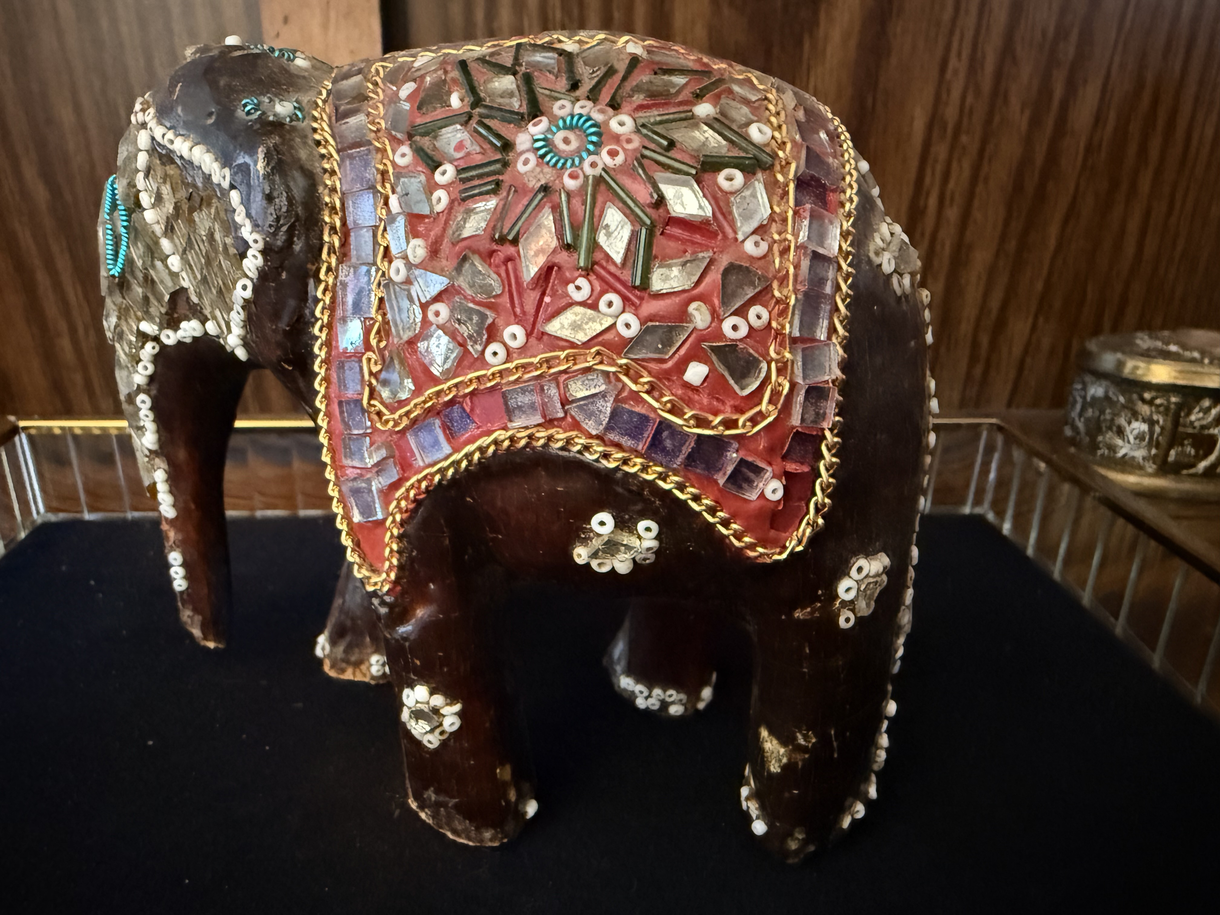 This hand-carved elephant is believed to be of Indian origin, a common theme in traditional Indian handicrafts. The intricate use of beads and glass reflects the rich artisan culture prevalent in India, particularly in regions known for their craftsmanship.