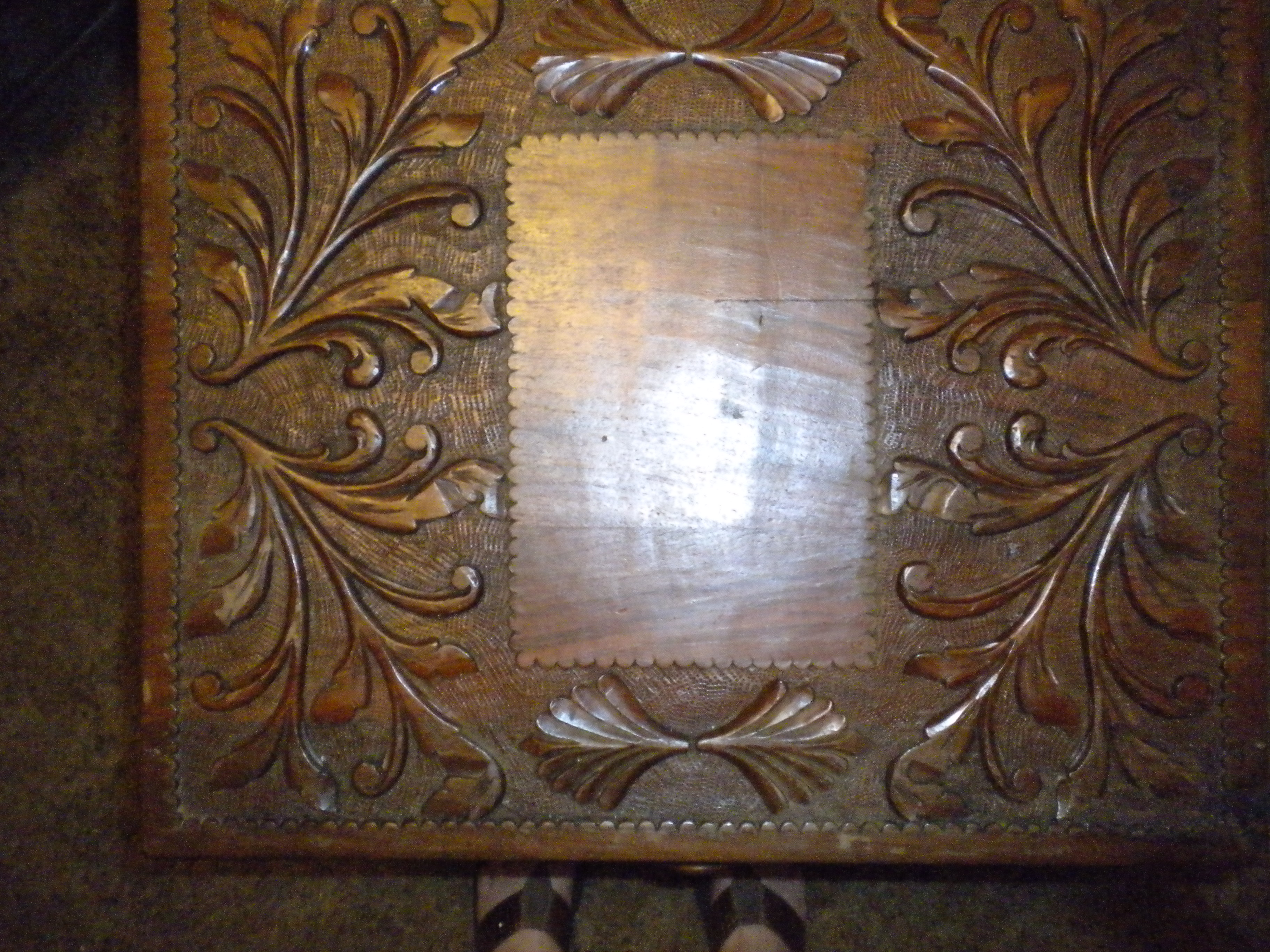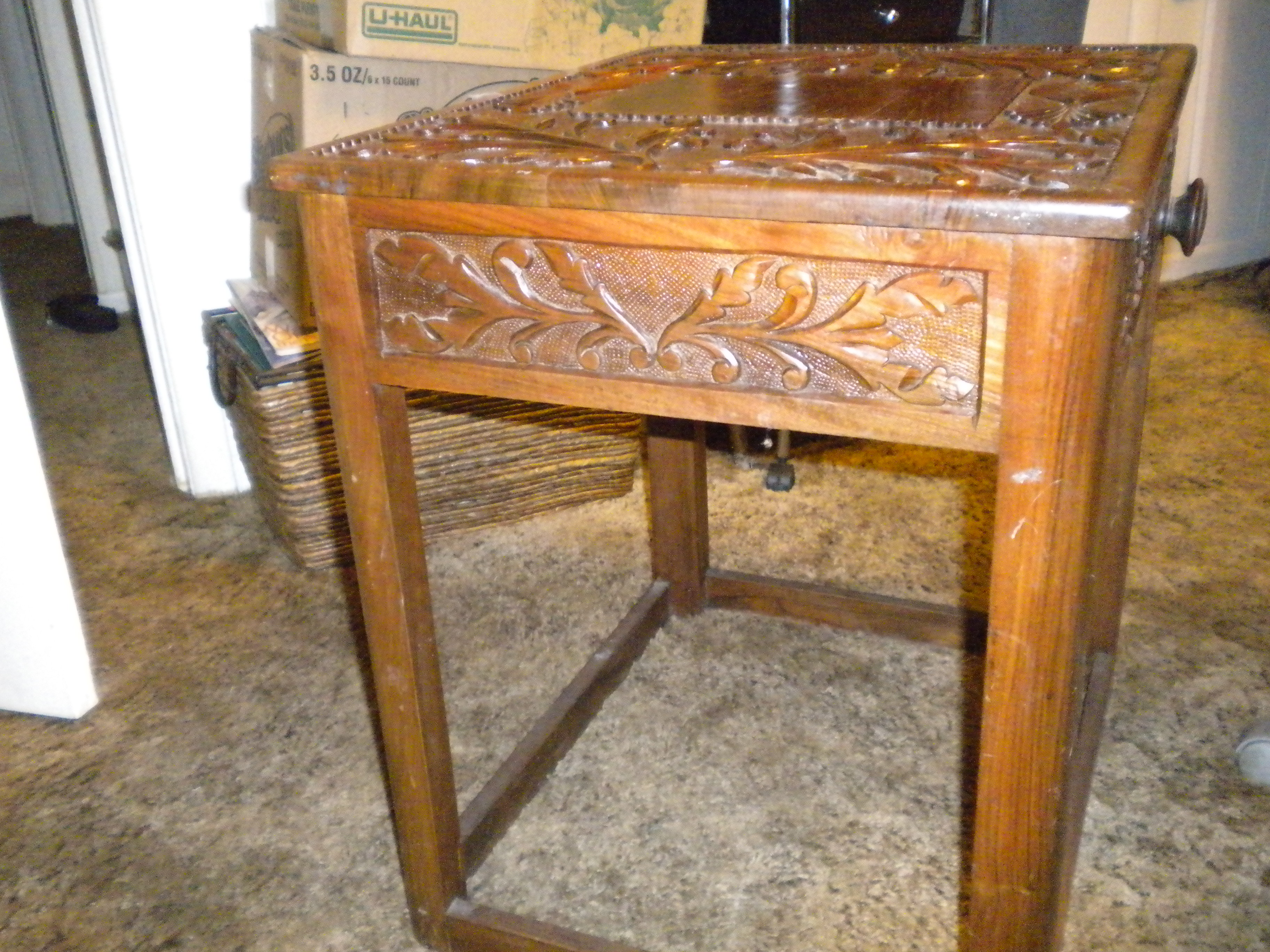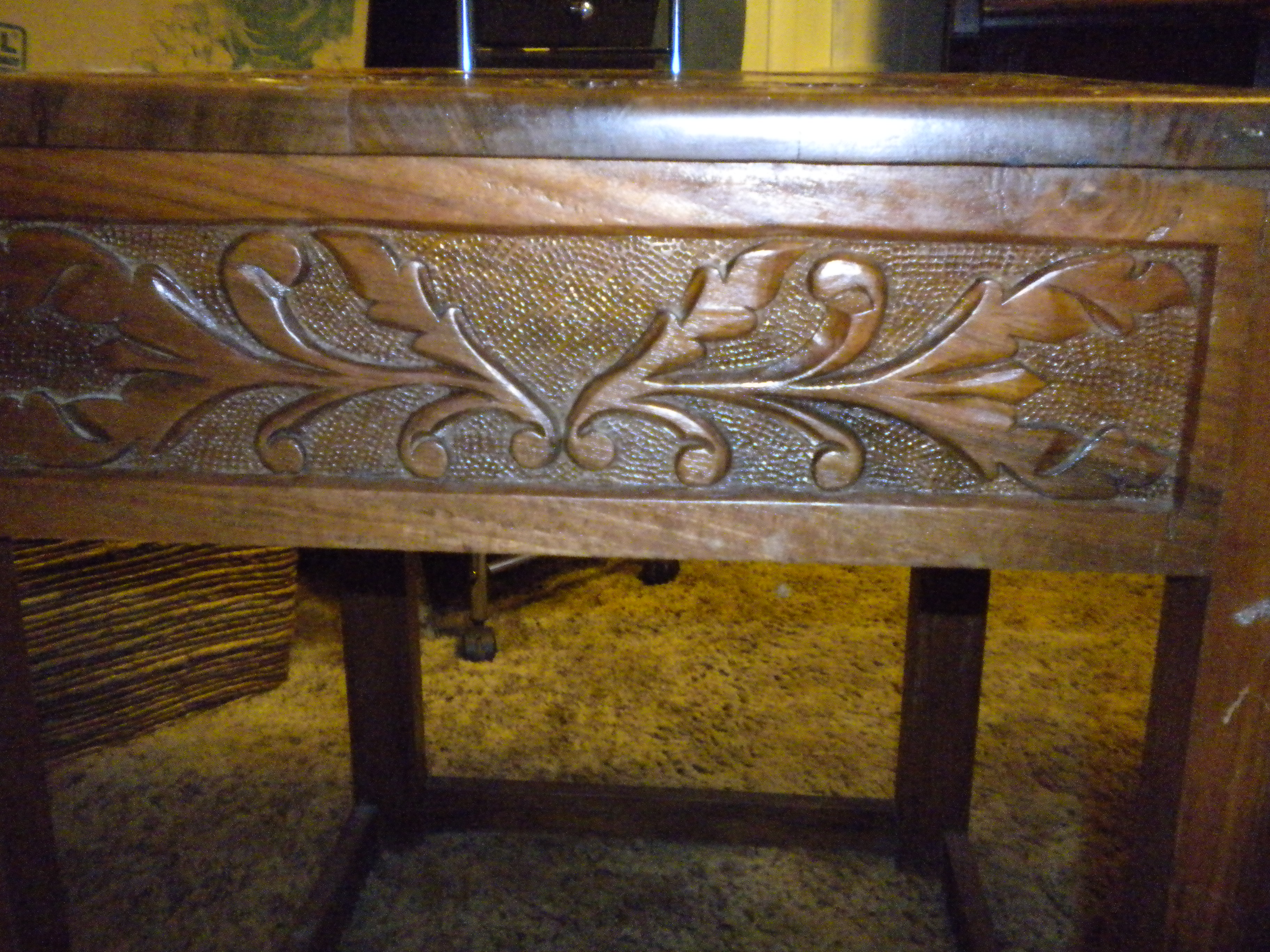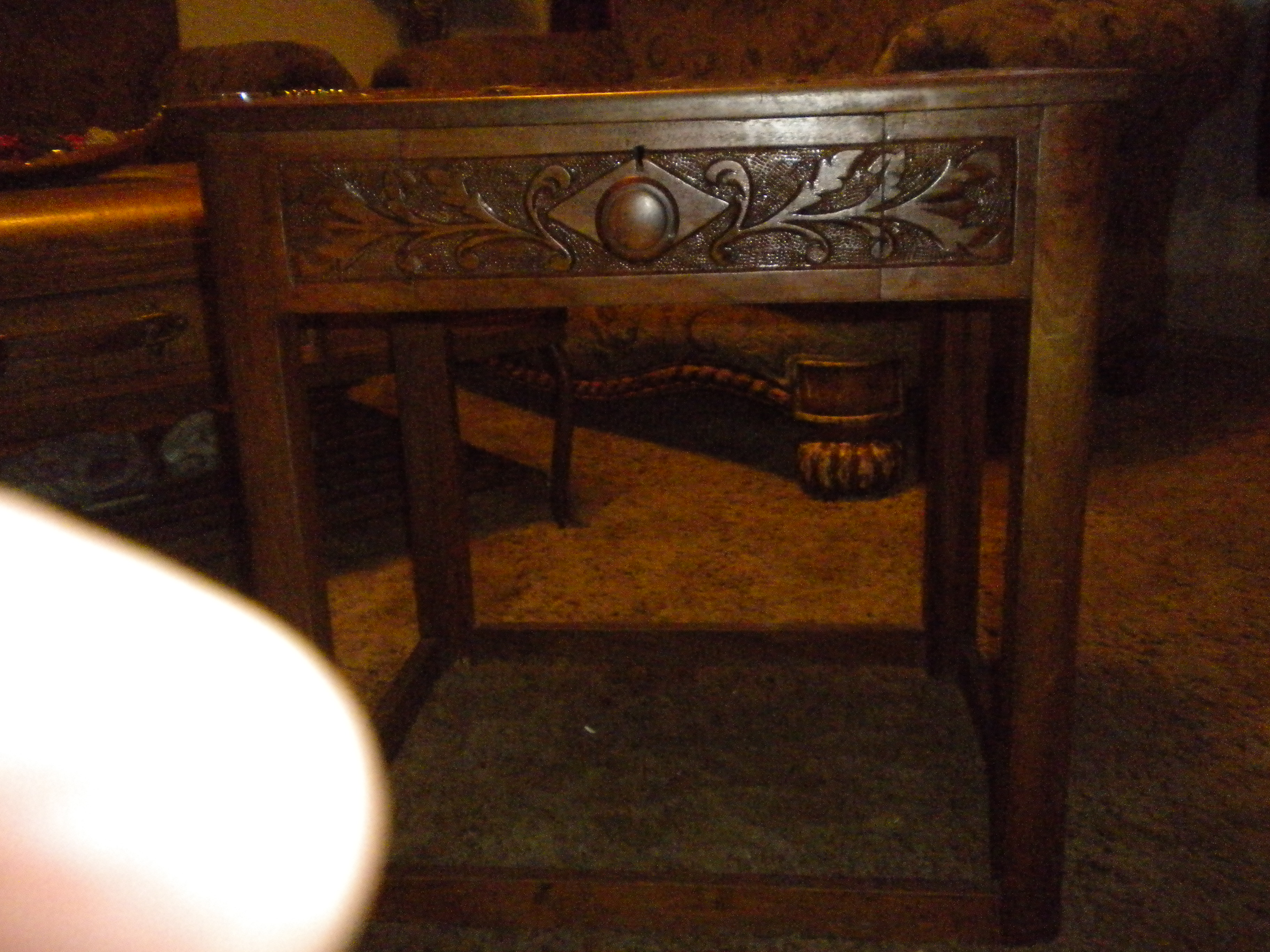 I bought this table from an individual who was moving - he didn't have any history of the table. I believe it to be hand carved. There are no markings on the table by the maker, that I can see or find a nyway.  The table measures 19 1/4" x 23 1/2" and is 24" tall. The knob on the drawer is not the original. There is a small keyhole in the drawer. I am not sure even of the wood used.