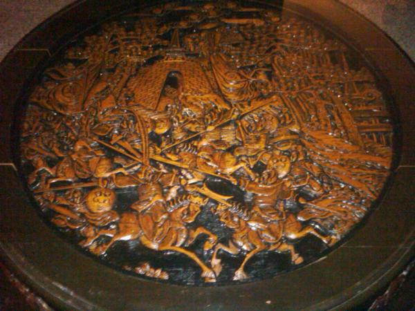 It is a round, hand carved, Asian, tea table with glass top and matching stools. the center carving is a extremely detailed Asian war scene. The sides are hand-carved with dragons at the top of each leg, and villages scenes between each leg. The are 4 stools with similar carvings all legs are detailed as well.