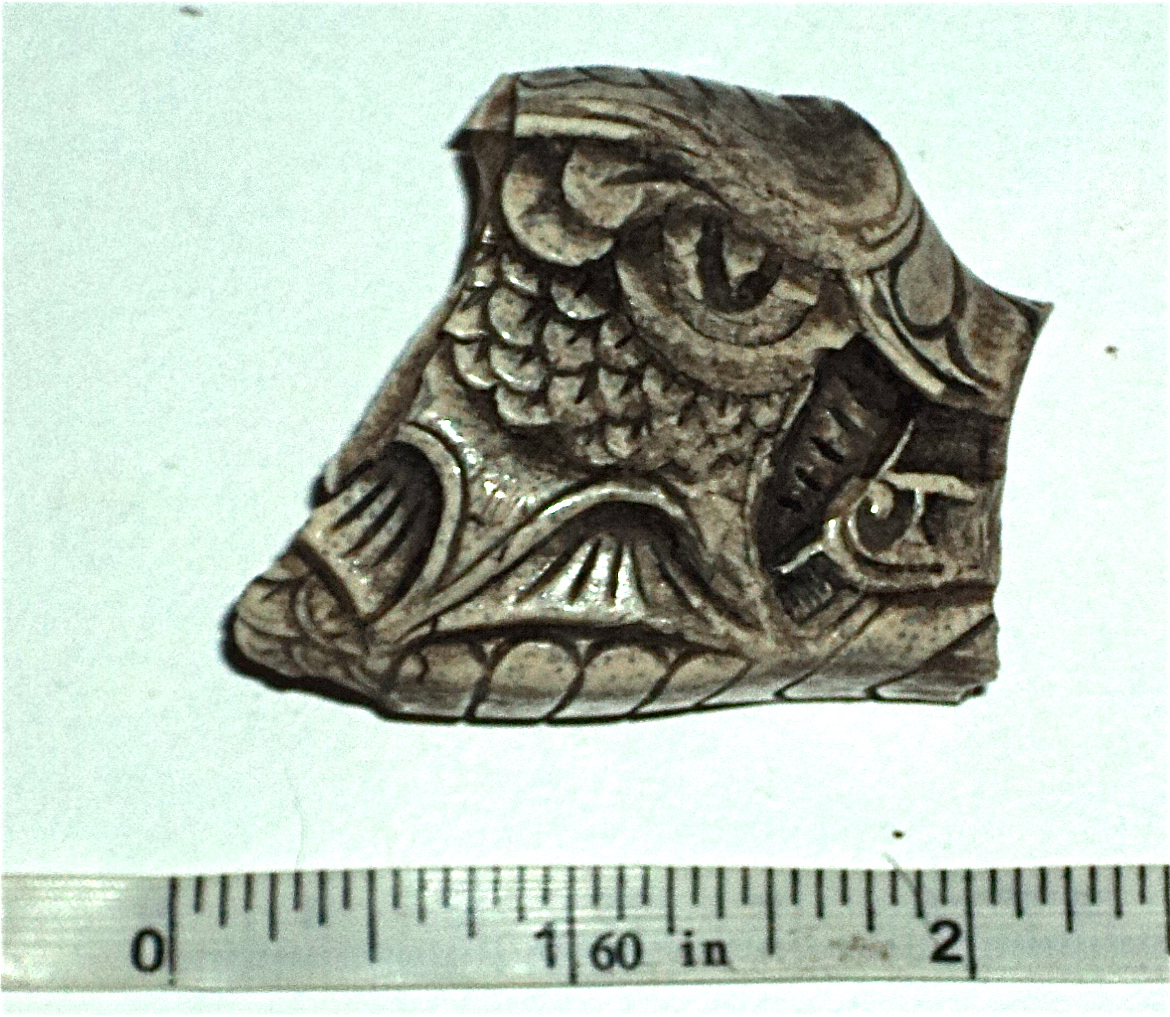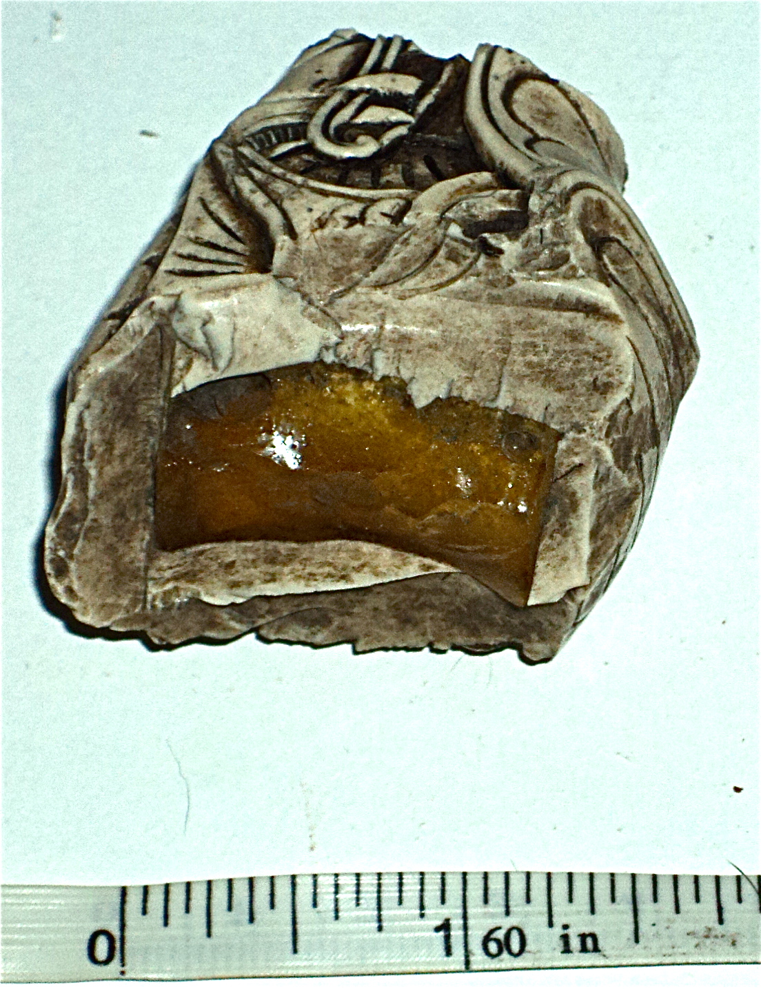 Found it buried in my yard when excavating for new drain pipe, it was under the stump of a large tree we removed. I live in a 120 year old home in the city of St. Louis. I am mainly interested in identifying what the figure may have been in whole form. I have done a bit of research and have not found any type of ivory carved figures with a gemstone/mineral interior like this one has.