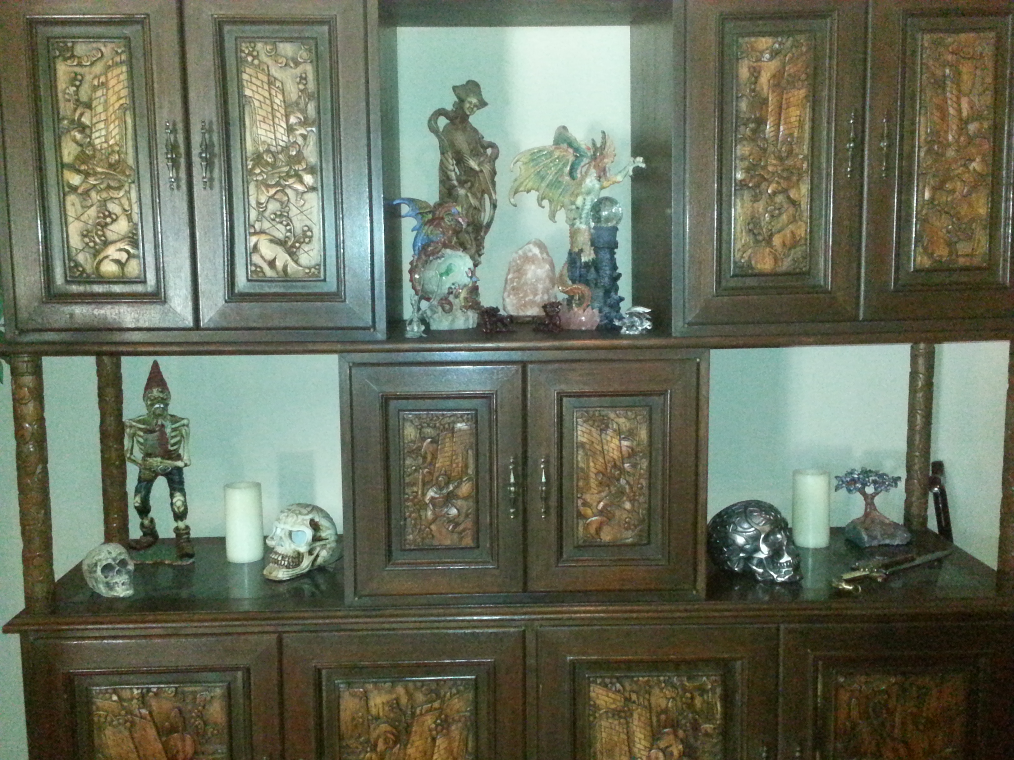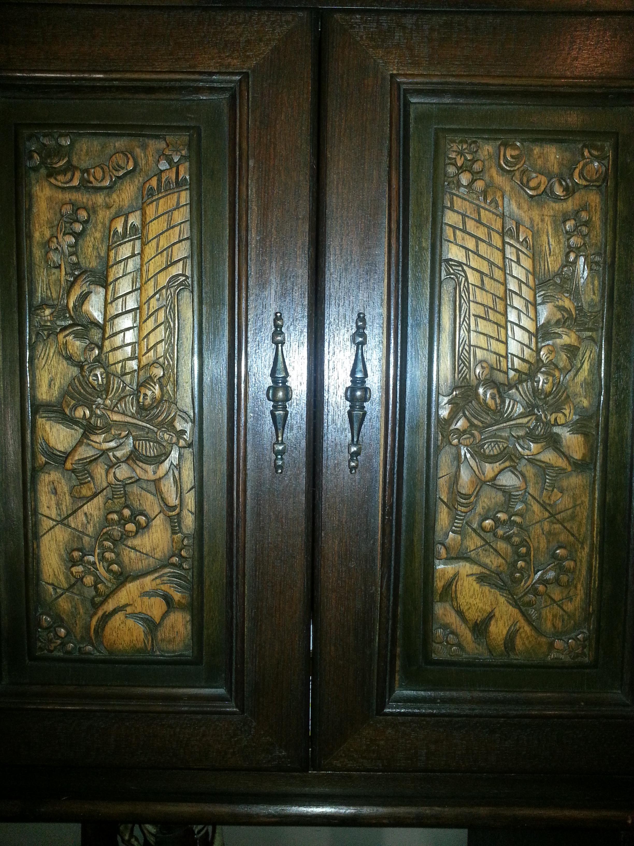 Has five sets of double doors, all with unique carvings. One door is missing handle.