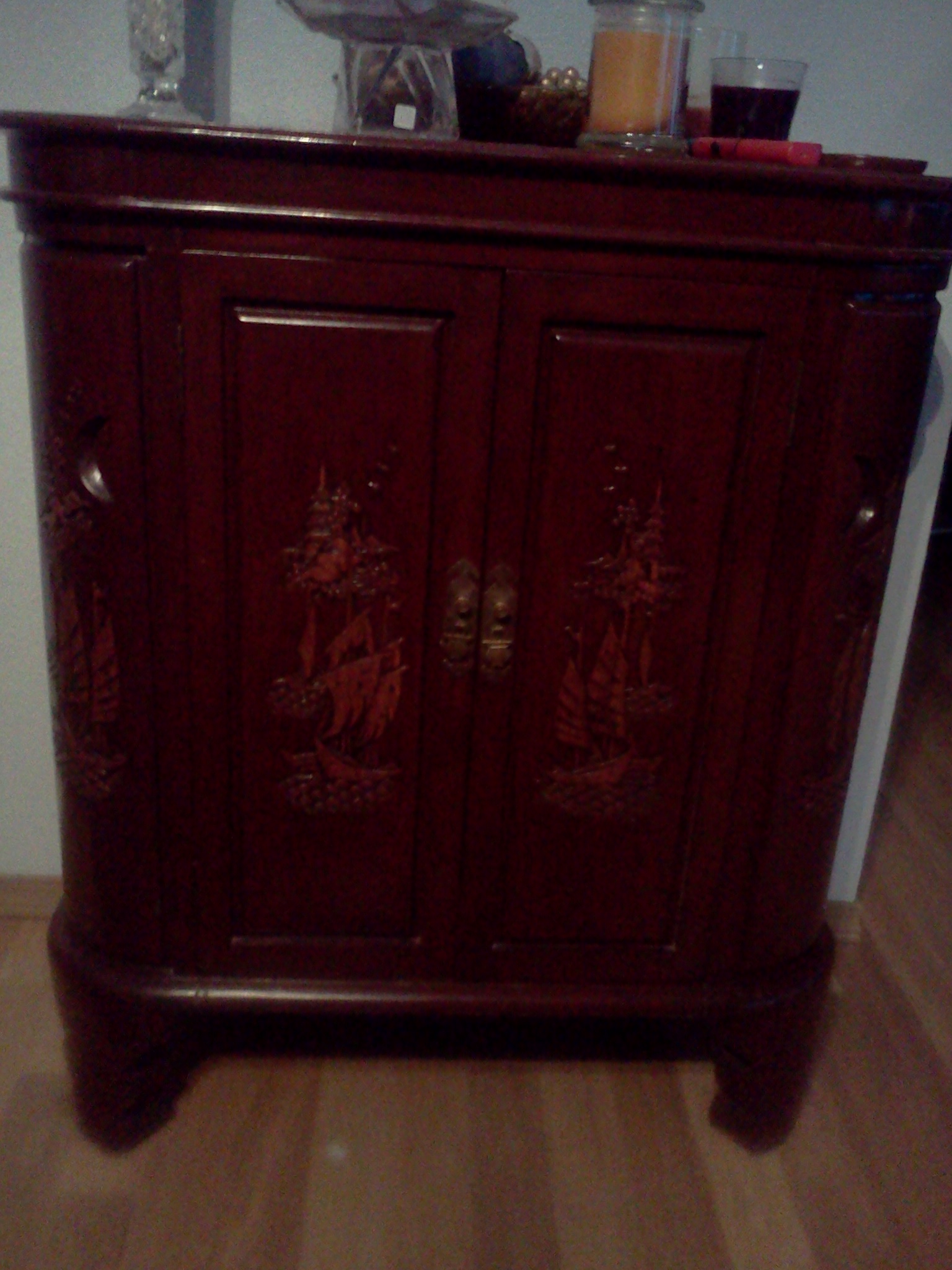 Hand carved Japanese Cocktail Bar brought back from Japan in 1959. In close to pristine condition. Opens up to a liquoe bottle storage, two places to hang glassware and two doors open to shelves. The top opens and folds out to make a countertop for mixing drinks.