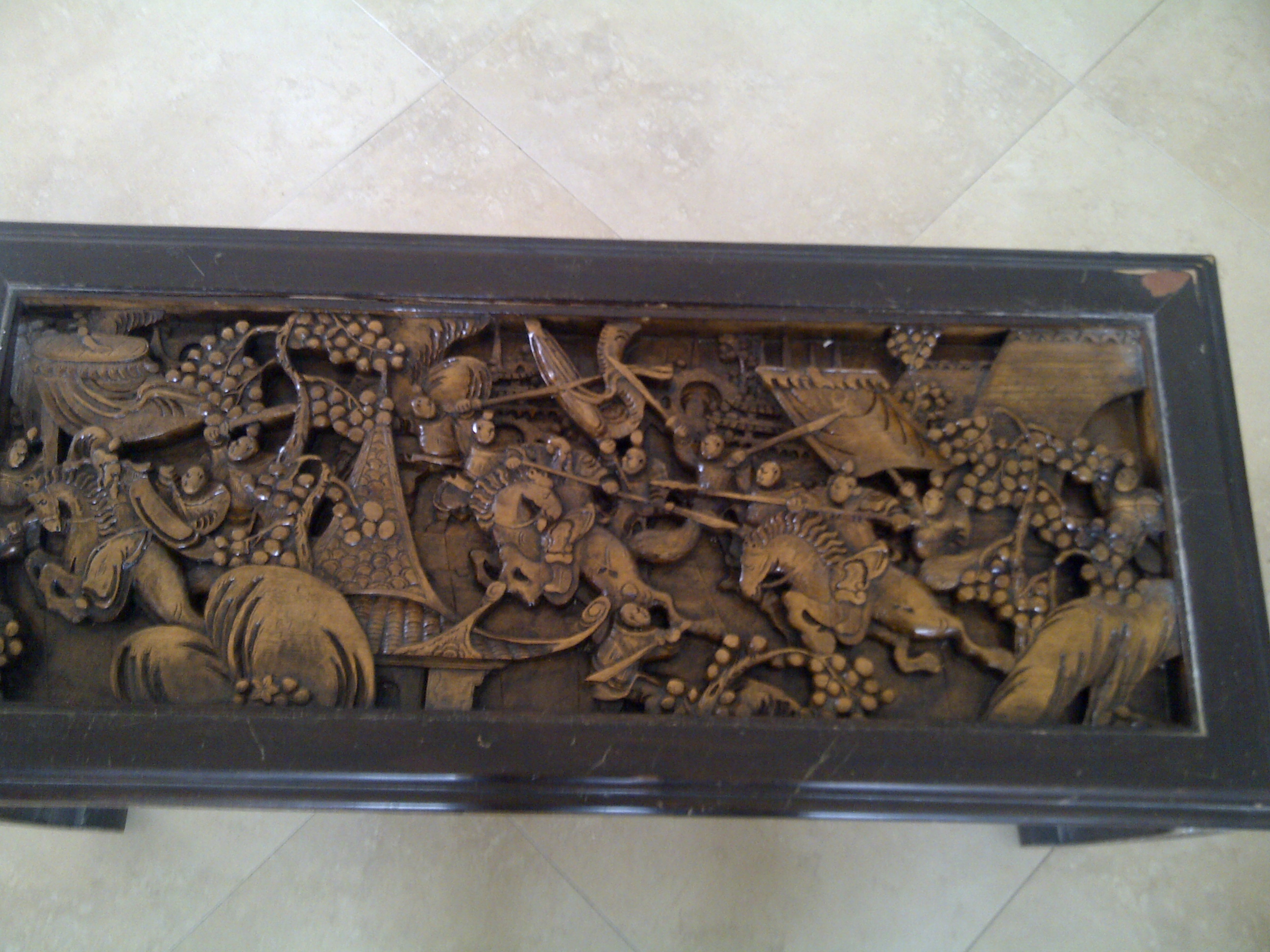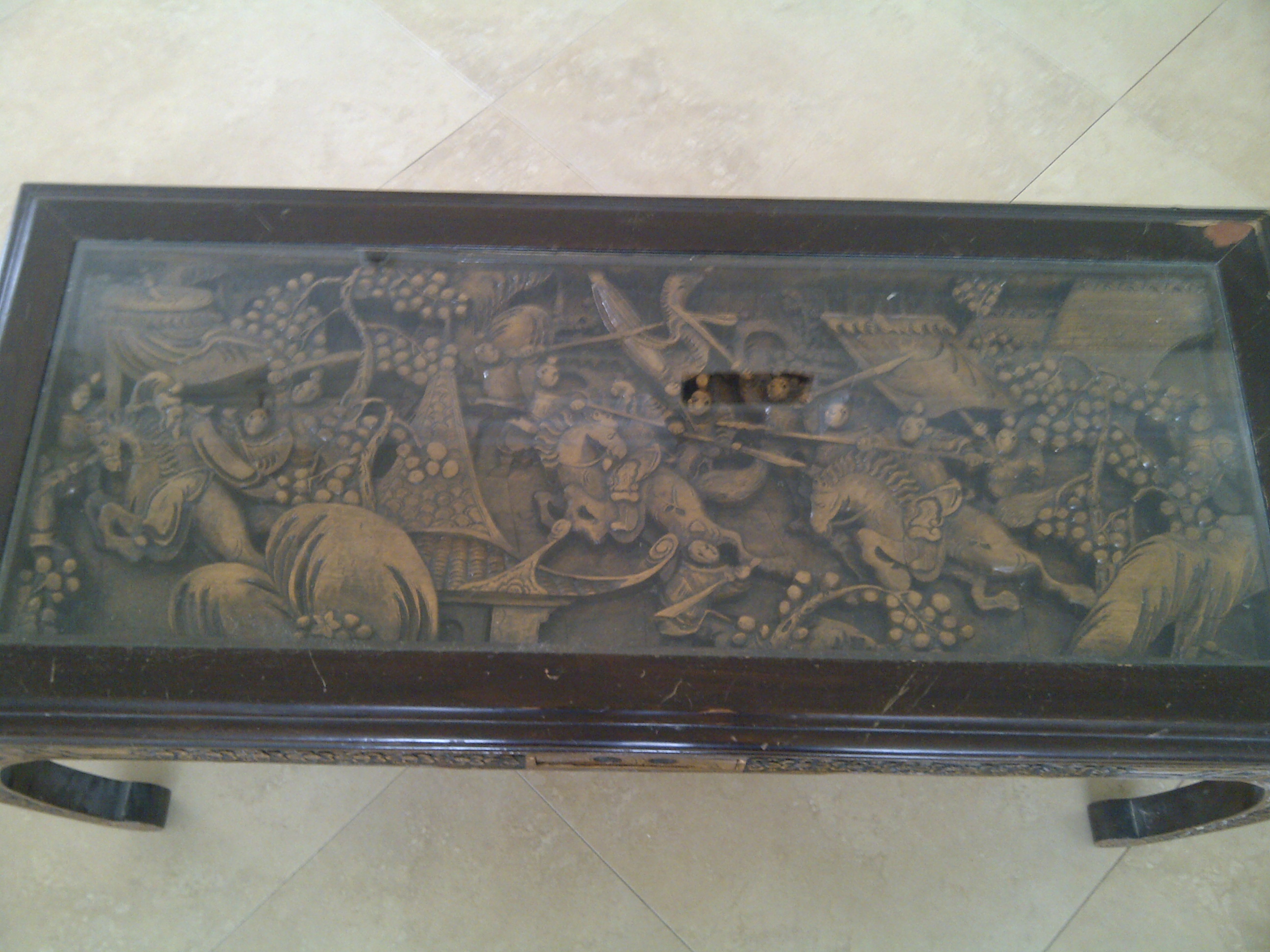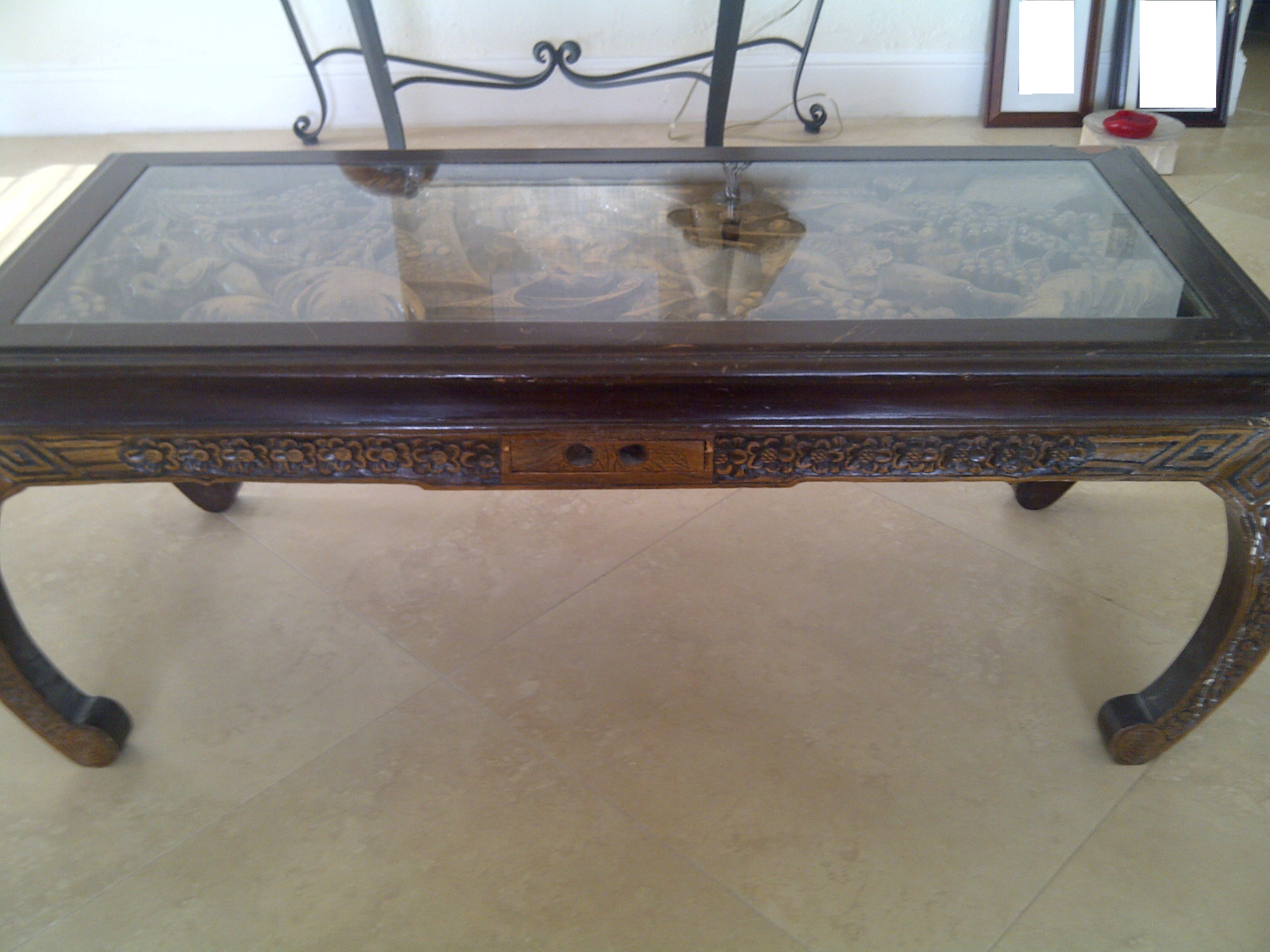 Hand carved Japanese coffee table.  Has some damage on edges of coffee table.  coffee table has 1 drawer. Carving is perfect as it was protected under glass. All four sides are also