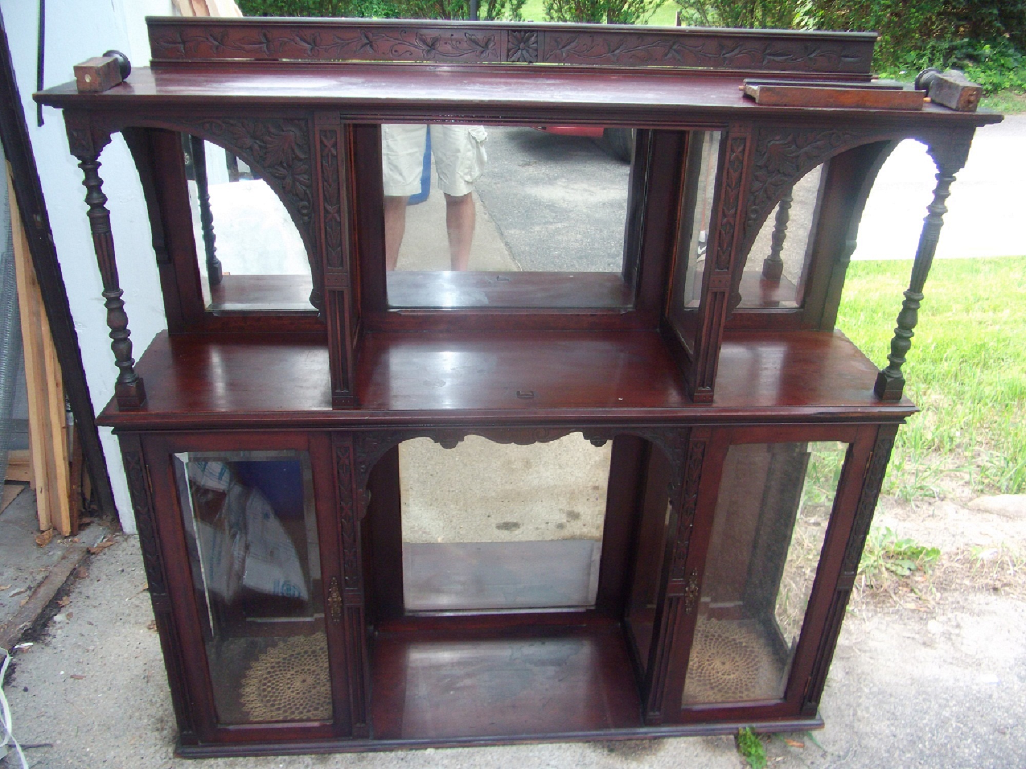 Re: Hand carved mahogany/ beveled glass curio