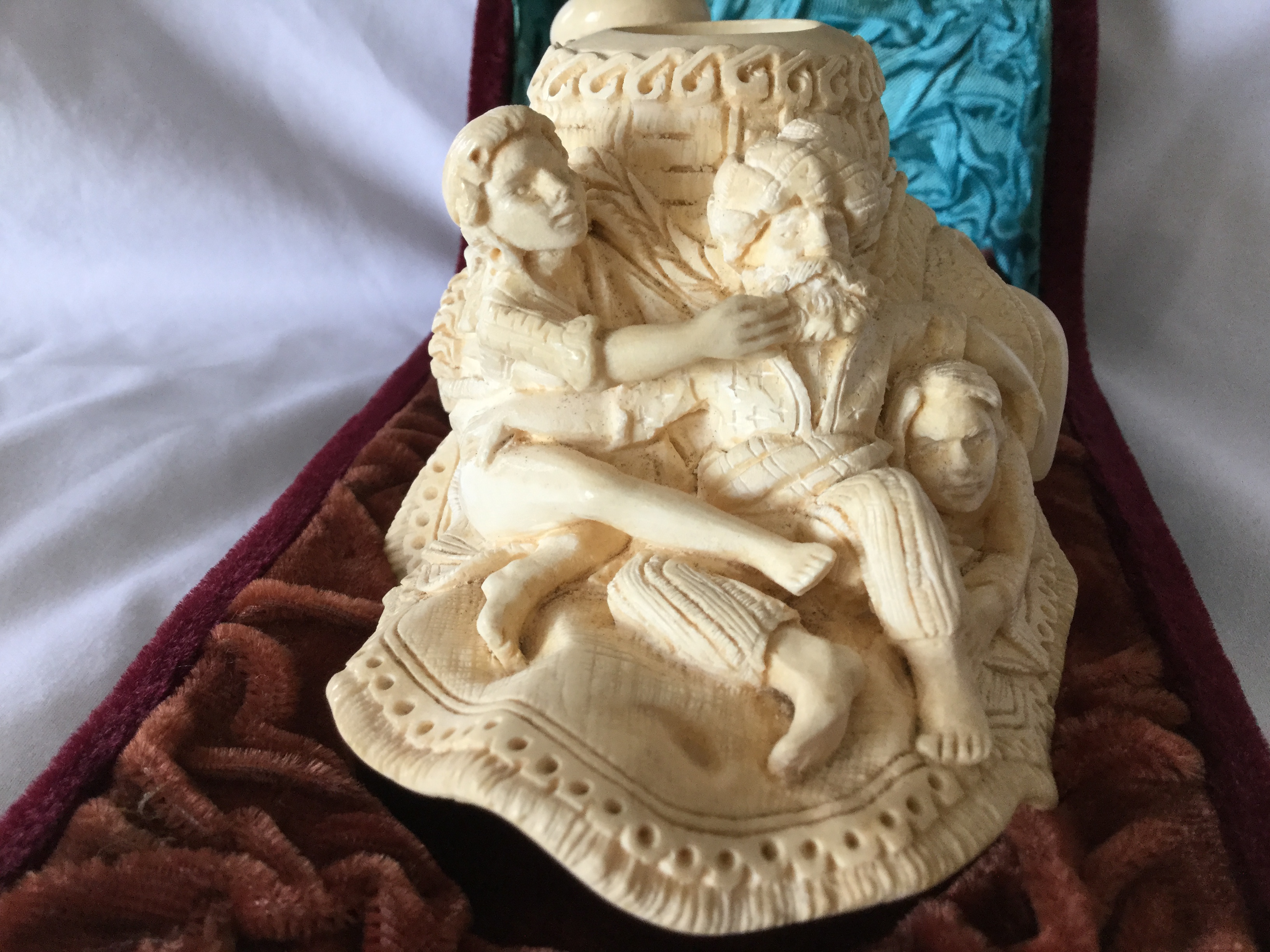 Purchased in 1983 at the Grand Bazzar in Istanbul, the hand-carved meerschaum pipe depicts a 'Sultan' along with two of his harem on a flying carpet. The never smoked pipe is approximately 5 inches at the base and is dated (983 - September '83), artist's initials (ES) and numbered (94) on the rim of the pipe stem. It is stored in a red-velvet case which includes a metal plaque identifying the pipe (SULTAN), the artist (Created by EYUP SABRI) and the location (in Istanbul). I am the original (and only) owner and purchased the pipe in while stationed in Ankara, Turkey.