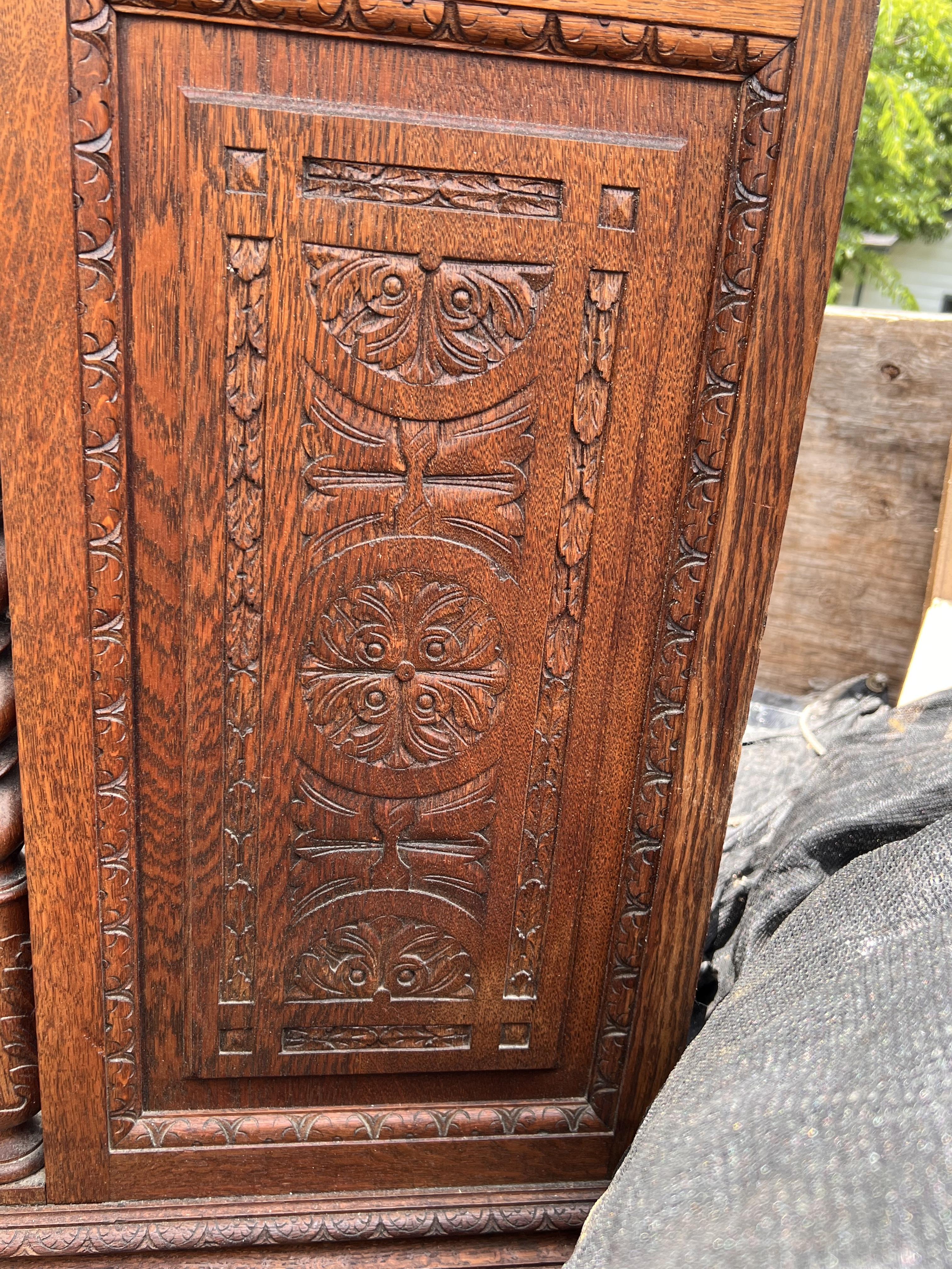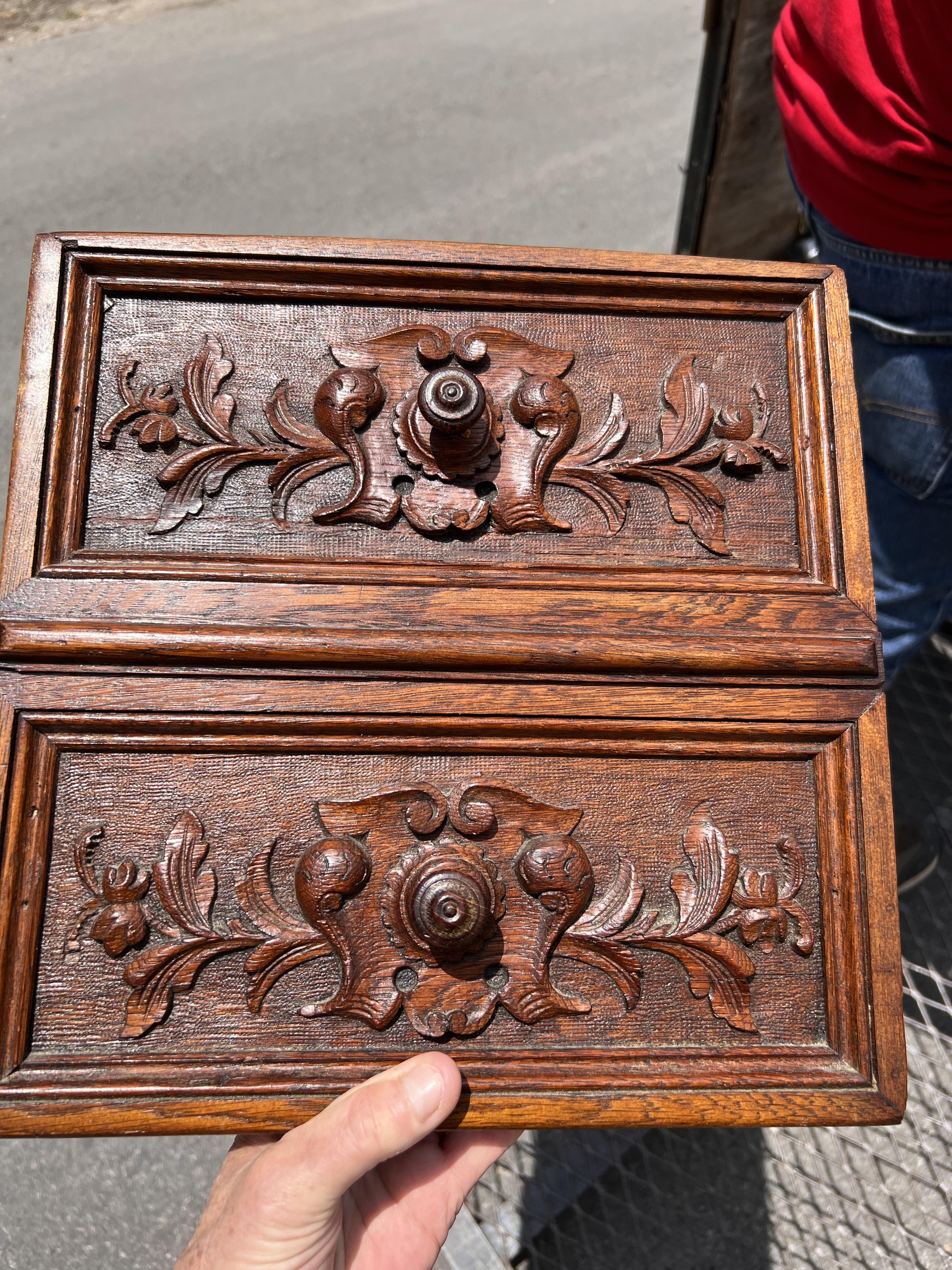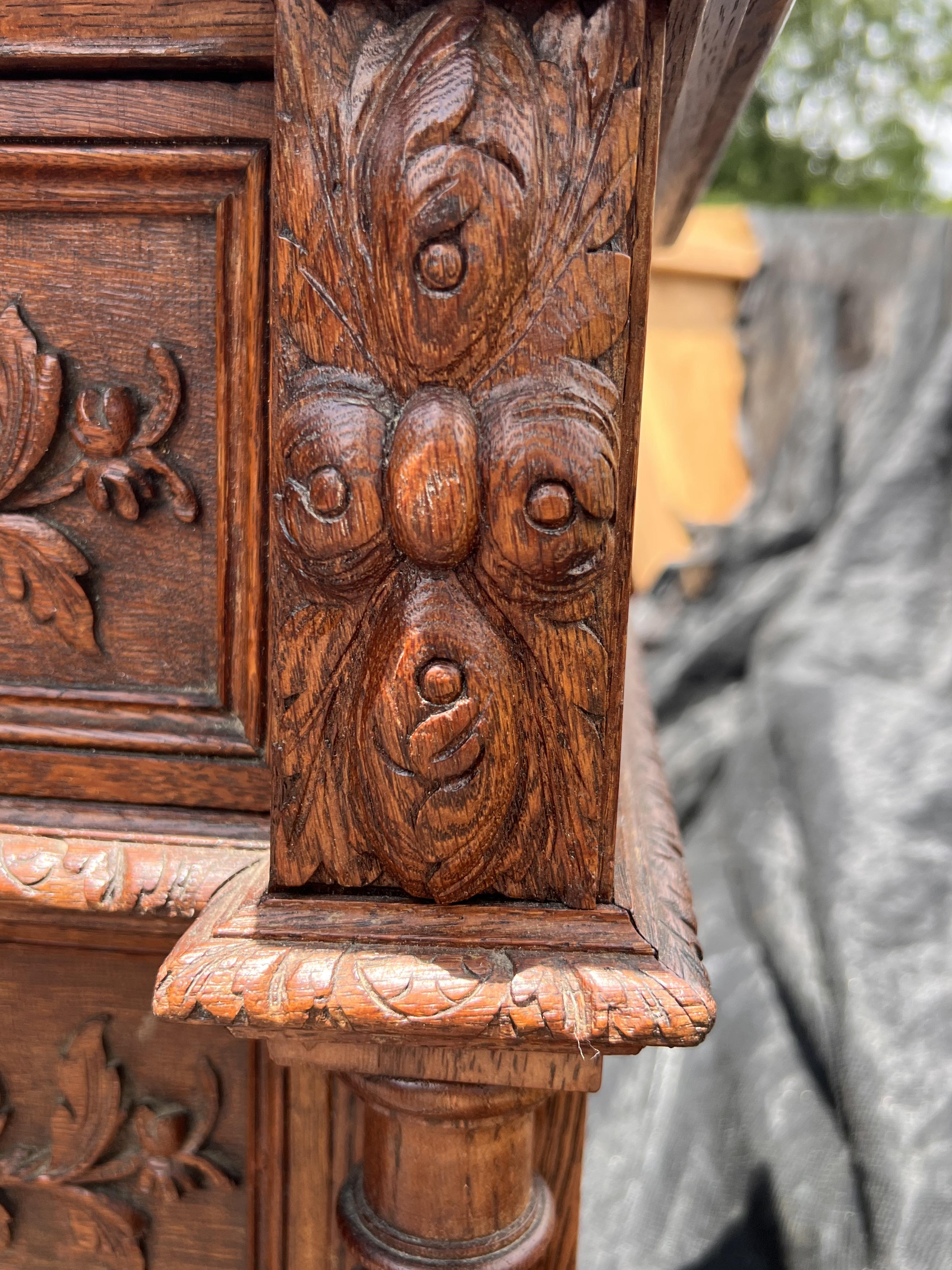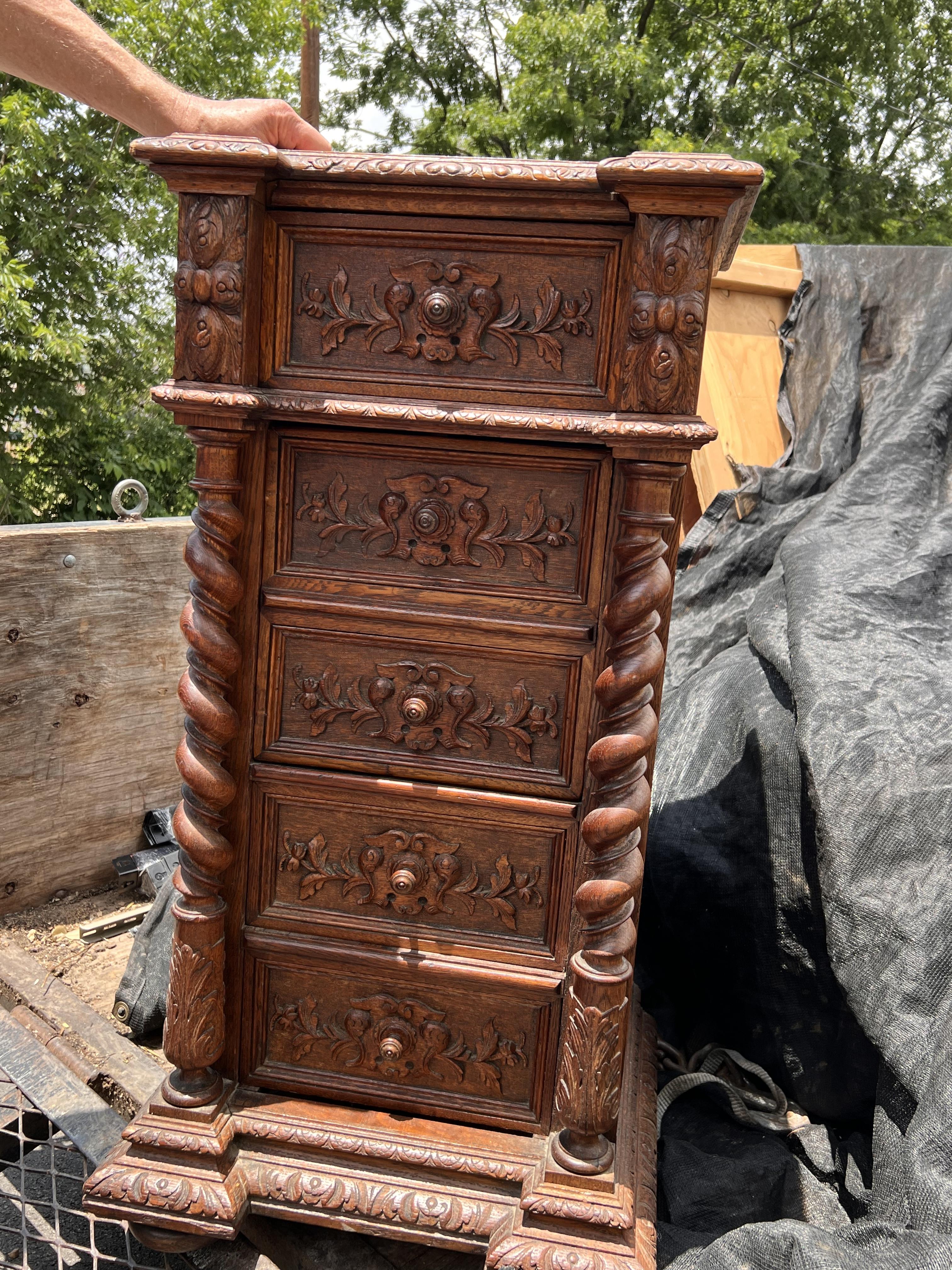 All hand built & elaborately 100% hand-carved cabinet with fitted marble top. Top drawer, then door two-drawers tall opens to shelf space, then 2 lower drawers. Definitely old, oak has darkened, never stained, surface seems to have only original old formula shellac.