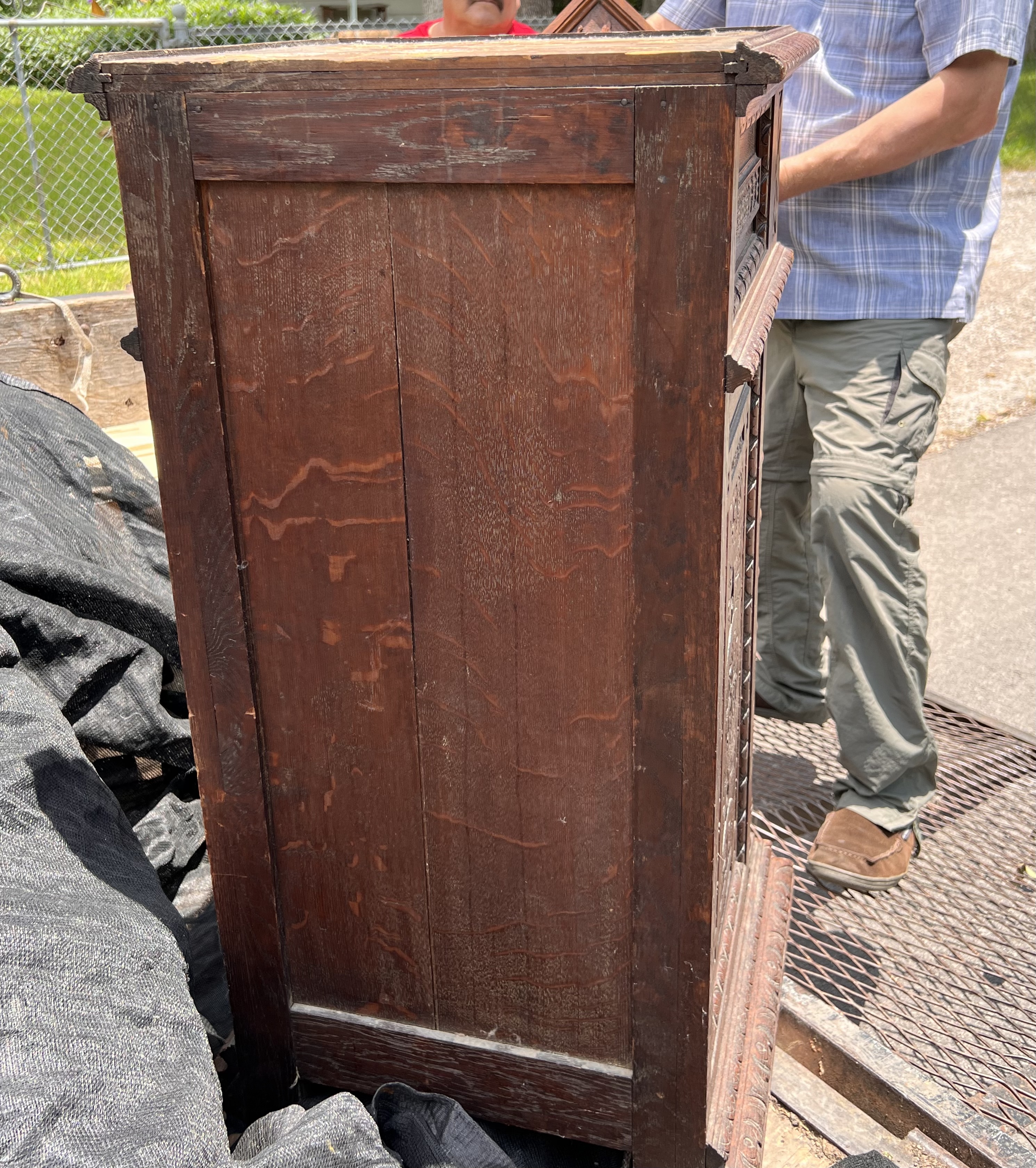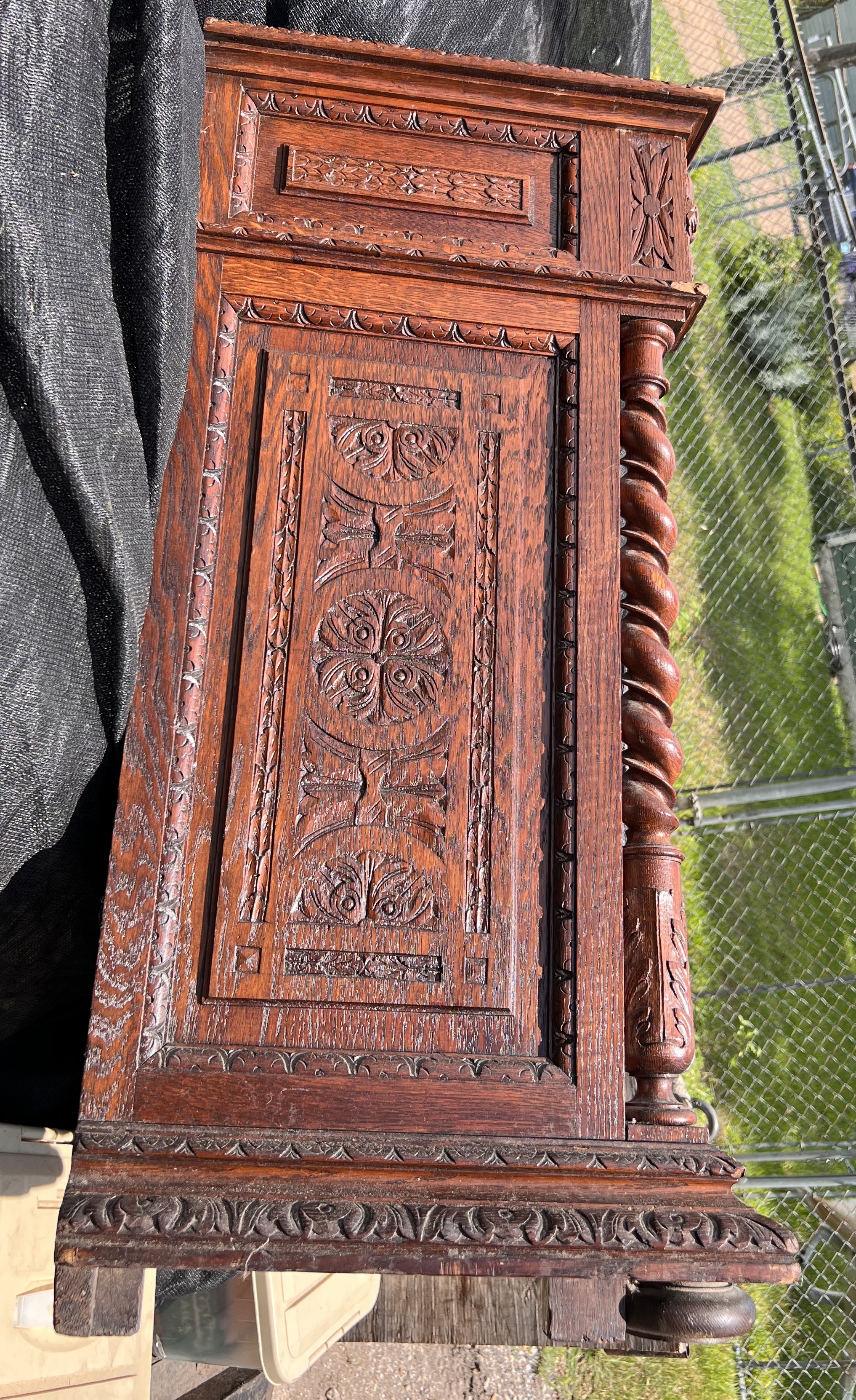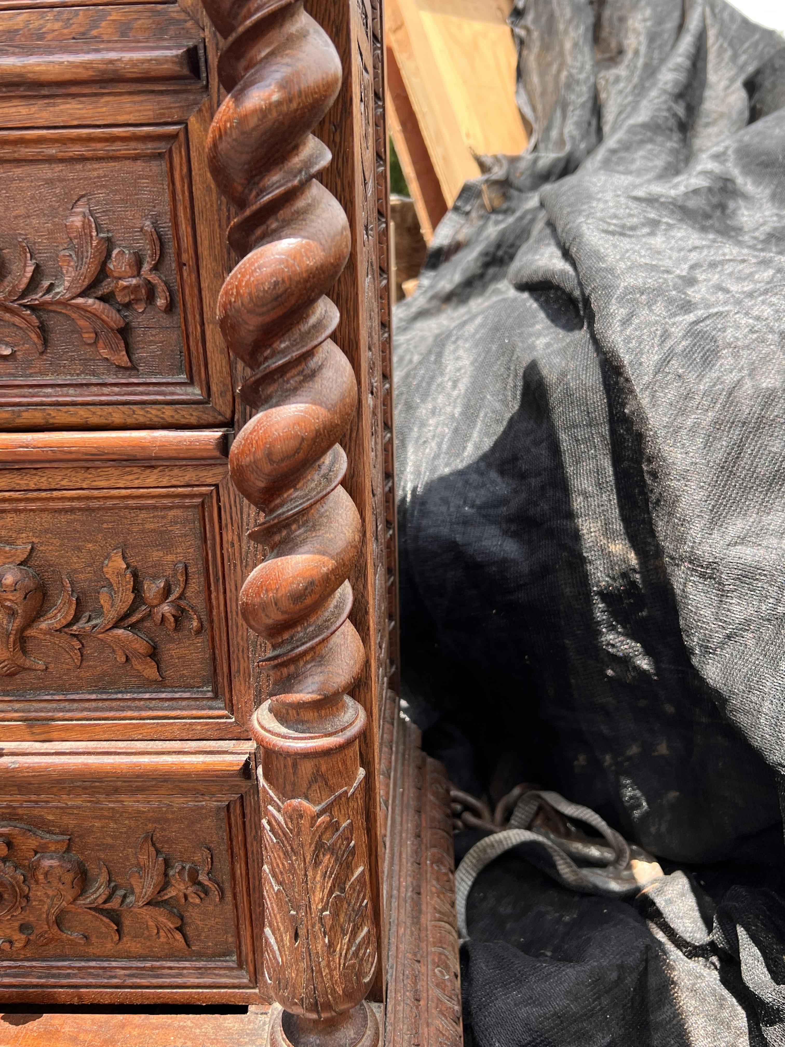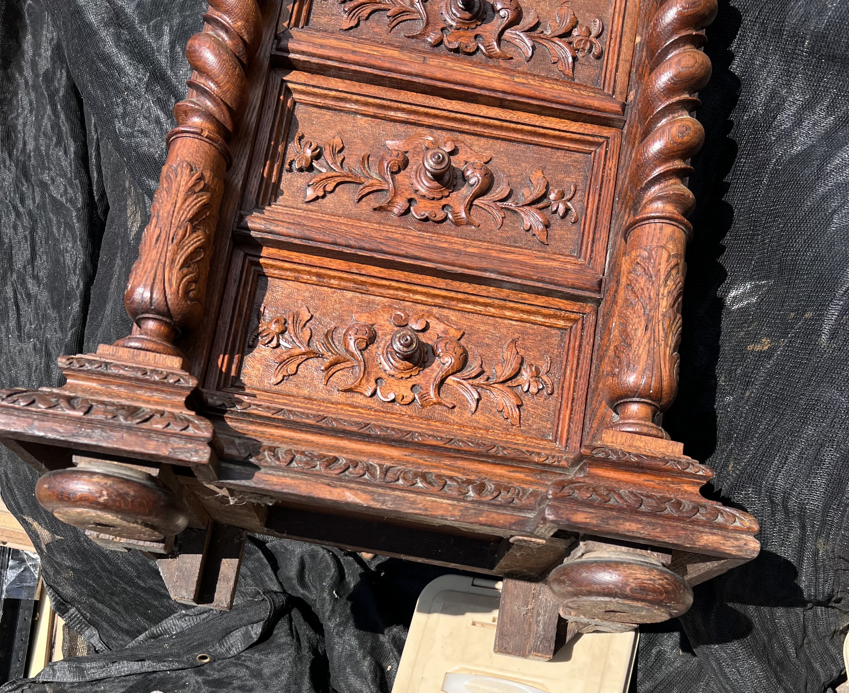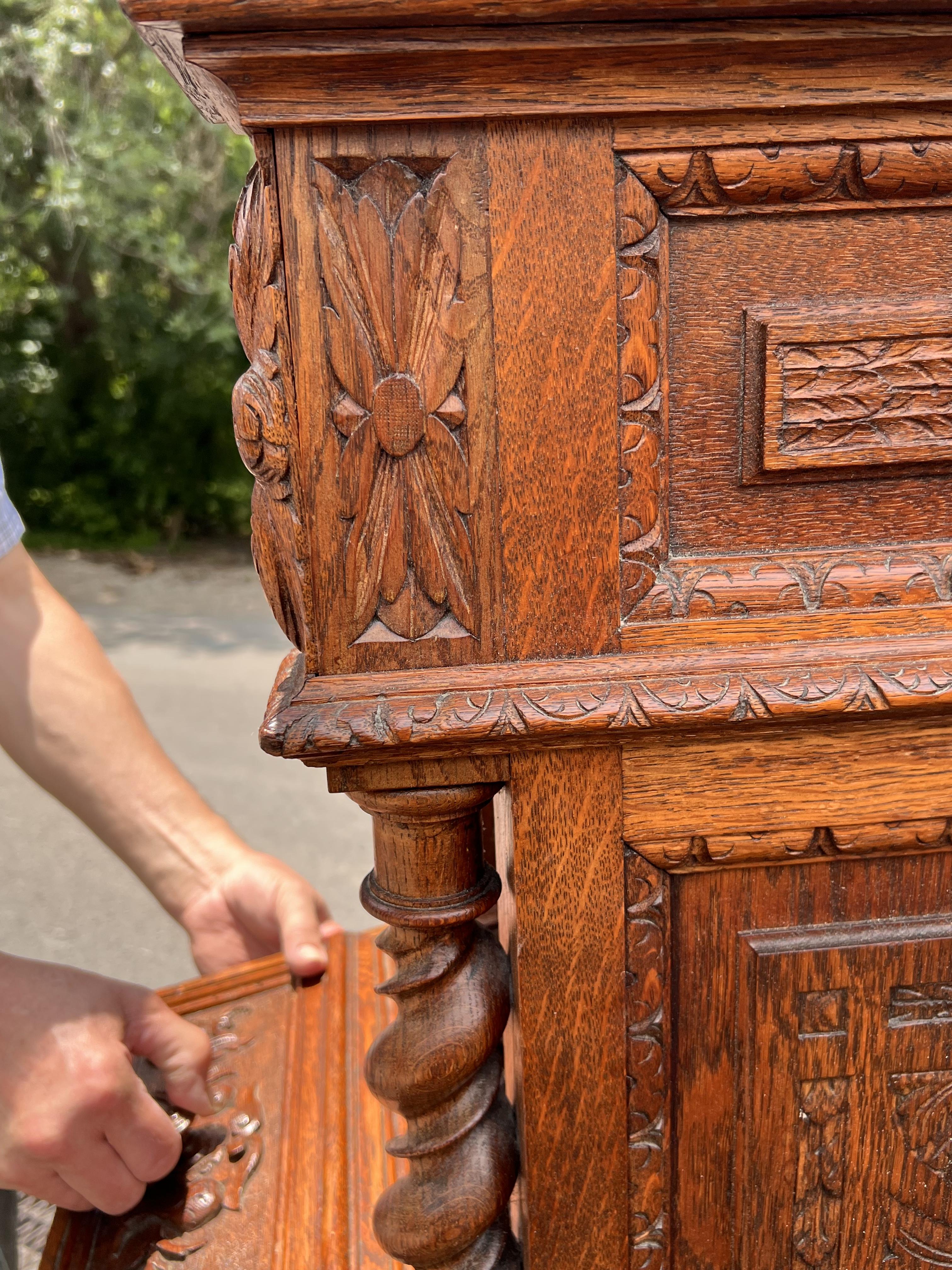 All hand built & elaborately 100% hand-carved cabinet with fitted marble top. Top drawer, then door two-drawers tall opens to shelf space, then 2 lower drawers. Definitely old, oak has darkened, never stained, surface seems to have only original old formula shellac.
