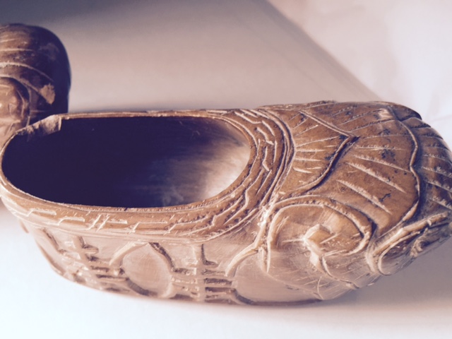 Given these unique 4 in carved shoes. No signature on them and can not find any information regarding origin.